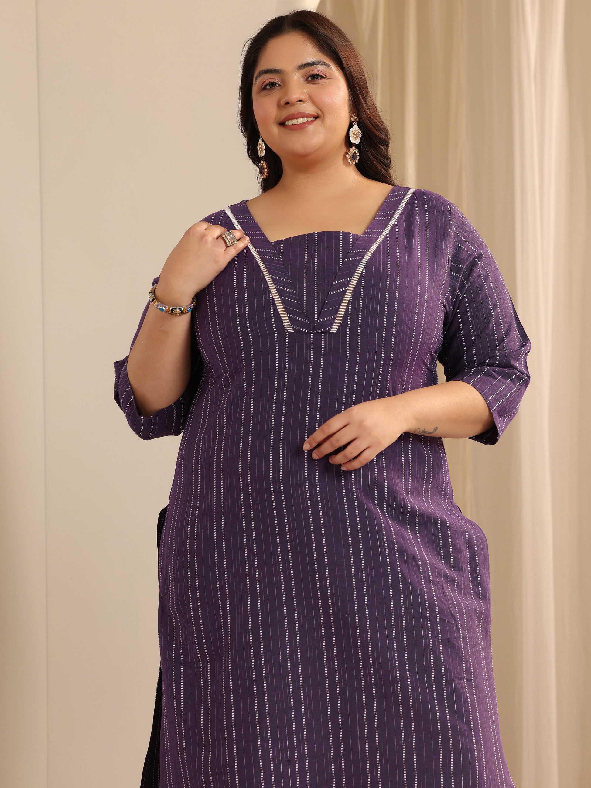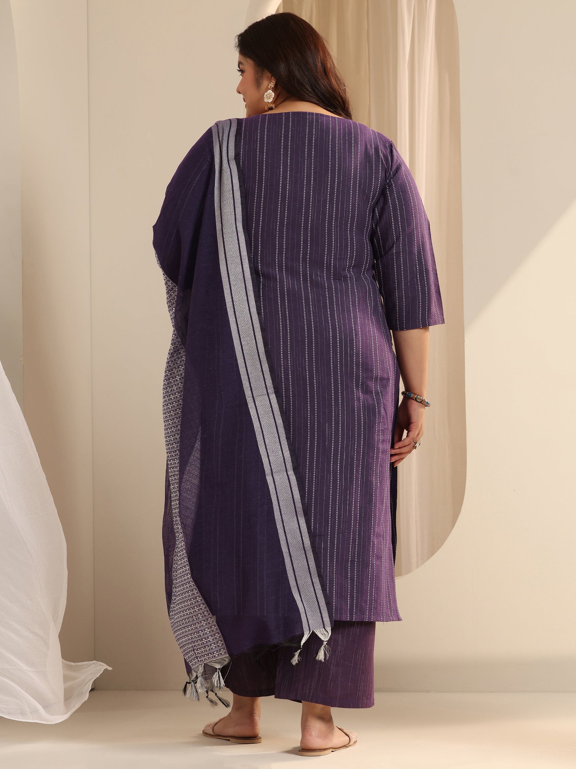 Plus Size Purple Woven Design Cotton Blend Straight Suit Set With Dupatta