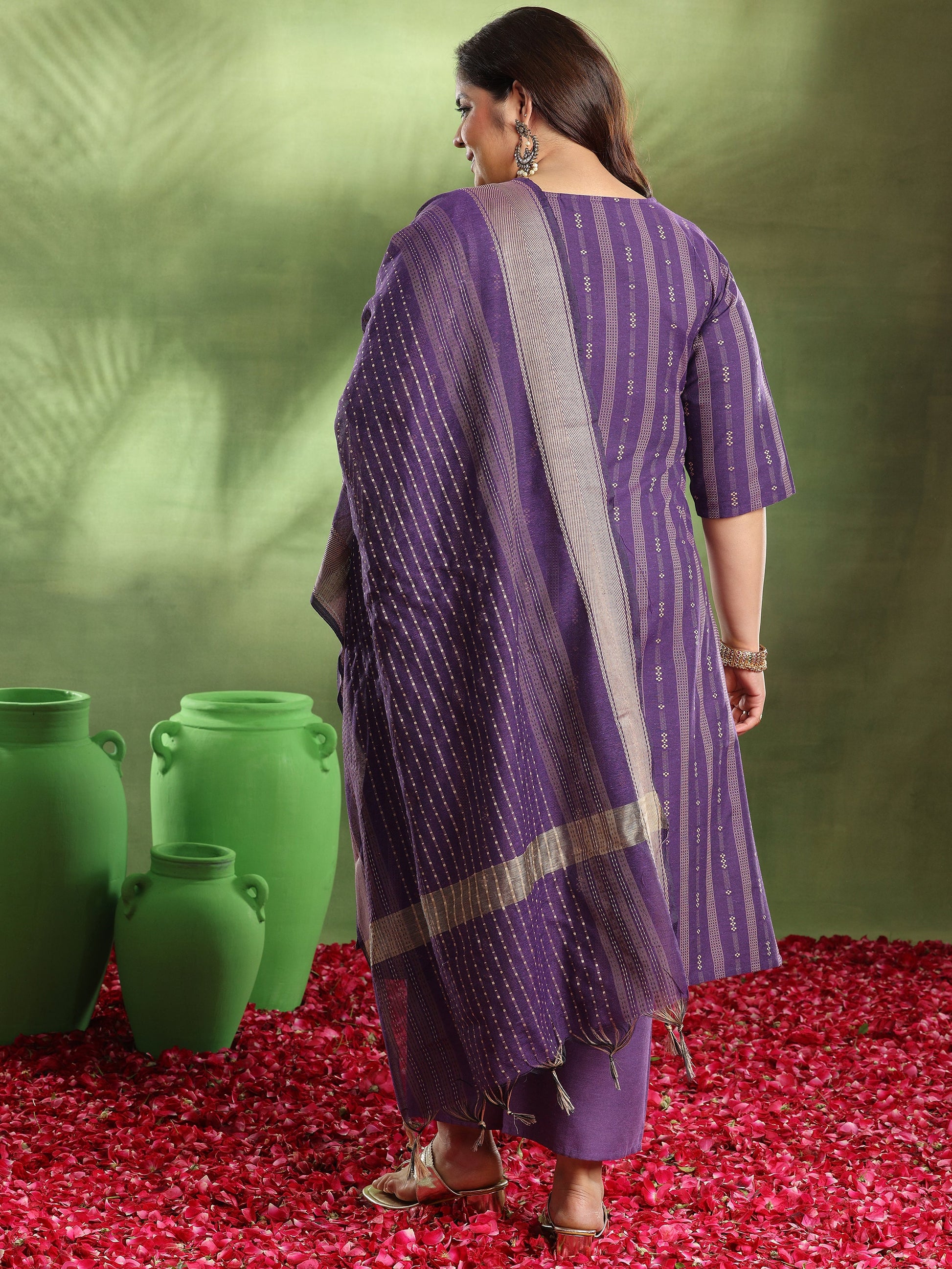 Plus Size Purple Woven Design Cotton Blend Straight Suit With Dupatta