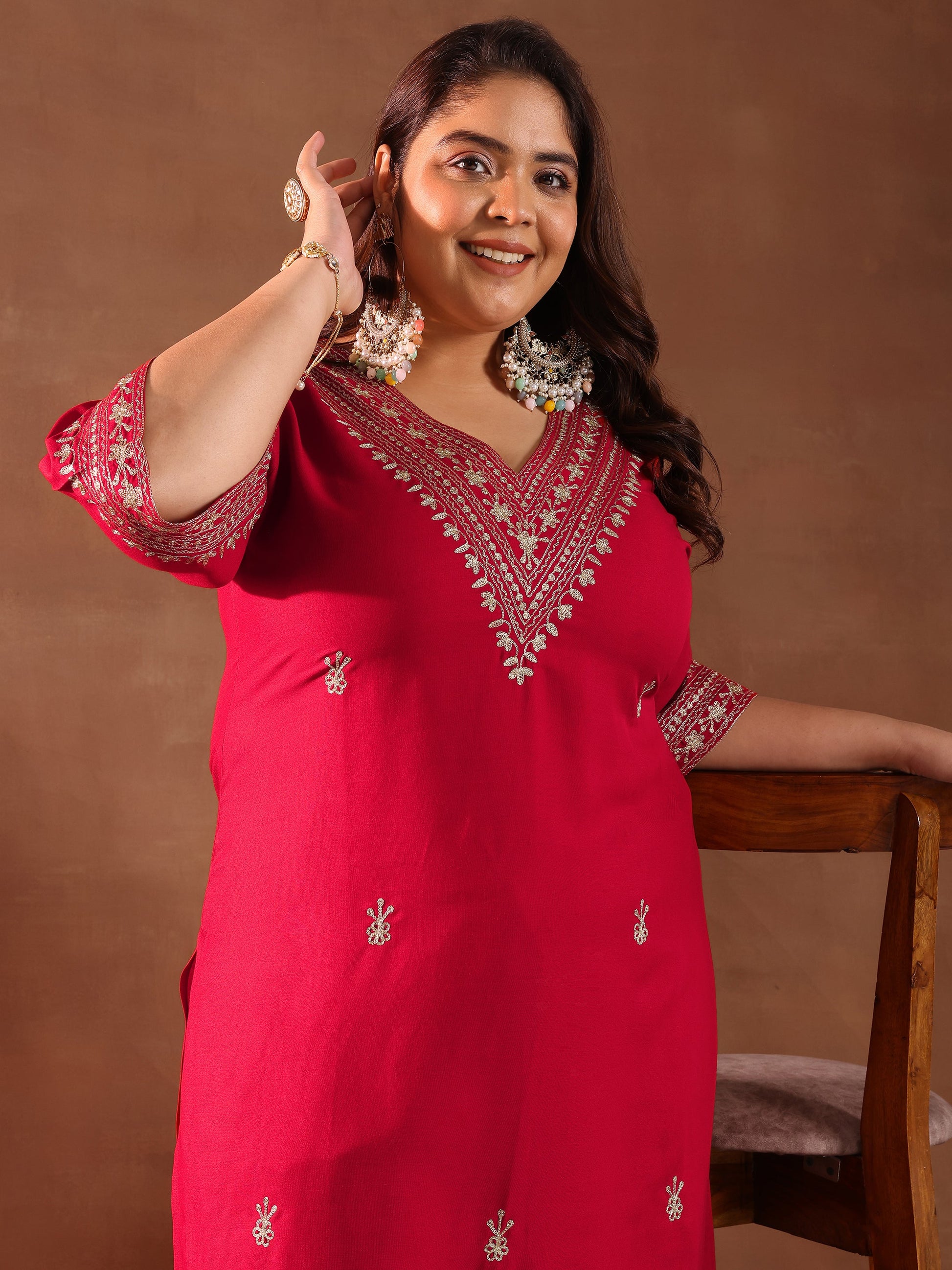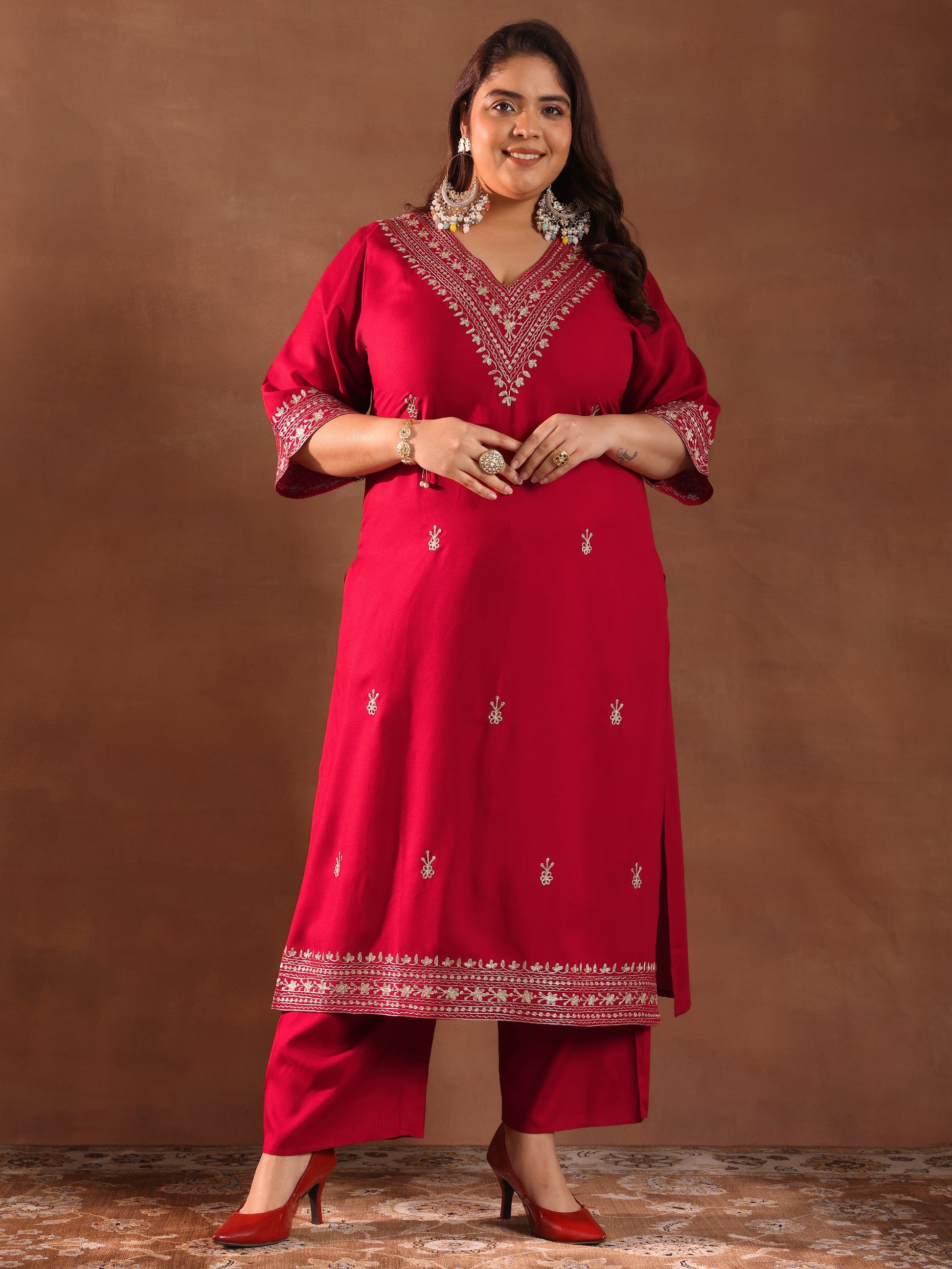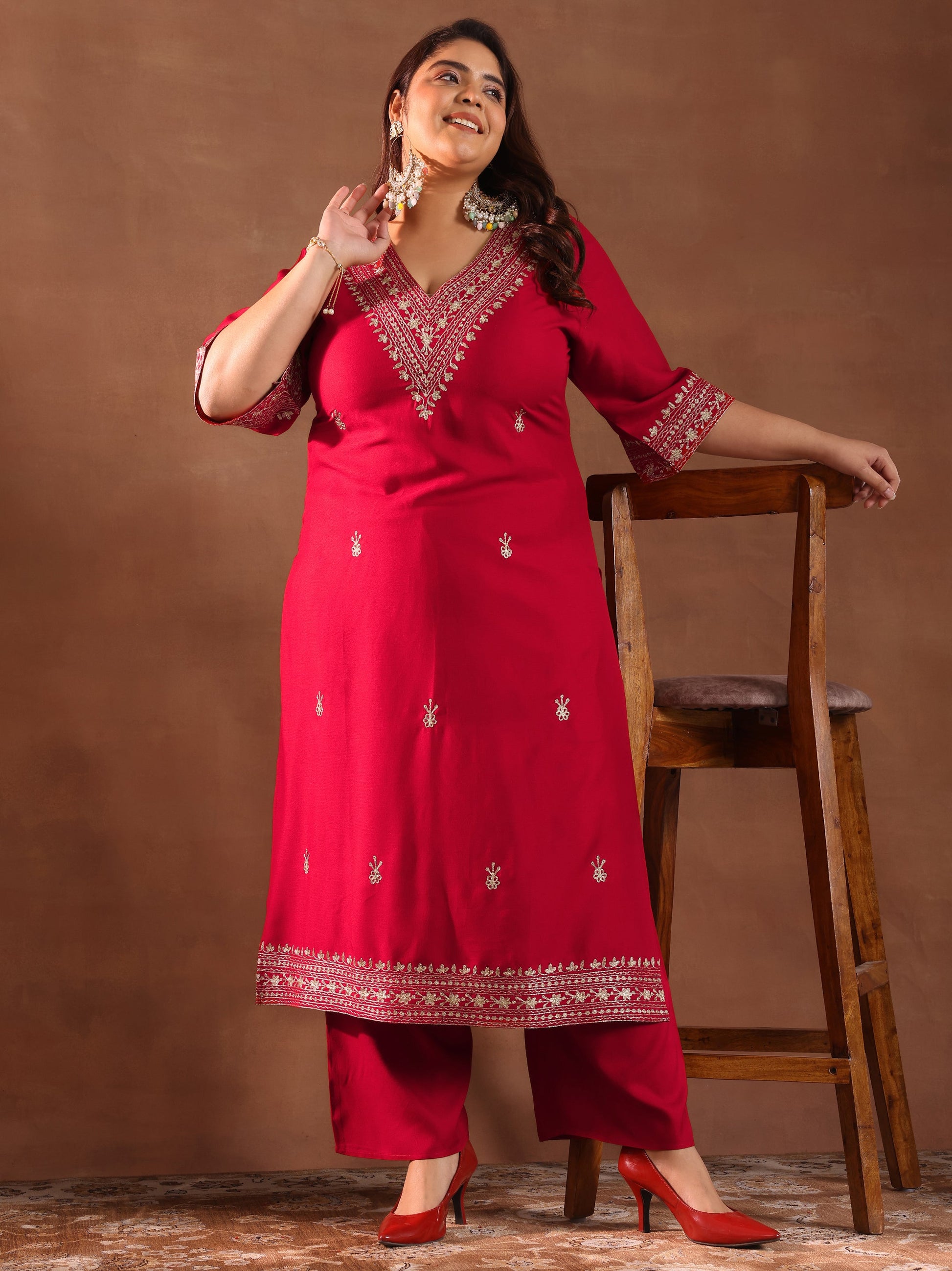 Plus Size Red Embroidered Rayon Straight Kurta Set