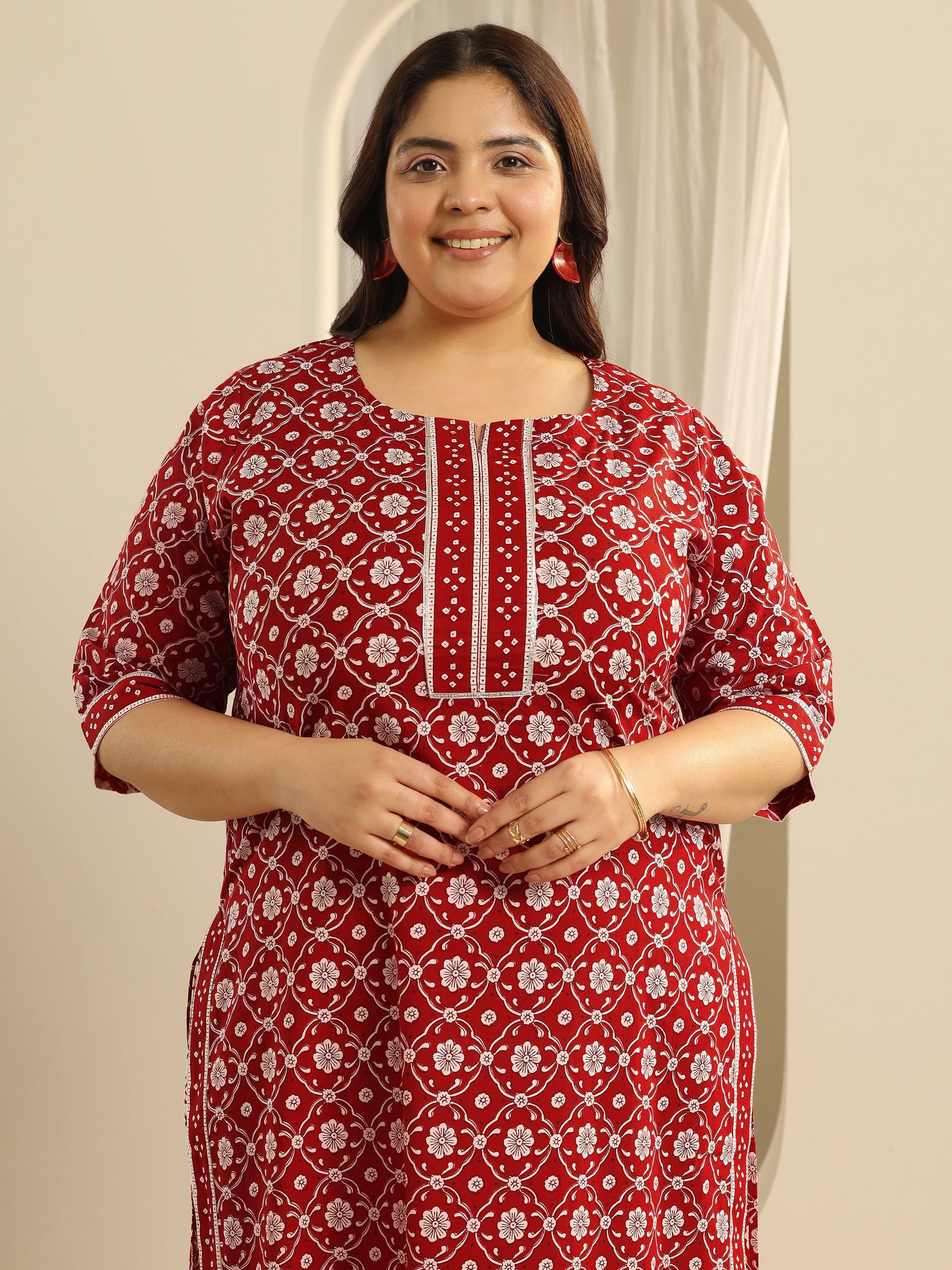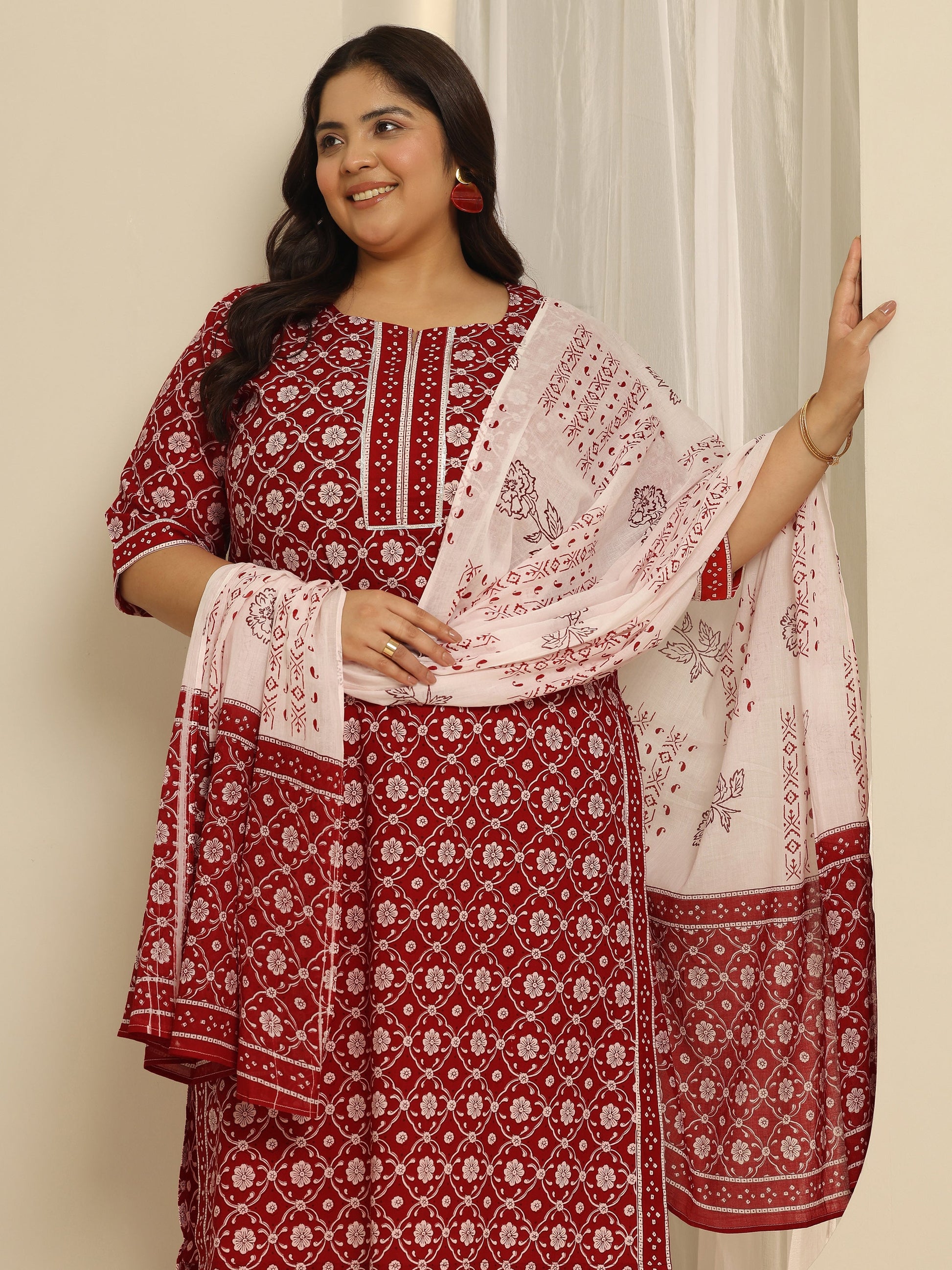 Plus Size Red Printed Cotton Straight Suit Set With Dupatta