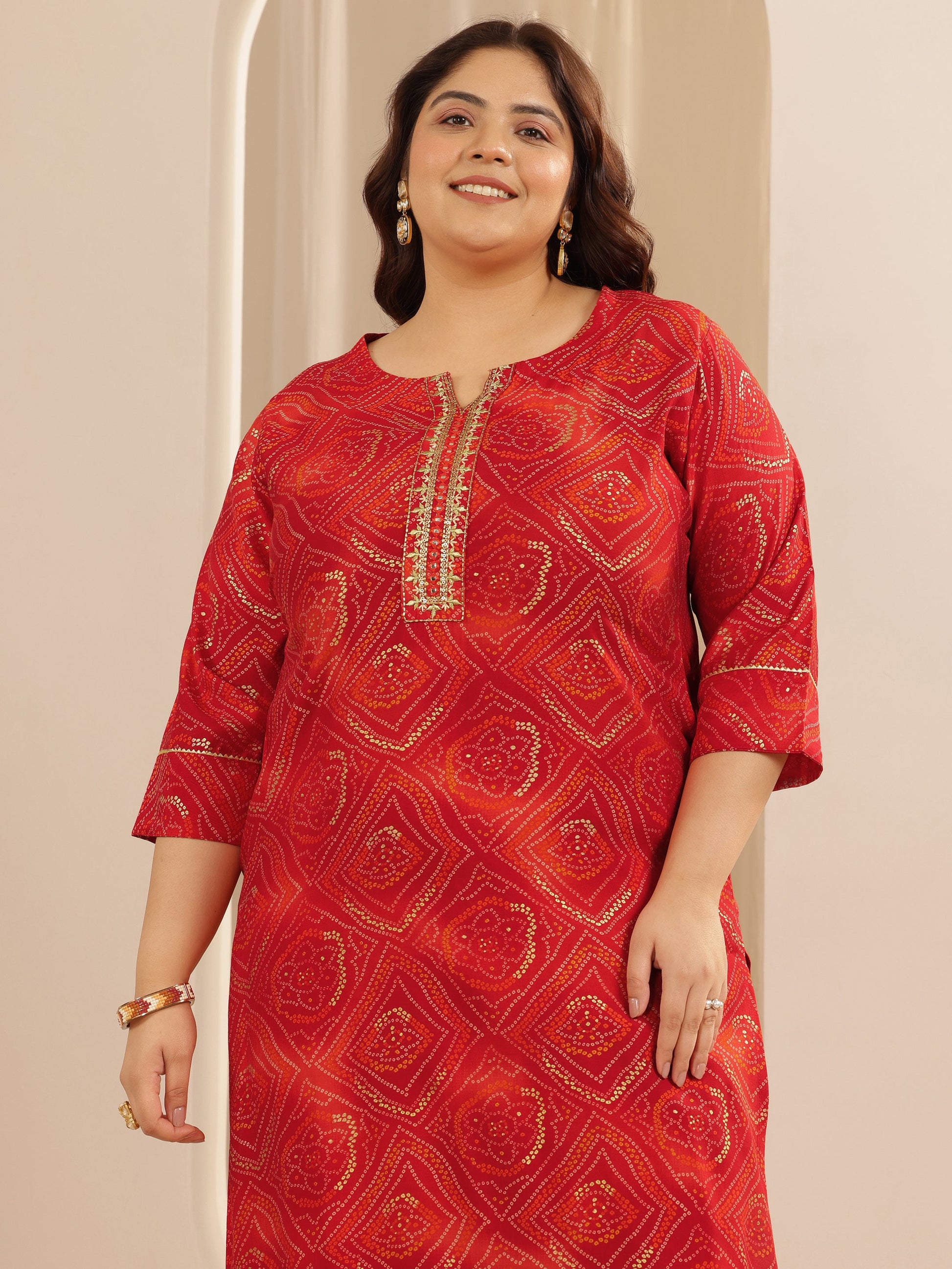 Libas Extra Love collection featuresOur signature designs in comfortable plus sizes.Our 3-piece red cotton straight-fit kurta set features a round neckline, regular sleeves. Complemented with straight pants with a partially elasticated waistband and 2 pockets, and a printed dupatta. Adorned with Bandhani printed motifs, this style is perfect for festive wear.