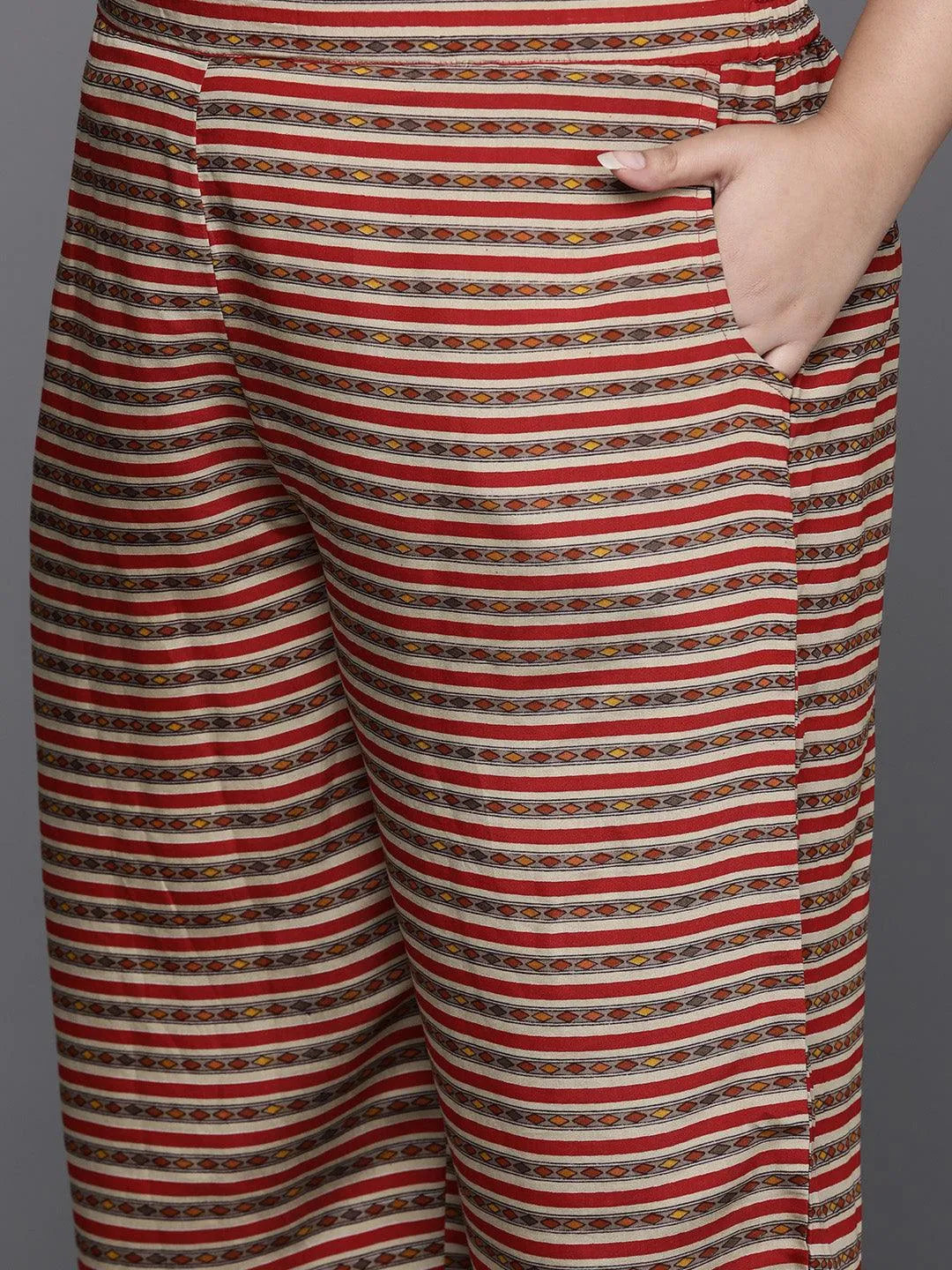 Plus Size Red Yoke Design Silk Blend Straight Suit With Dupatta