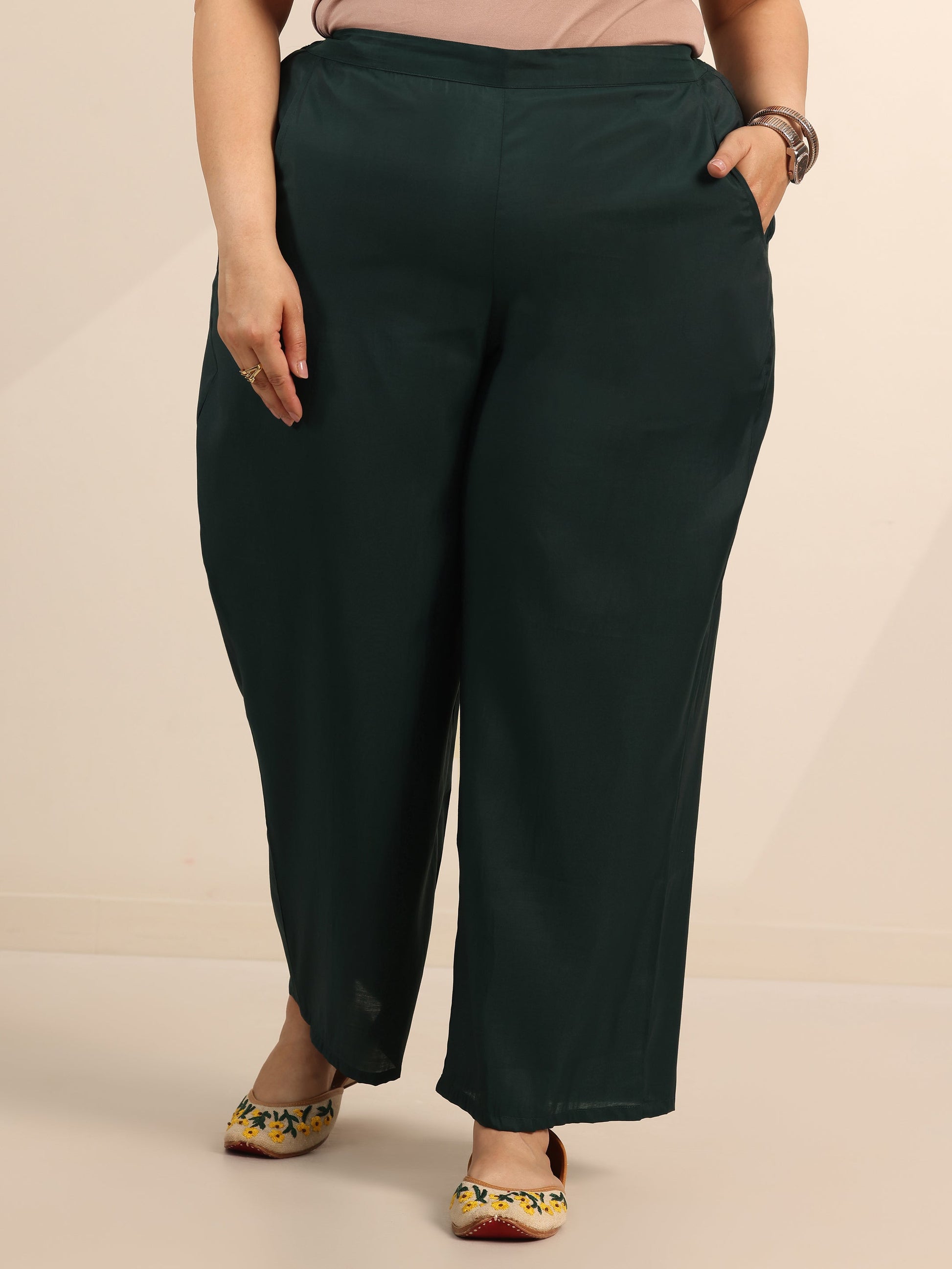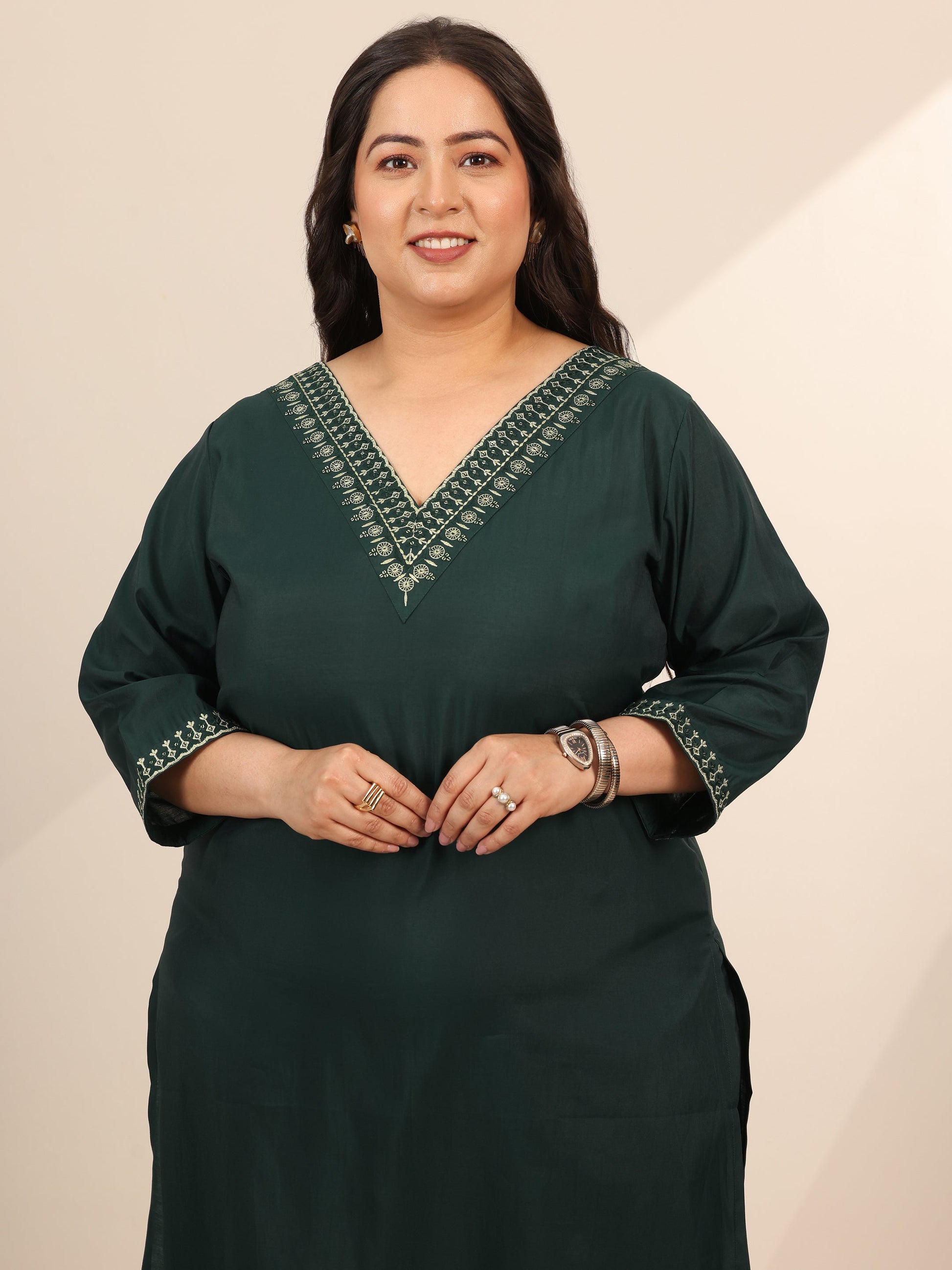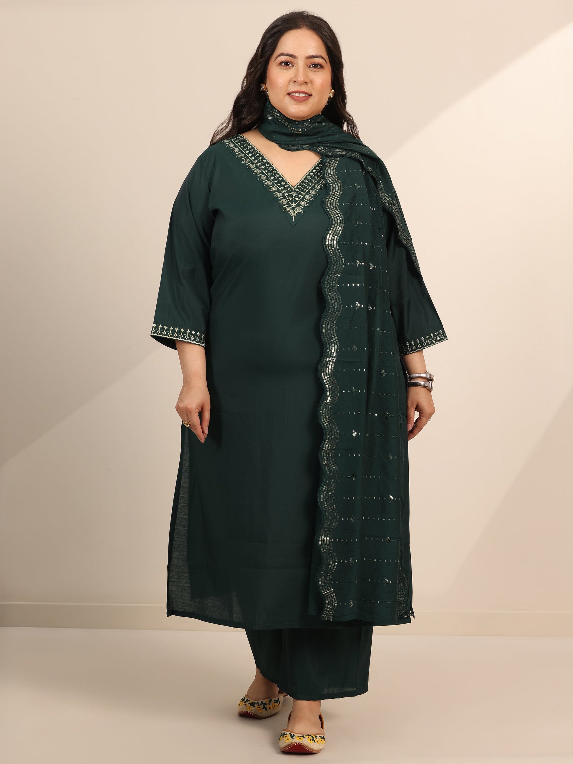 Libas Extra Love collection features our signature designs in comfortable plus sizes. Our 3-piece Green Silk Blend Straight-fit Kurta Set features a V-neckline, Regular Sleeves, and statement Yoke Design. Complemented with Straight Pants with an Elasticated waistband and 2 pockets, and an Embroidered dupatta. Adorned with Embroidered accents, this style is perfect for Dark Festive occasions.