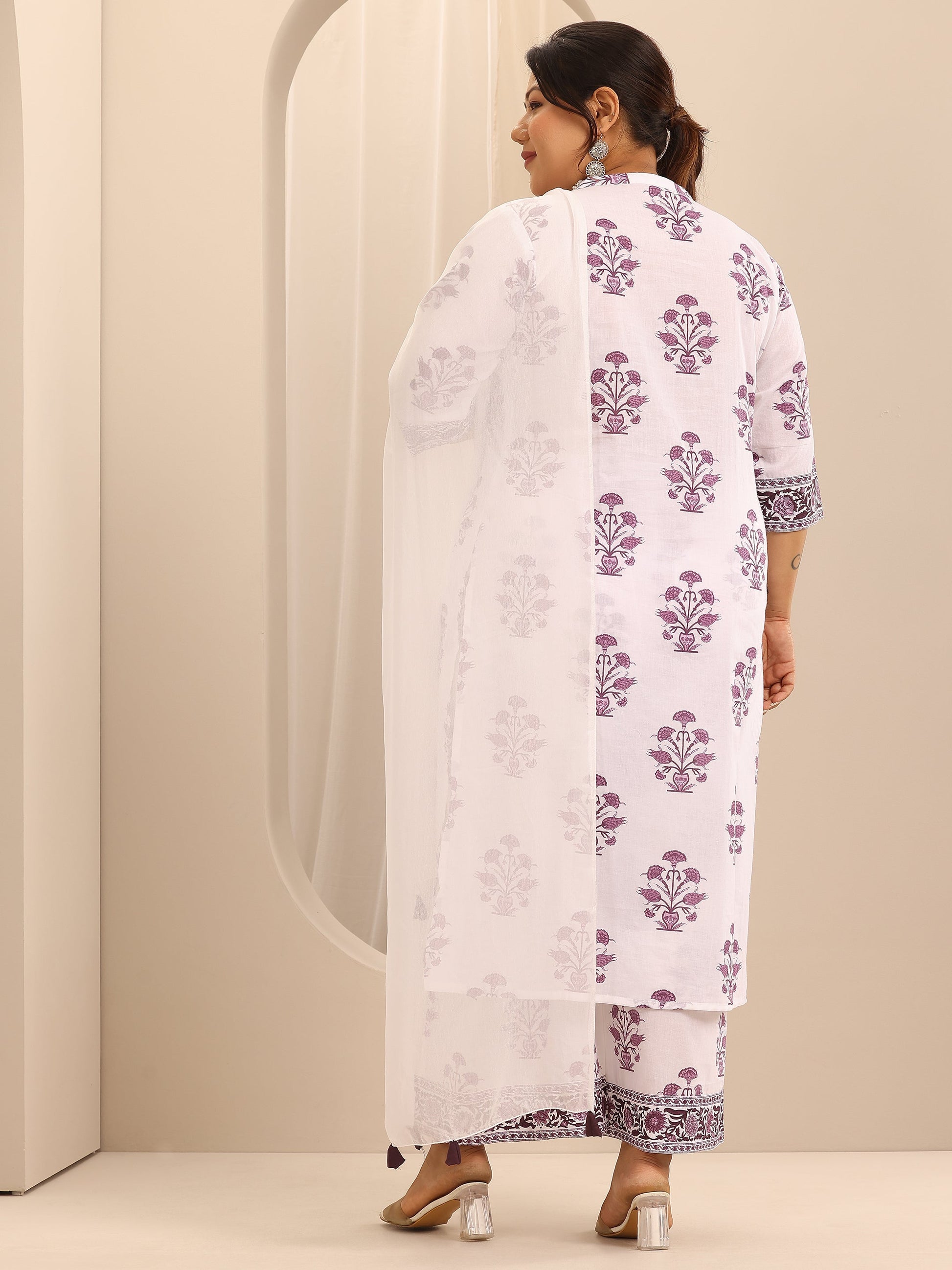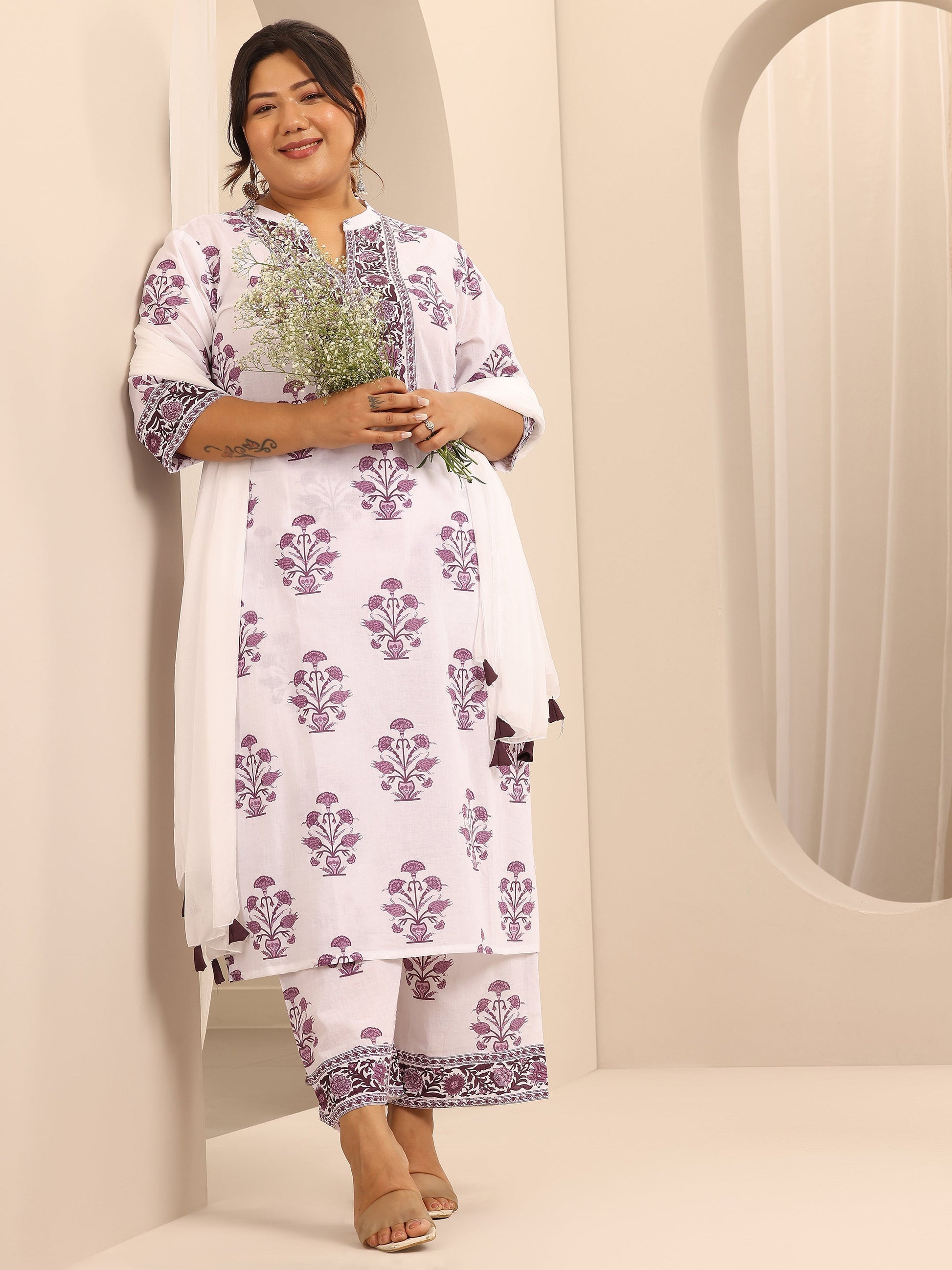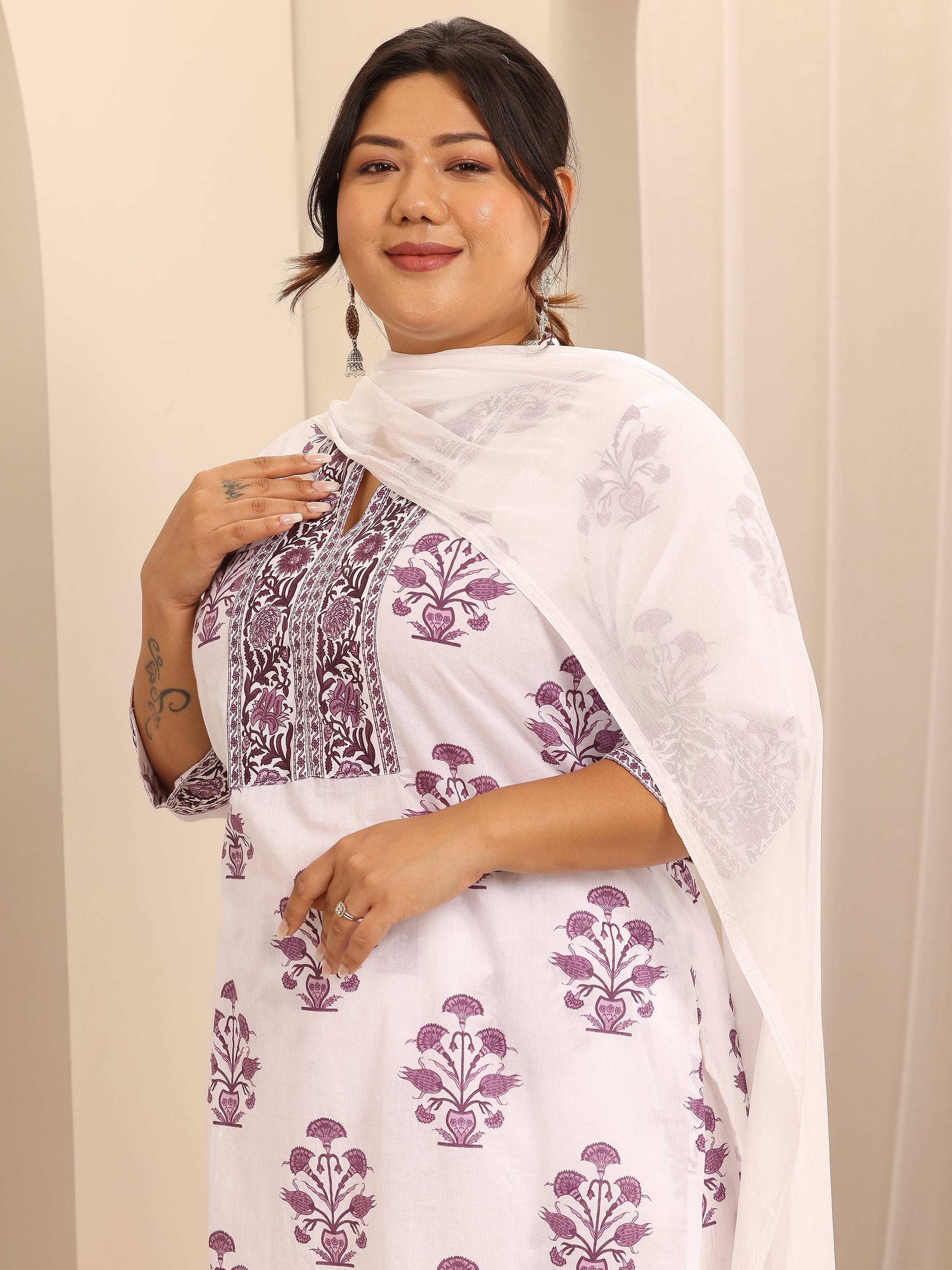 Plus Size White Printed Cotton Straight Suit Set With Dupatta