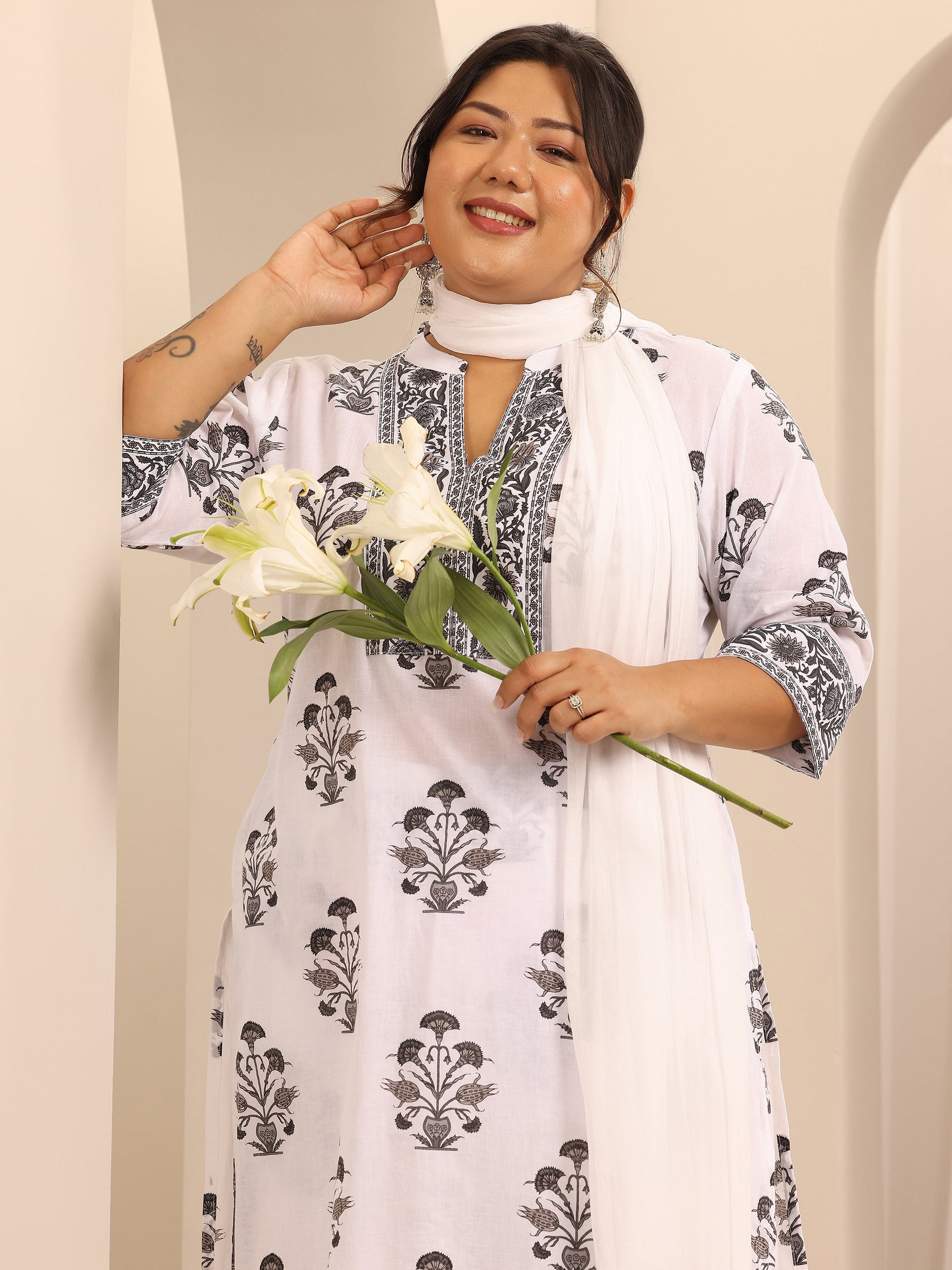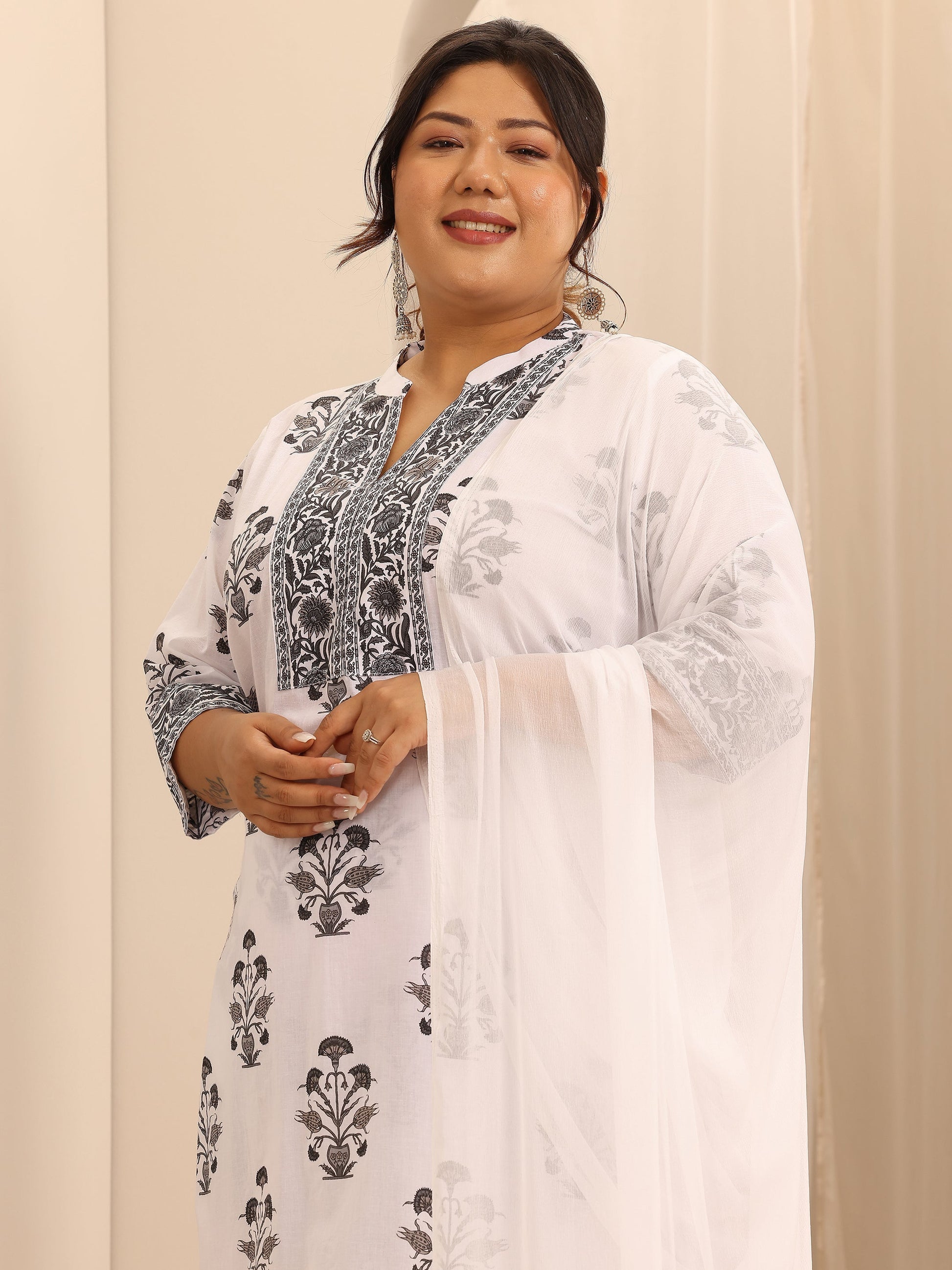 Plus Size White Printed Cotton Straight Suit Set With Dupatta