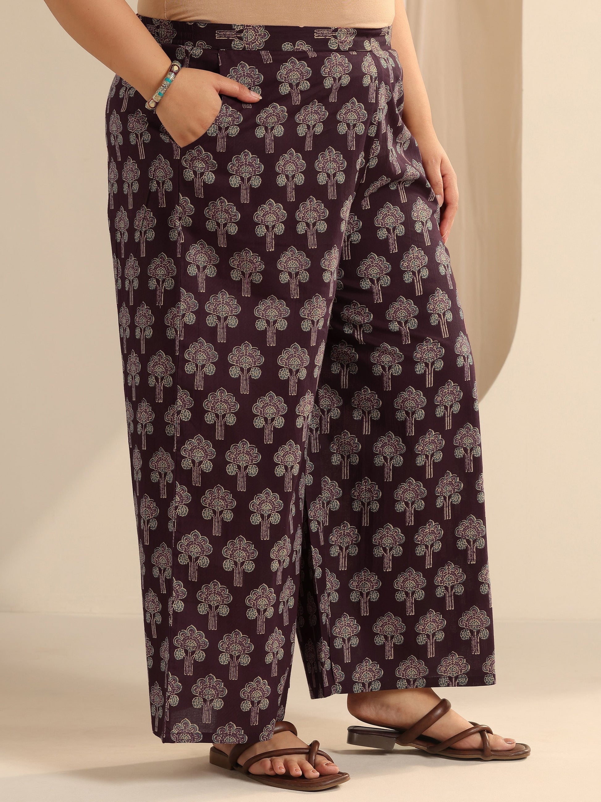 Plus Size Wine Printed Cotton Straight Kurta Set
