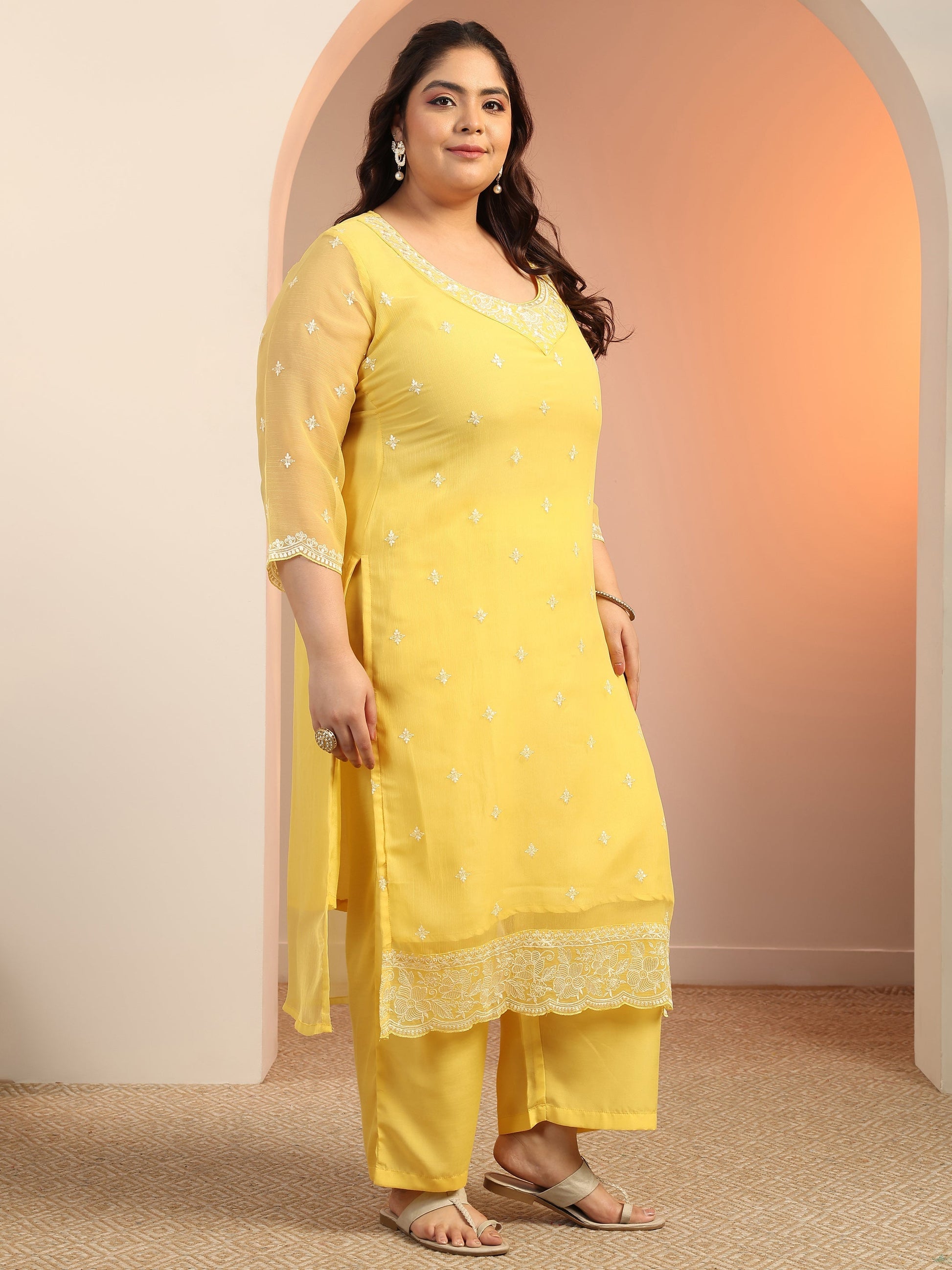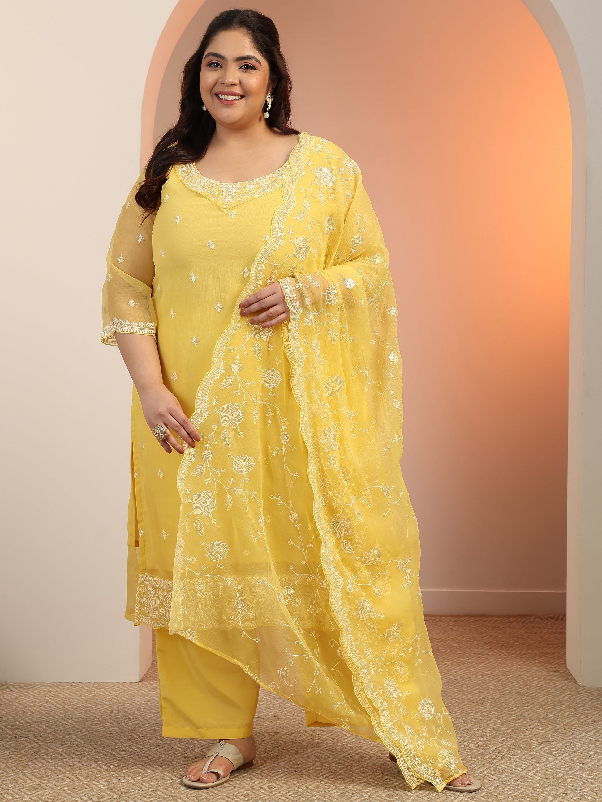 Plus Size Yellow Embroidered Chiffon Straight Suit Set With Dupatta