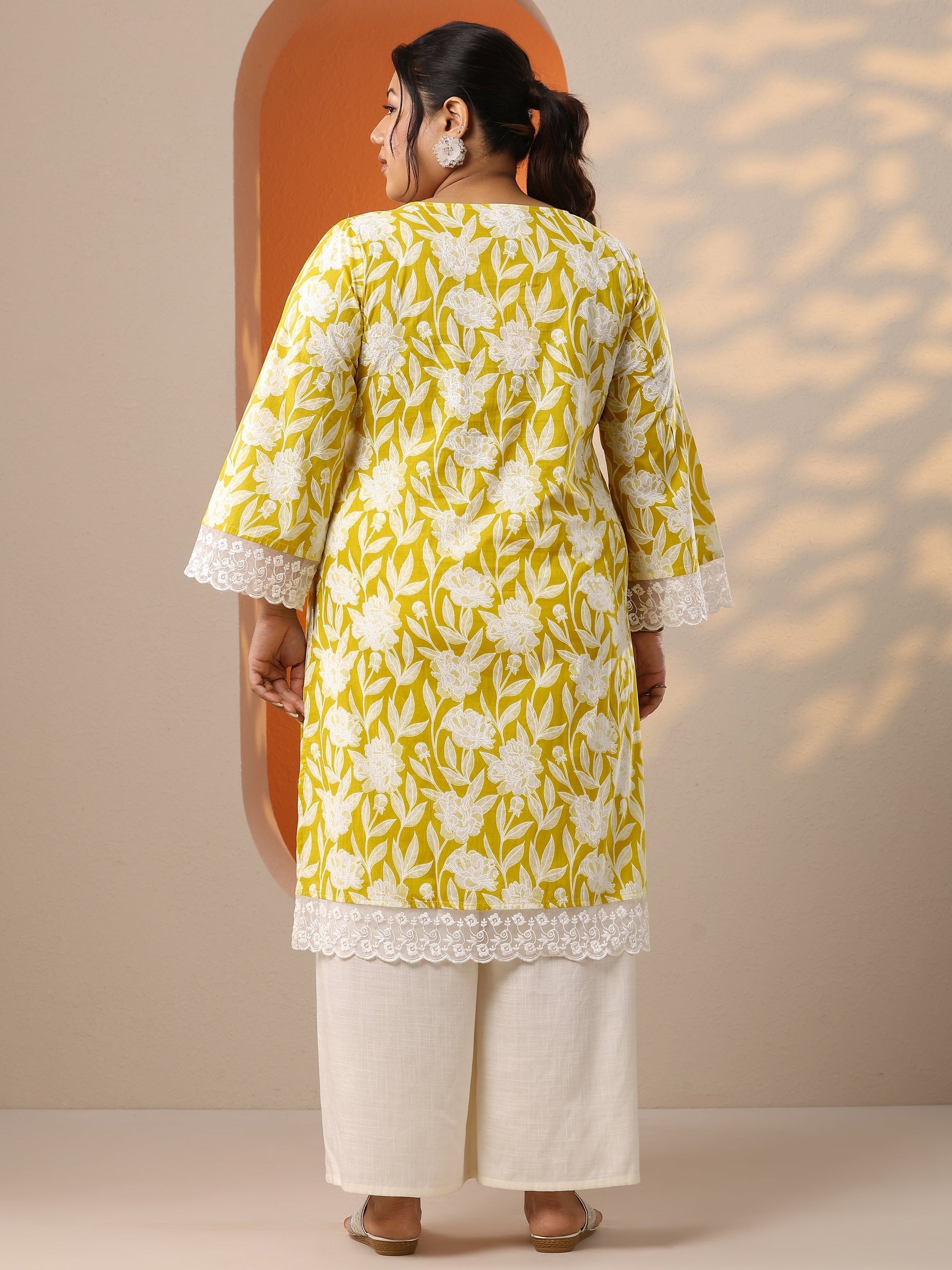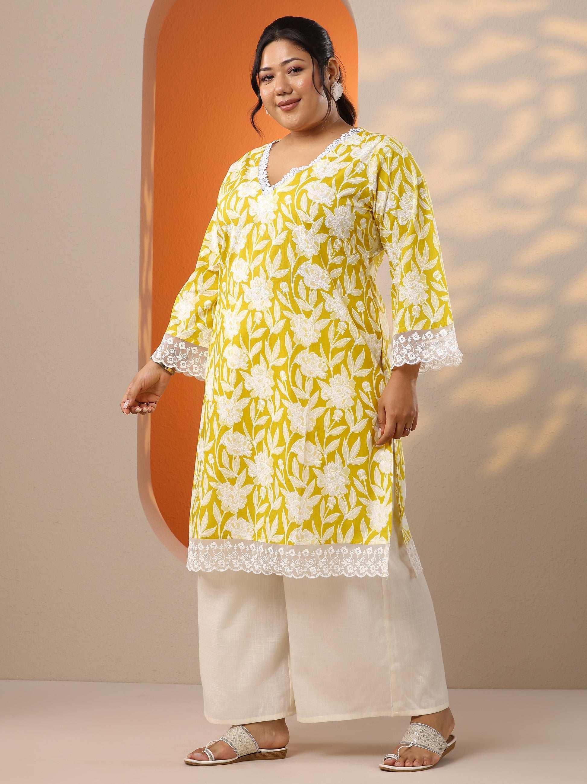 Our 1-piece yellow cotton straight-fit kurta features a V-neckline, regular sleeves, and statement Yoke. Adorned with top print, this style is perfect for festive occasions.