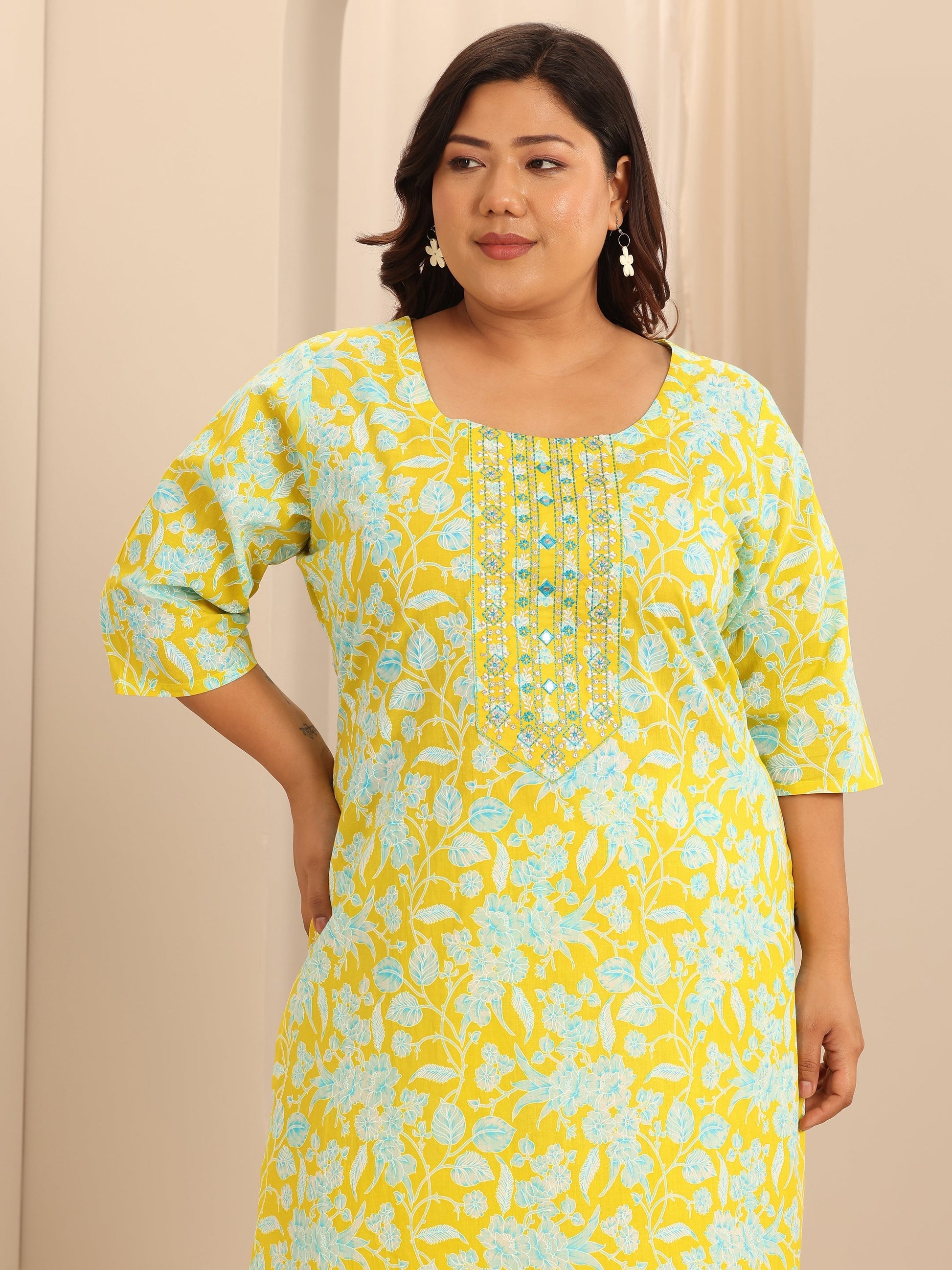 Plus Size Yellow Printed Cotton Straight Suit Set With Dupatta