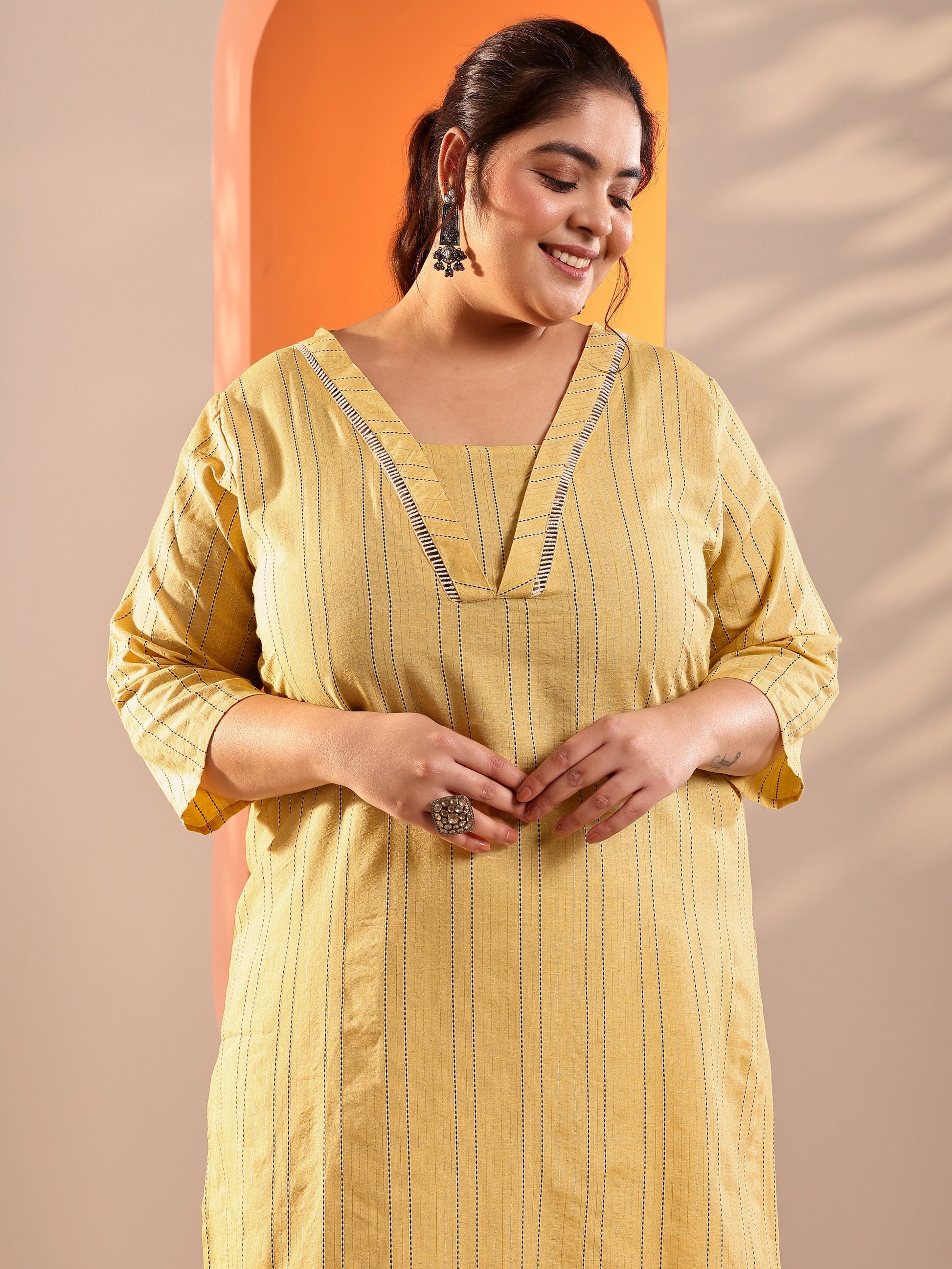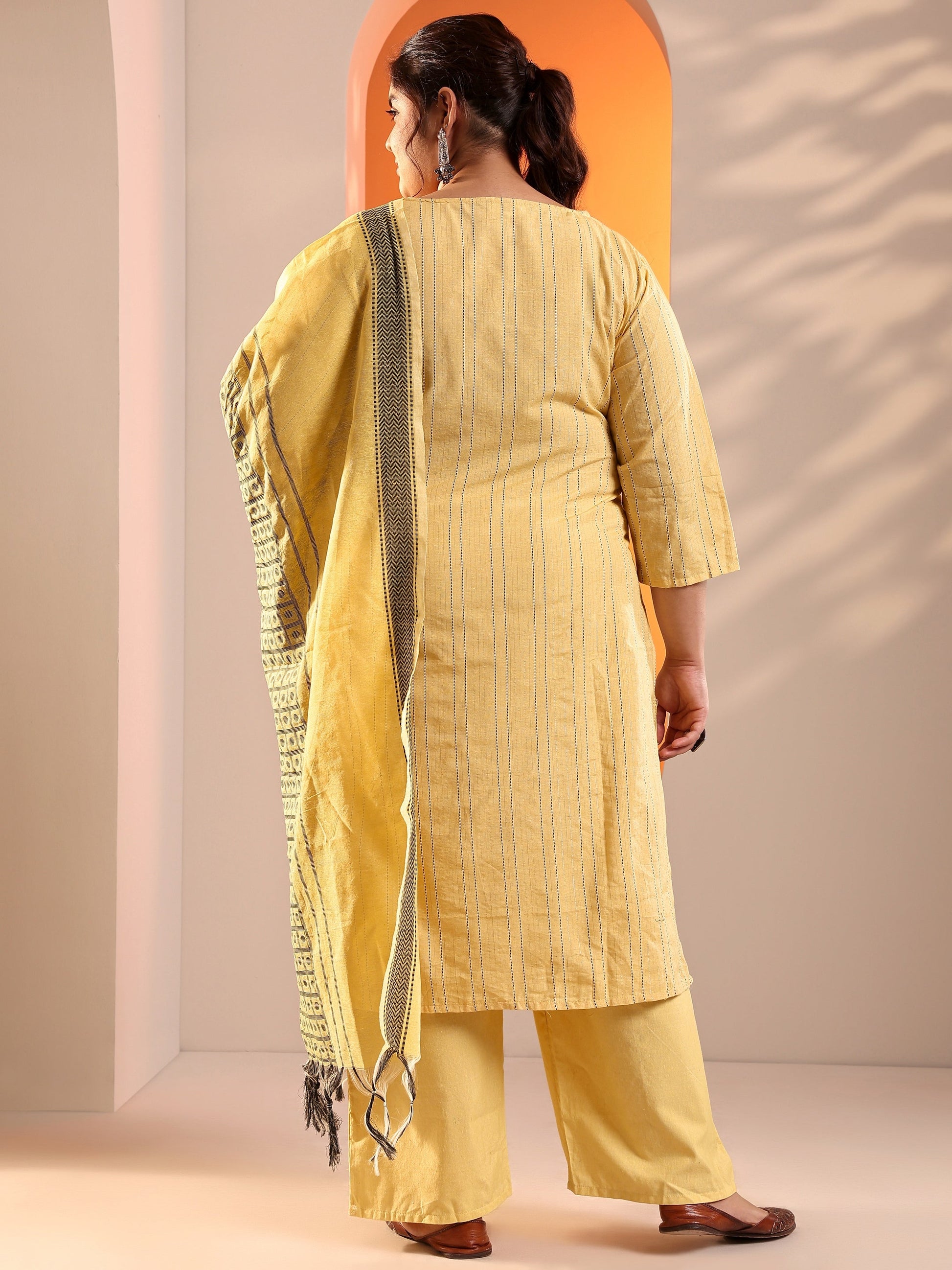 Plus Size Yellow Woven Design Cotton Blend Straight Suit Set With Dupatta