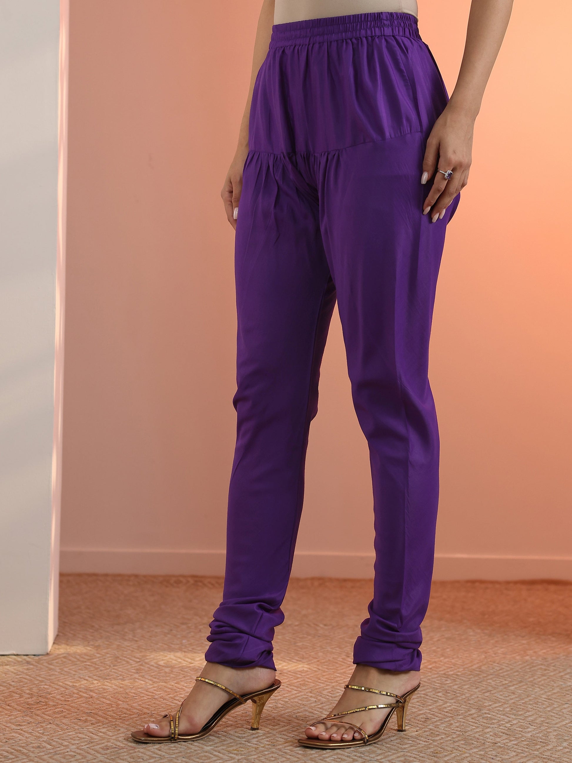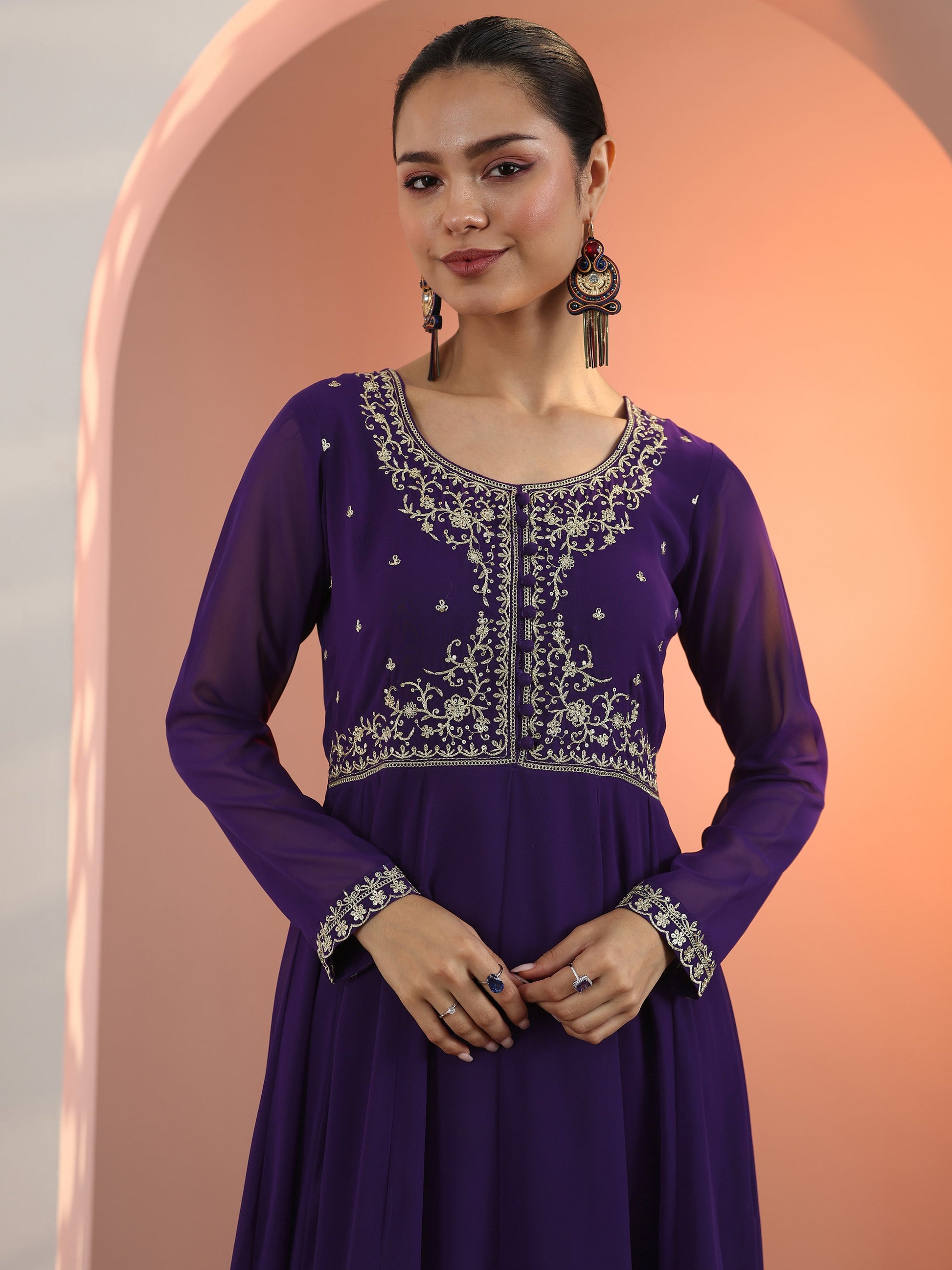 Our 3-piece purple georgette Anarkali kurta set features a round neckline, comfortable full sleeves, and a statement yoke. Complemented with lining and salwar pants with a partially elasticated waistband, and an embroidered dupatta. Adorned with zari embellished accents, this style is perfect for festive wear.