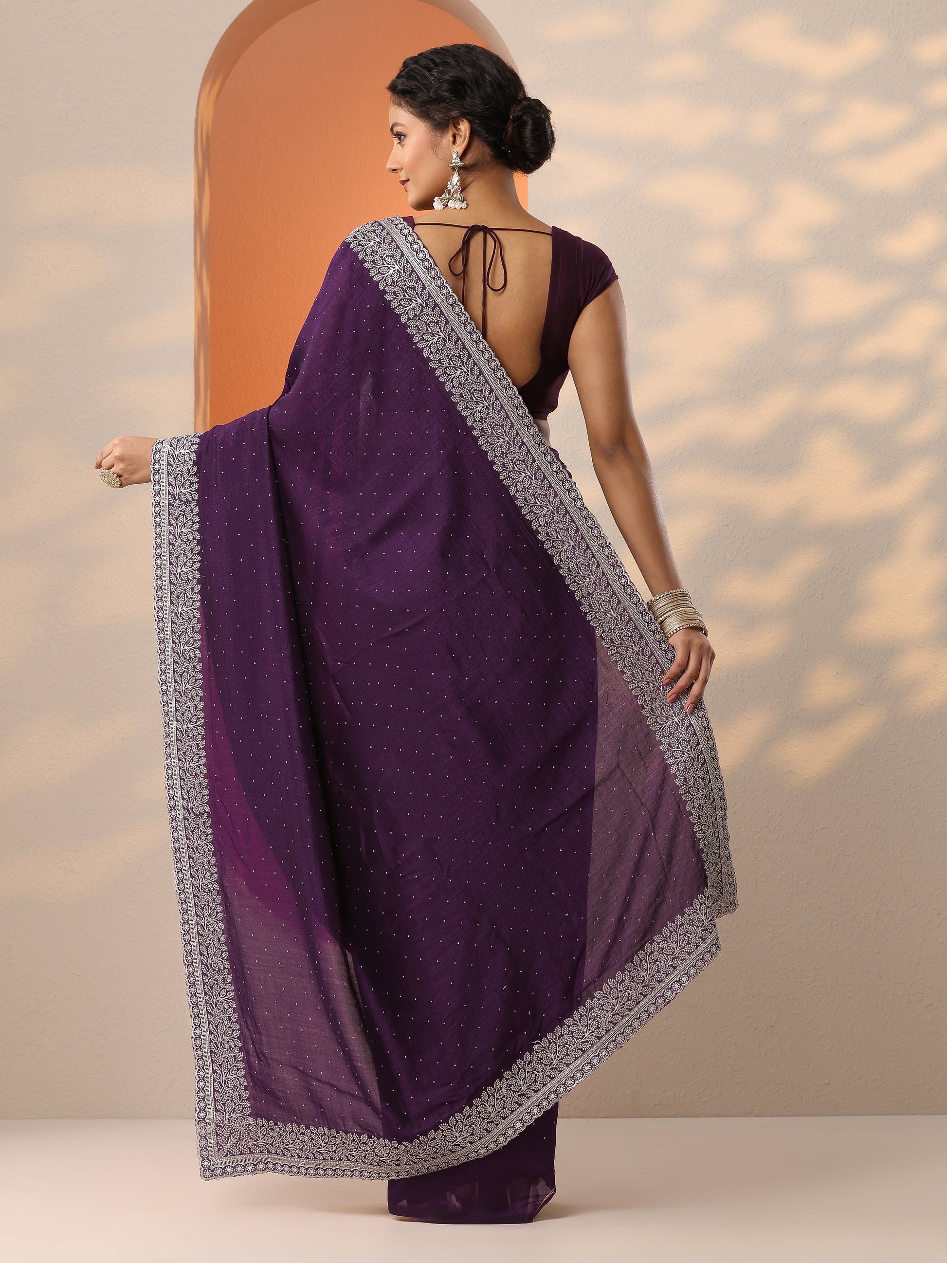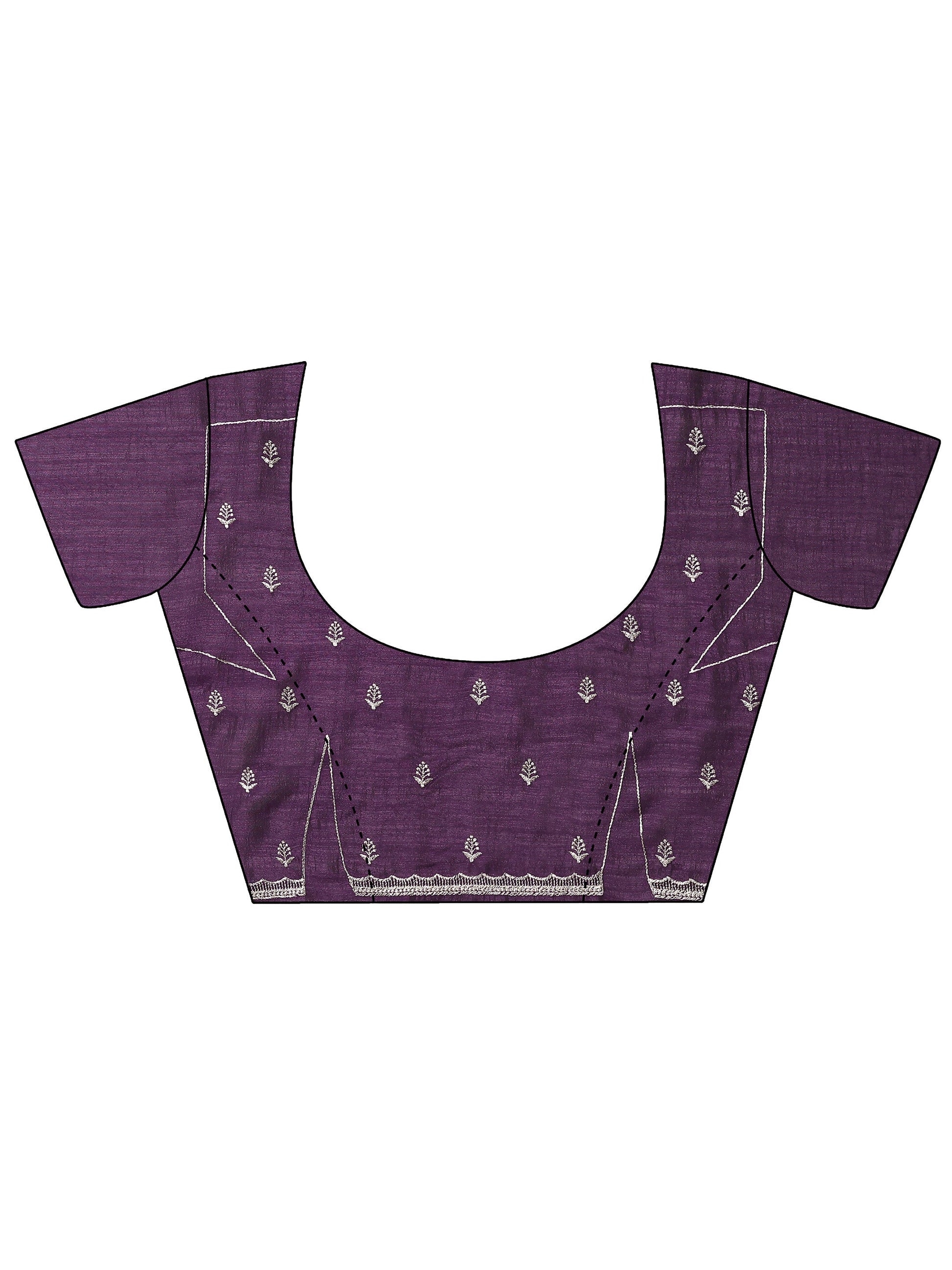 Our purple printed silk blend saree features captivating embellishments. Complemented with a stitched blouse. This charming saree is perfect for festive occasions.
