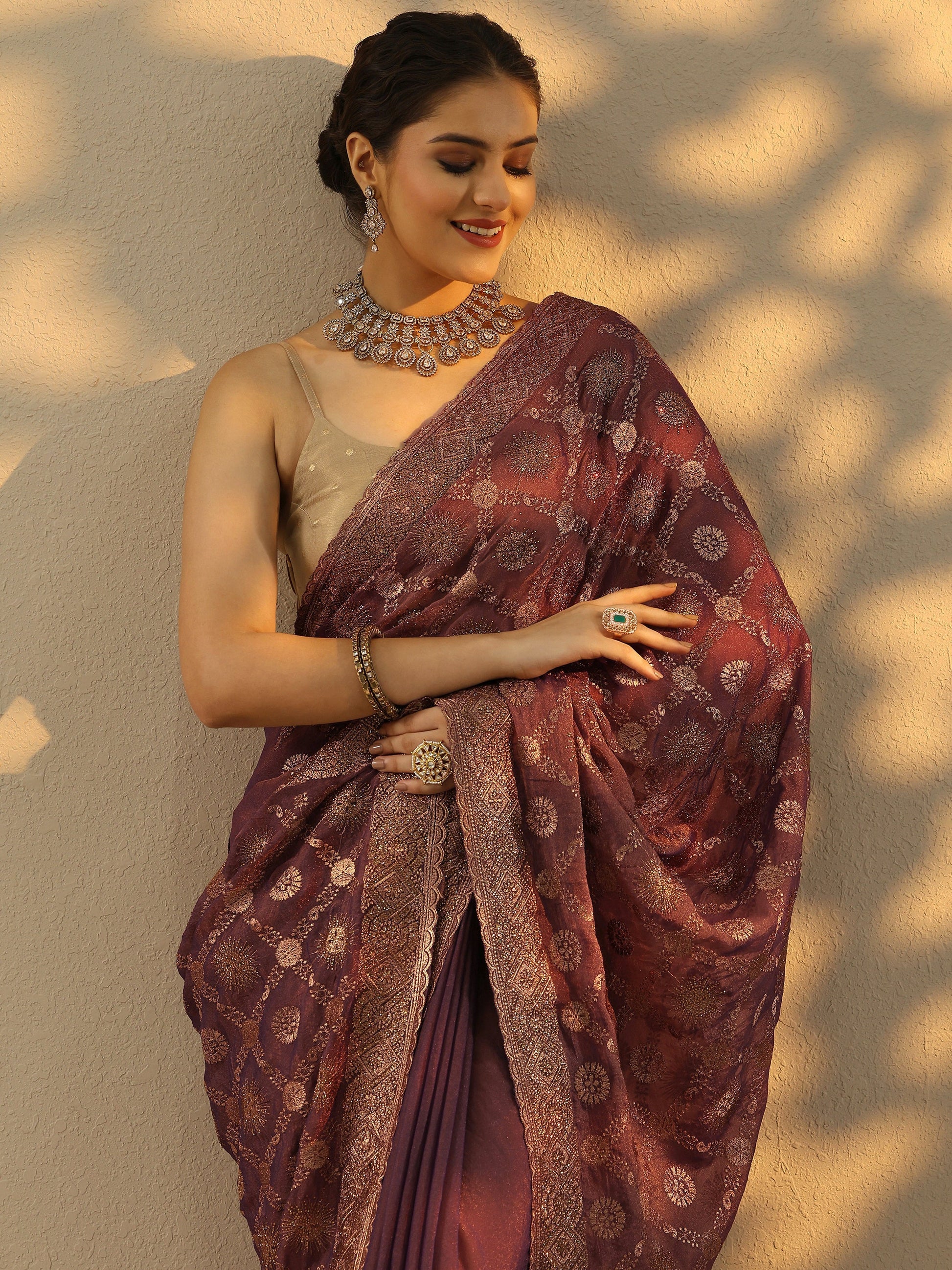 Our Burgundy Printed Silk Blend Saree Features Captivating Embellishments. Complemented With An Unstitched Blouse Piece. This Charming Saree Is Perfect For Festive Occasions