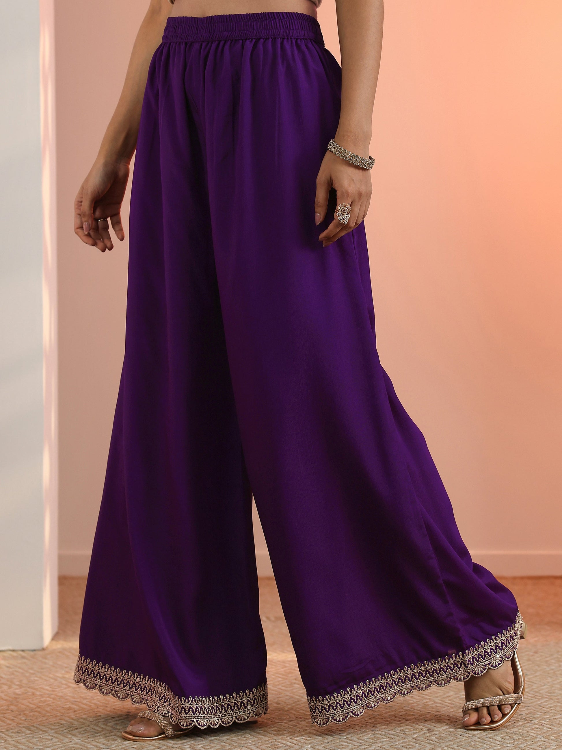 Our 3-piece purple Chinon straight-fit kurta set features a round neckline, regular sleeves, and statement yoke. Complemented with lining and palazzo pants with a partially elasticated waistband and 2 pockets, and a printed dupatta. Adorned with floral zari embroidered accents, this style is perfect for festive wear.