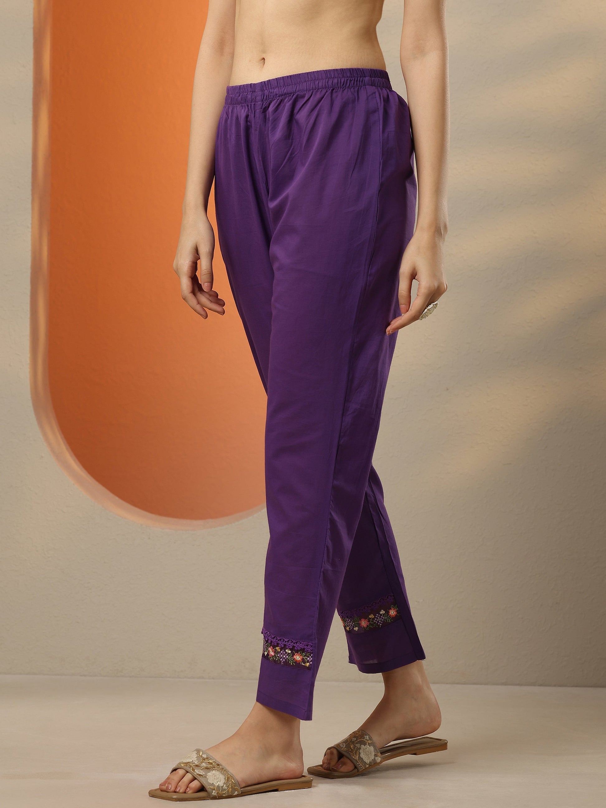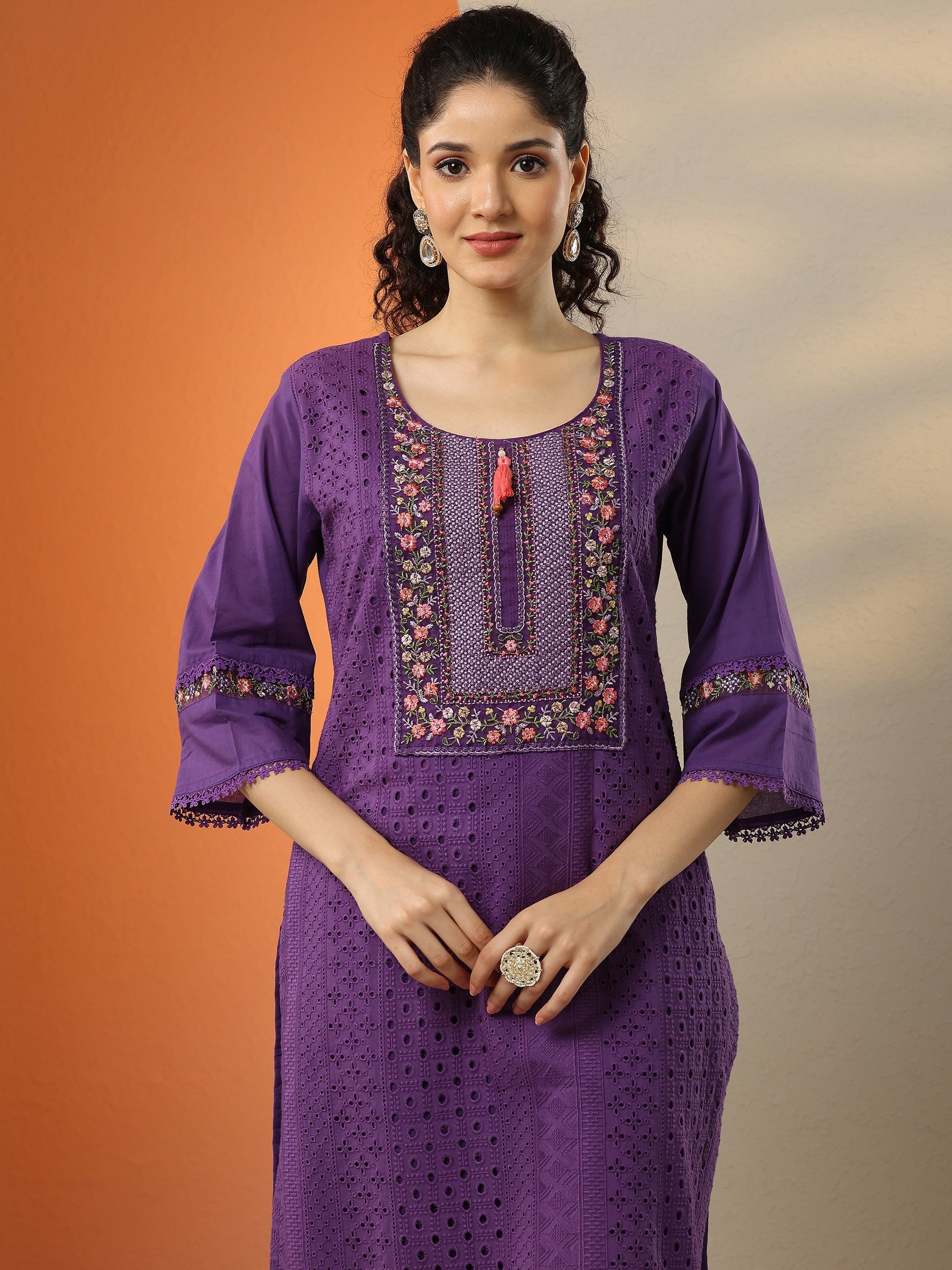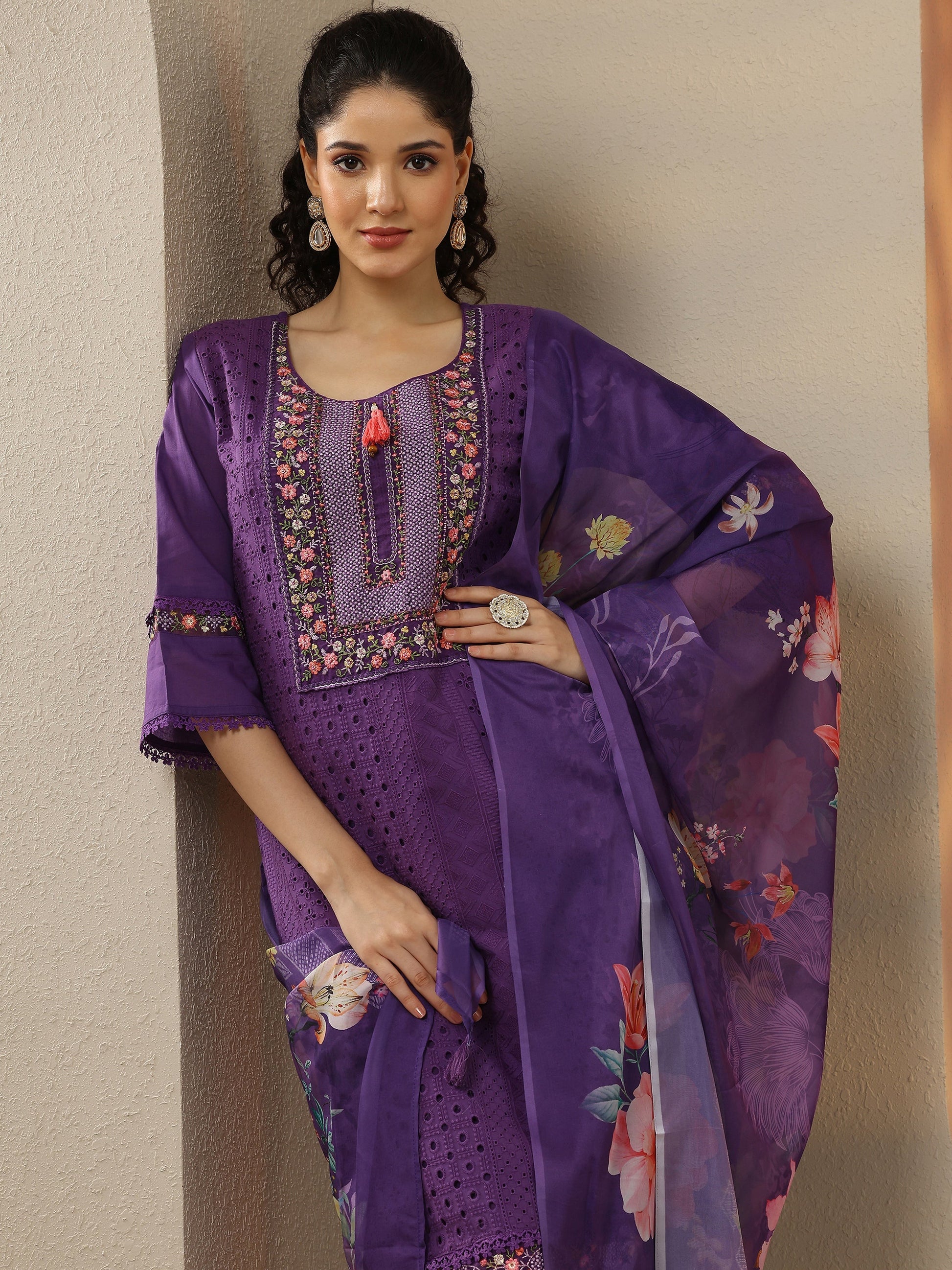 Purple Embroidered Cotton Straight Suit Set With Dupatta