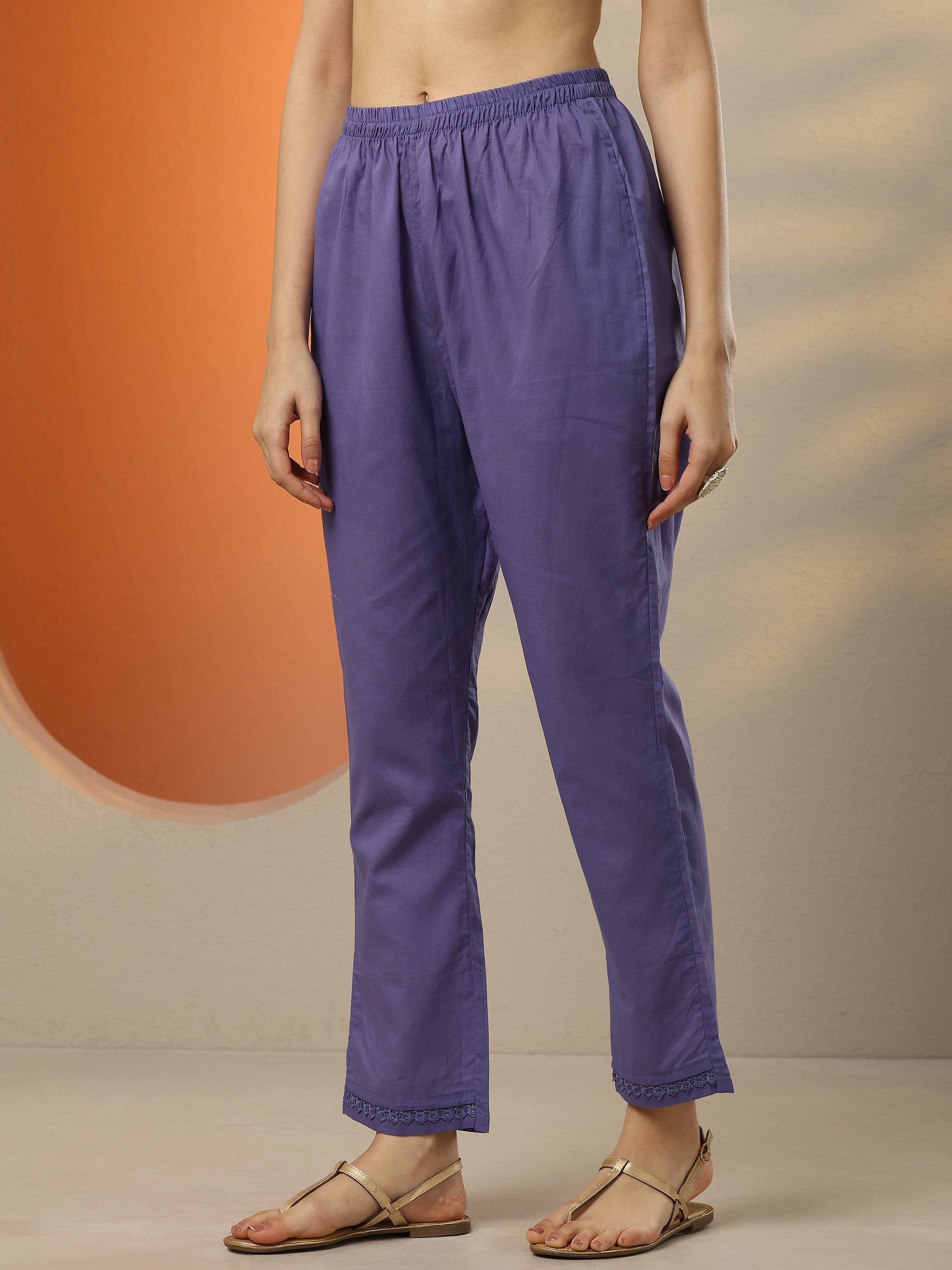 Our 3-piece purple cotton straight-fit kurta set features a round neckline, regular sleeves, and a statement yoke. Complemented with straight pants with a partially elasticated waistband and 2 pockets, and a printed dupatta. Adorned with Floral Embroidered, this style is perfect for festive occasions.
