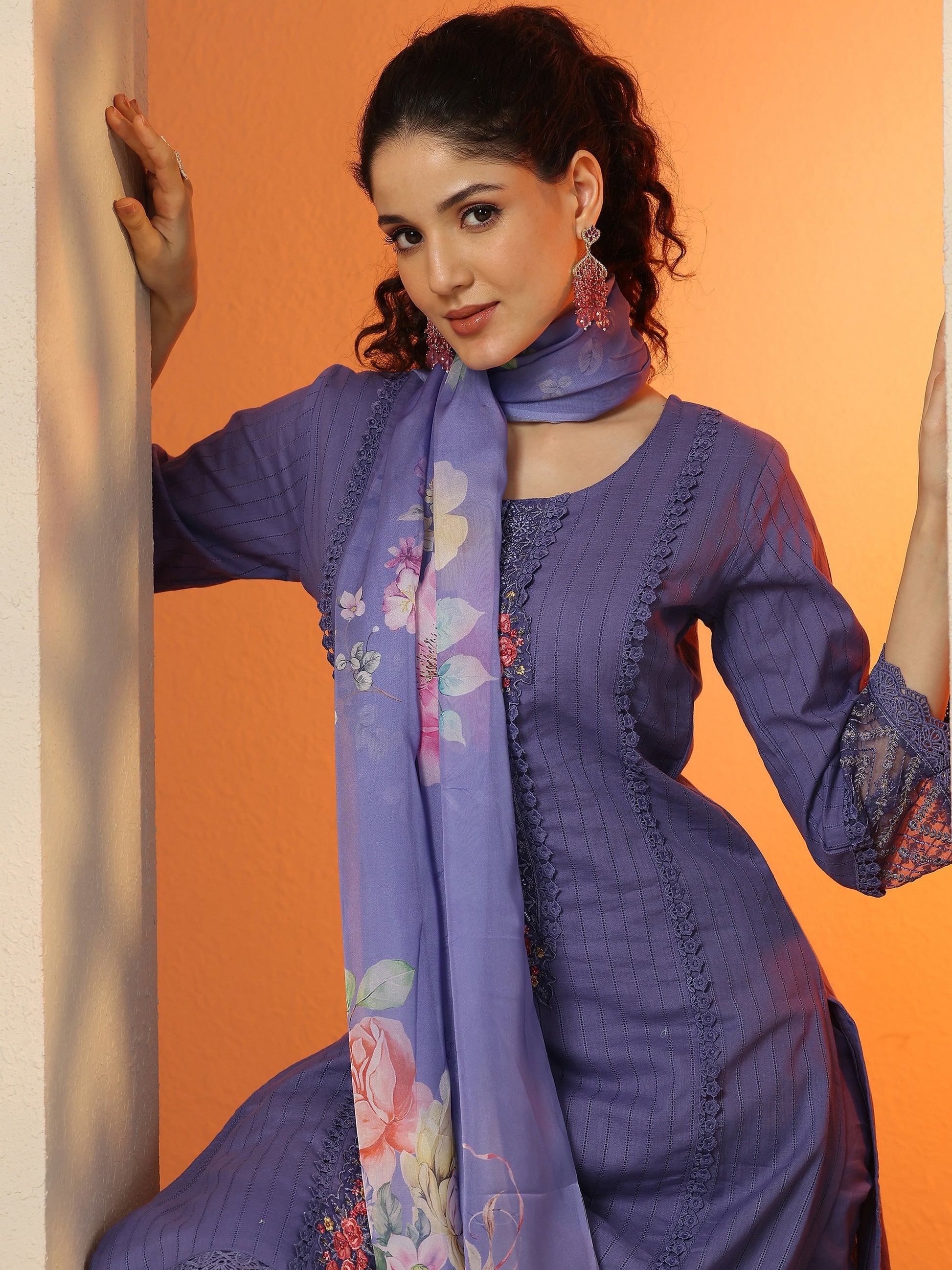 Purple Embroidered Cotton Straight Suit Set With Dupatta