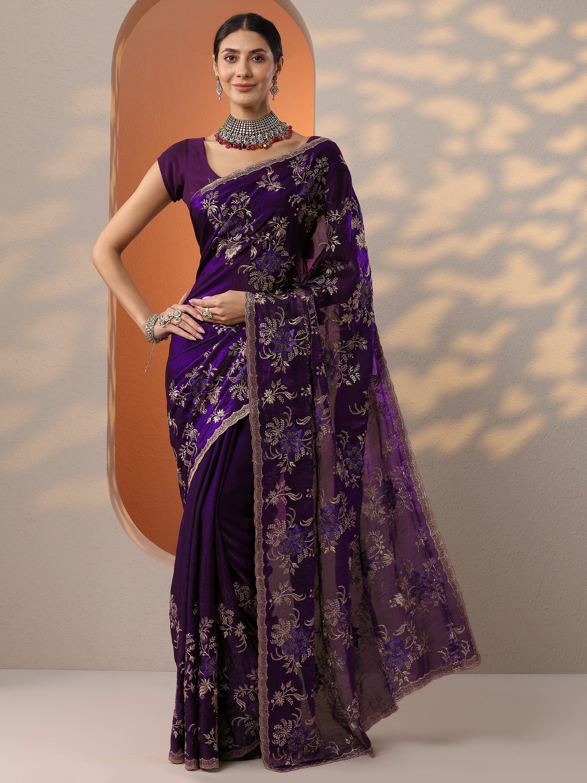 Purple Embroidered Organza Saree With Unstitched Blouse Piece
