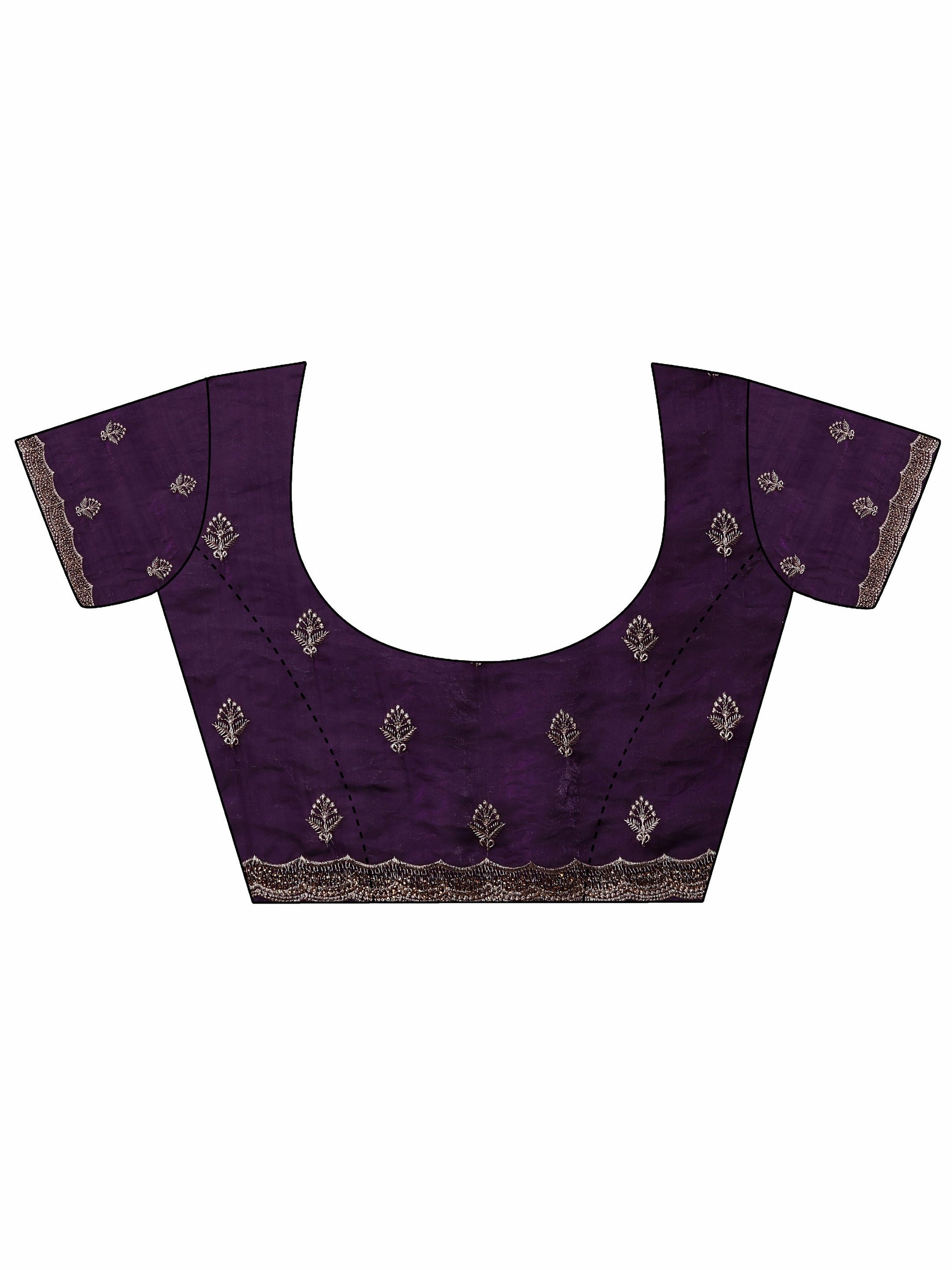 Our Purple embroidered Organza saree features captivating embellishments. Complemented with a Stitched Blouse. This charming saree is perfect for festive occasions.