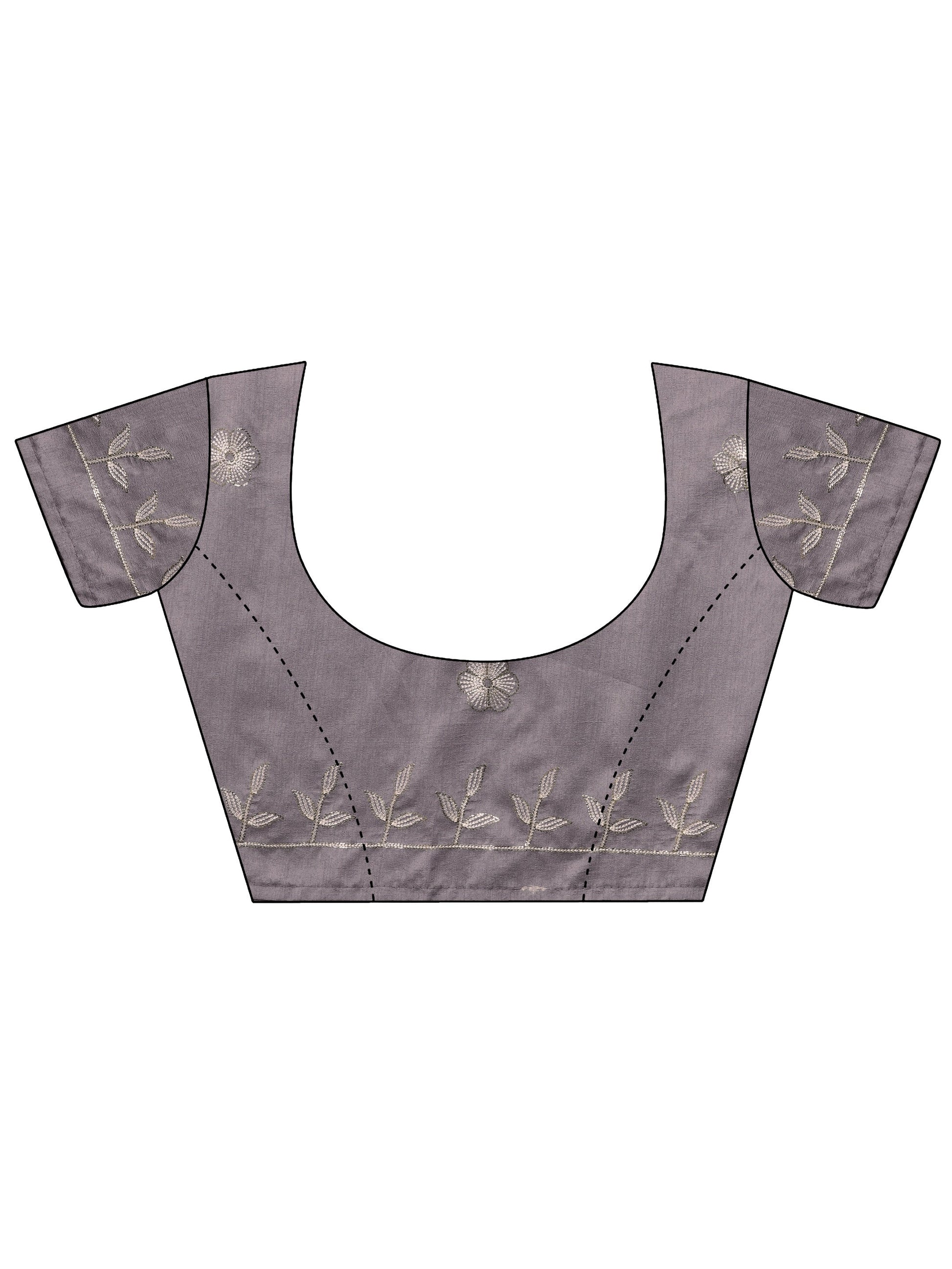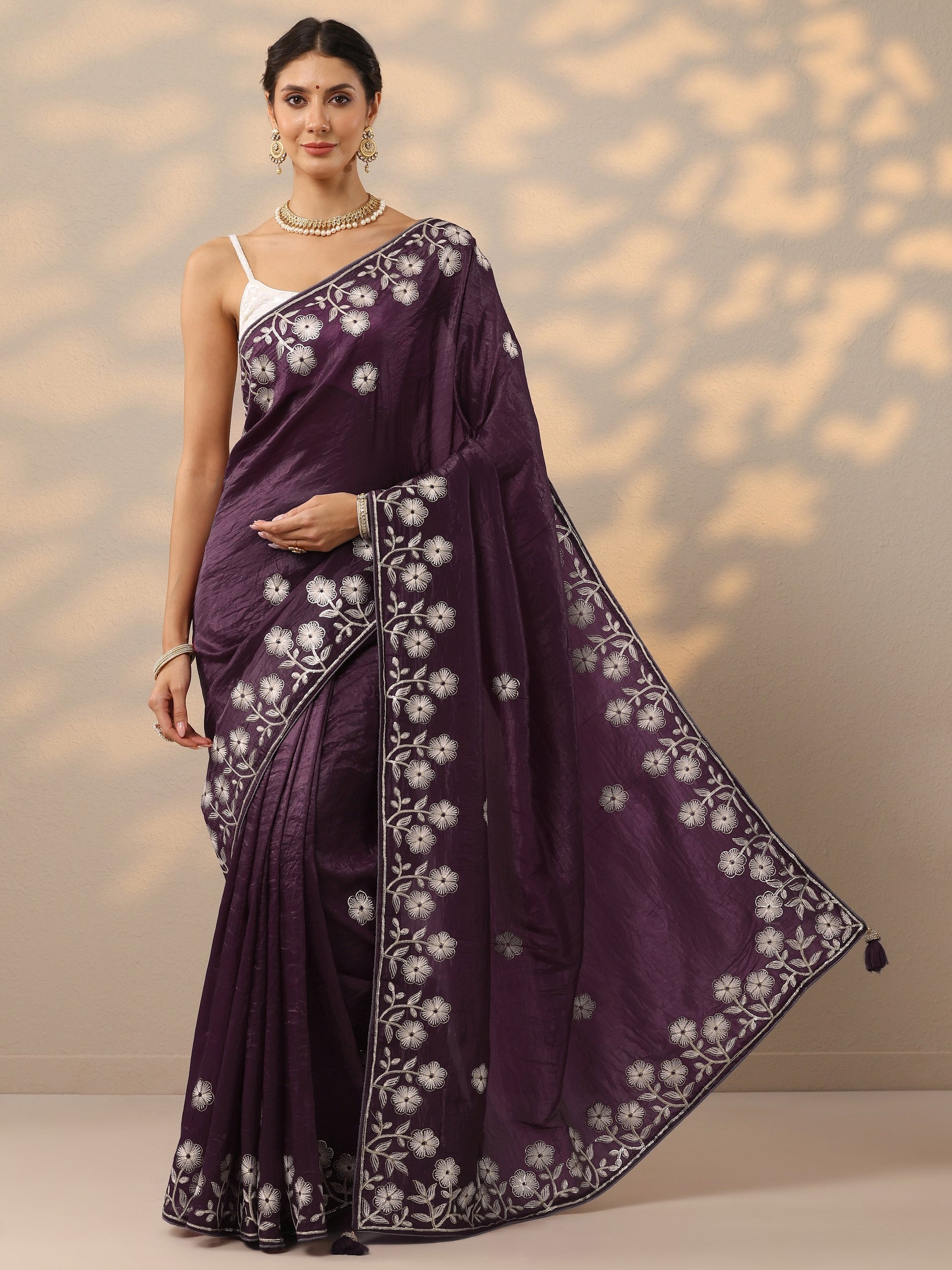 Our Purple Organza Saree Features Captivating Floral Embroidery. Complemented With An Unstitched Blouse Piece. This Charming Saree Is Perfect For Festive Occasions