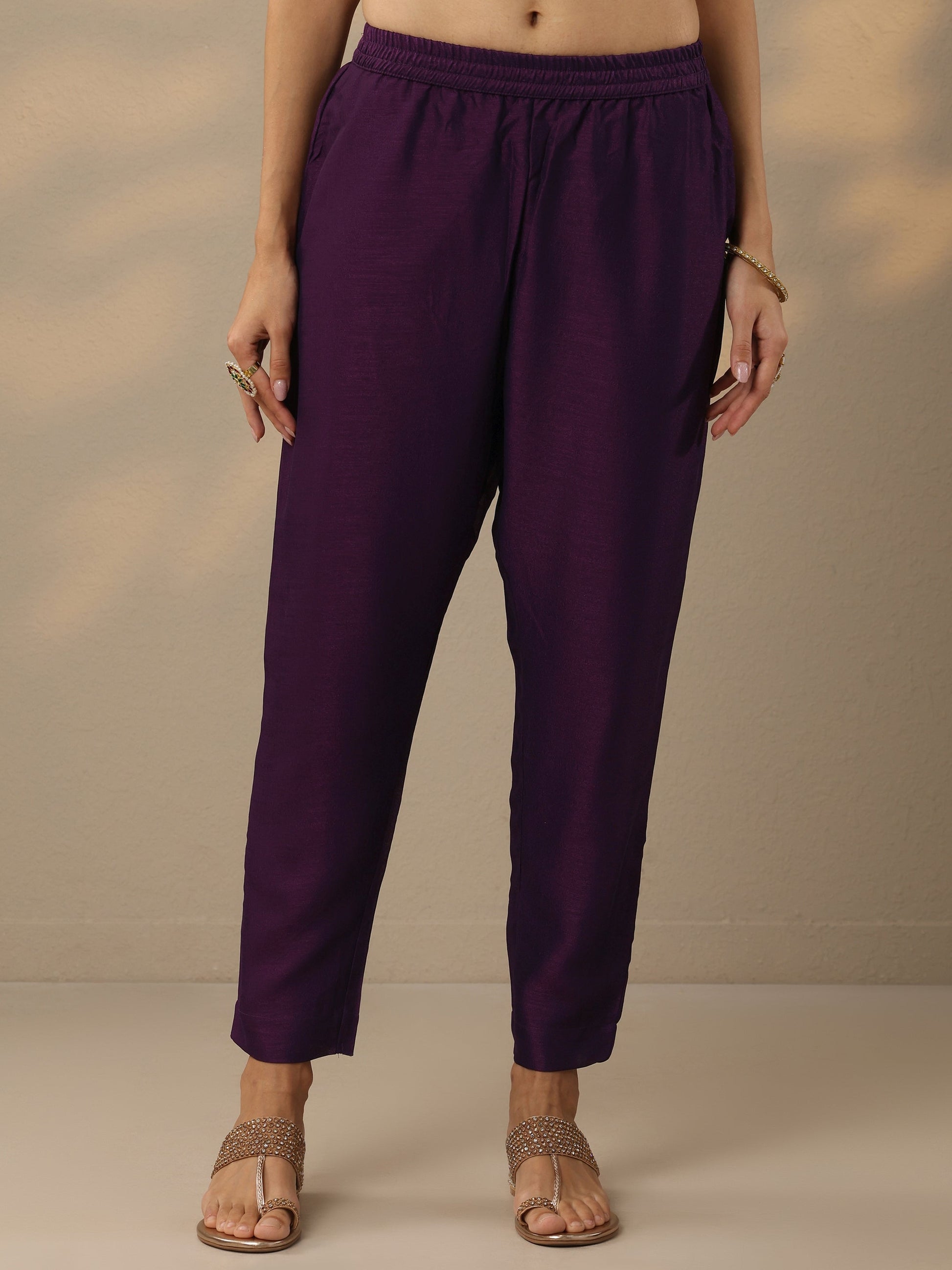 Our 3-piece purple silk blend Anarkali kurta set features a round neckline, regular sleeves, and a statement yoke. Complemented with lining and straight pants with a partially elasticated waistband and 2 pockets, and a printed dupatta. Adorned with embroidered accents, this style is perfect for dark festive occasions.