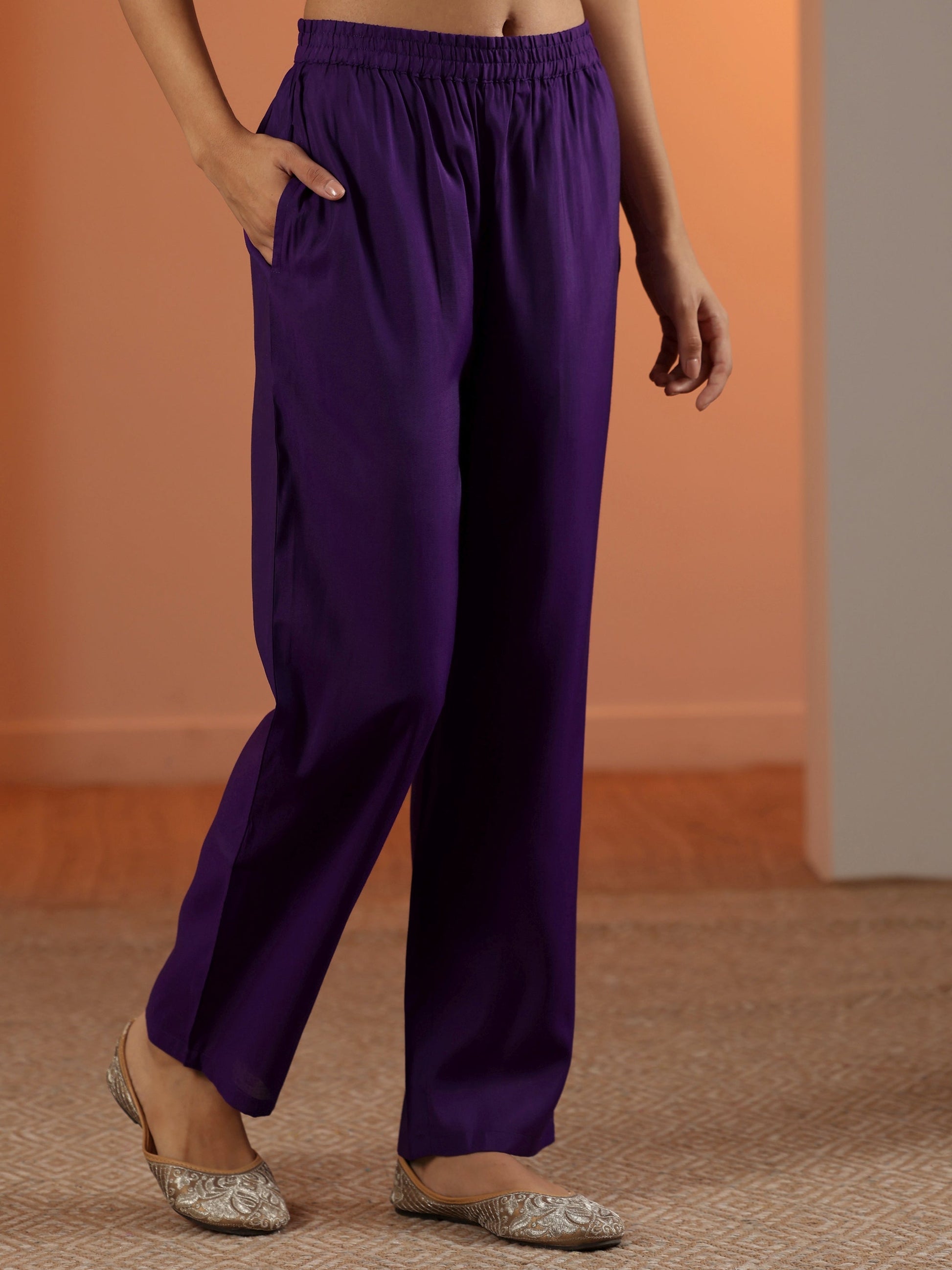 Our 2-piece Purple Silk blend Straight-fit features a Round Neckline, Regular Sleeves, and statement yoke. Complemented with Straight Pants with a Partially Elasticated waistband and 2 pockets. Adorned with floral embroidered accents, this style is perfect for Dark Festive occasions.