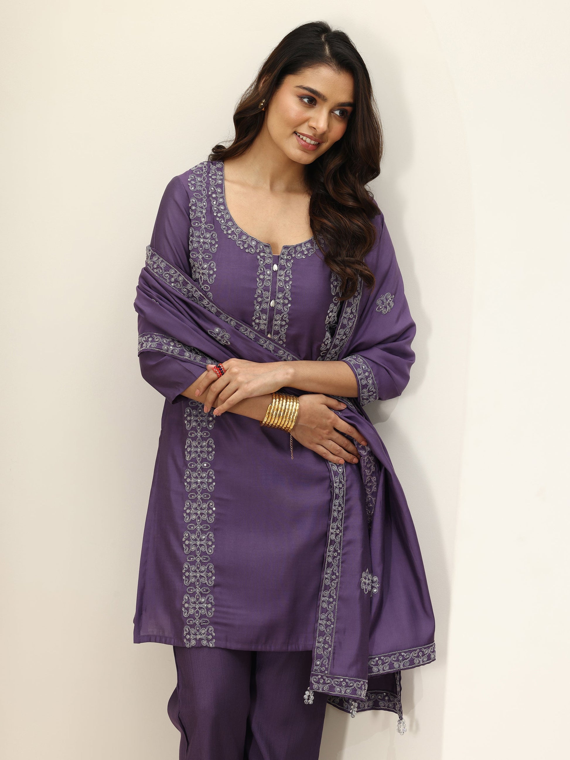 Purple Embroidered Silk Blend Straight Suit Sets With Dupatta