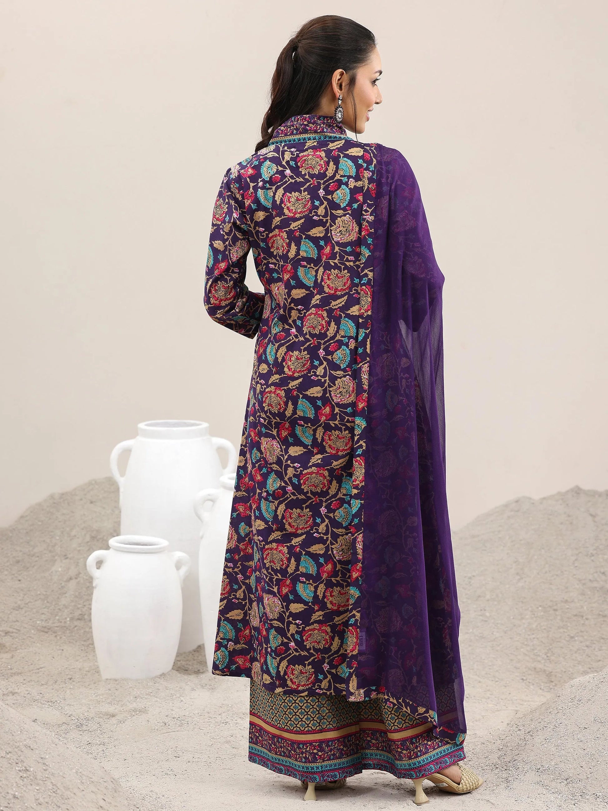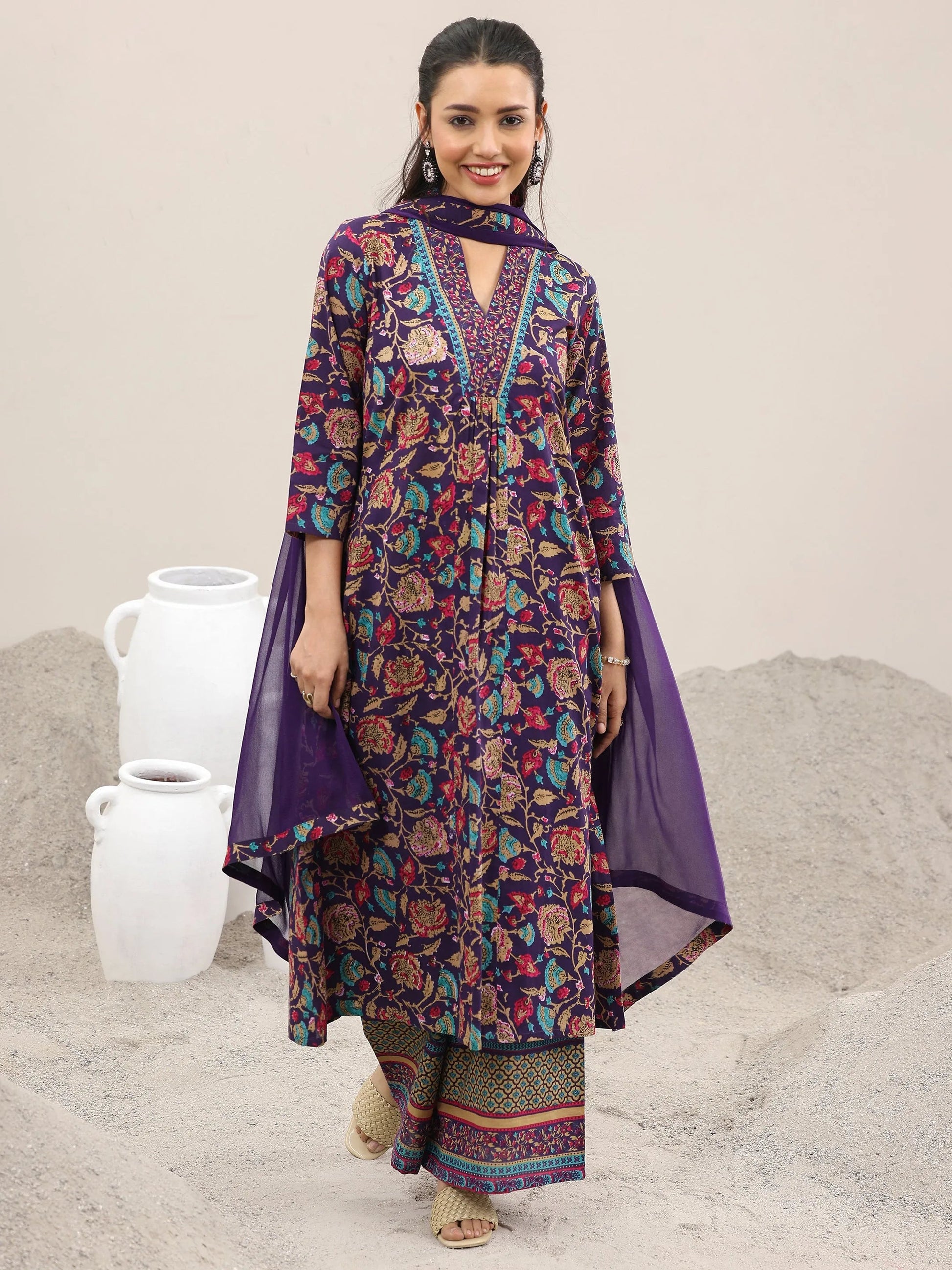 Purple Printed Cotton A-Line Kurta With Palazzos & Dupatta