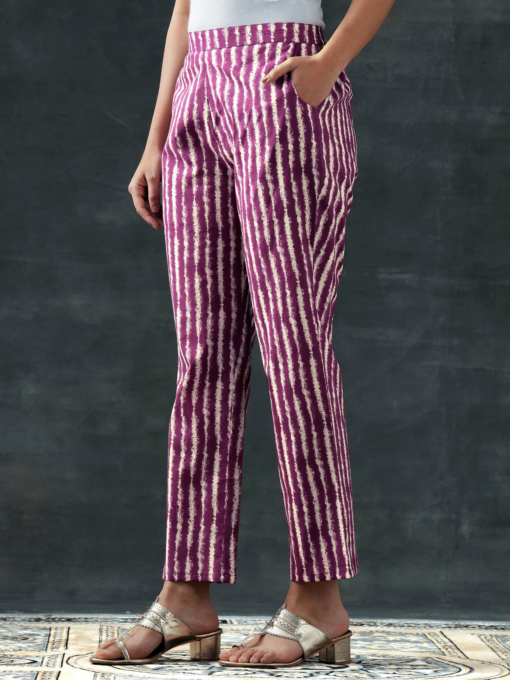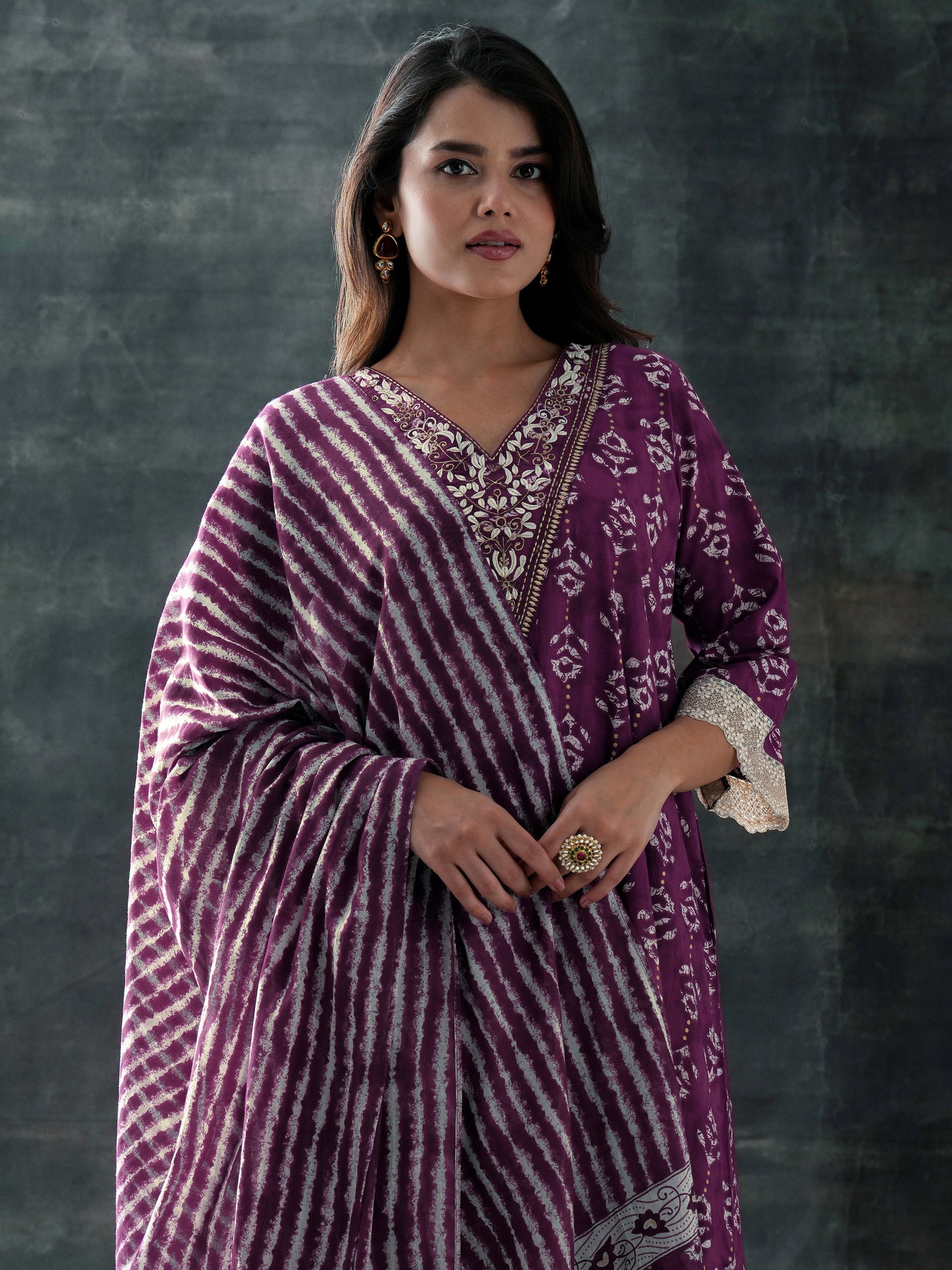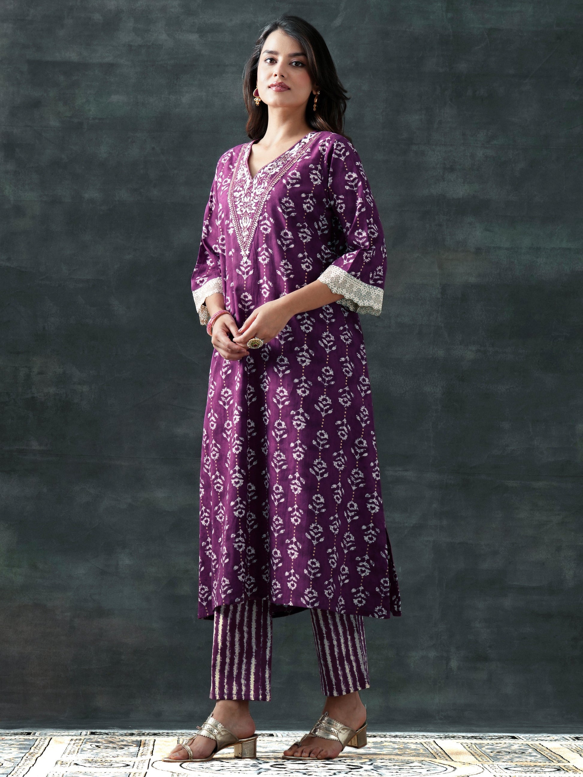 Our 3-piece purple cotton straight-fit kurta set features a V-neckline, regular sleeves, and a statement yoke. Complemented with straight pants with a partially elasticated waistband, and a printed dupatta. Adorned with floral printed accents, this style is perfect for casual wear.