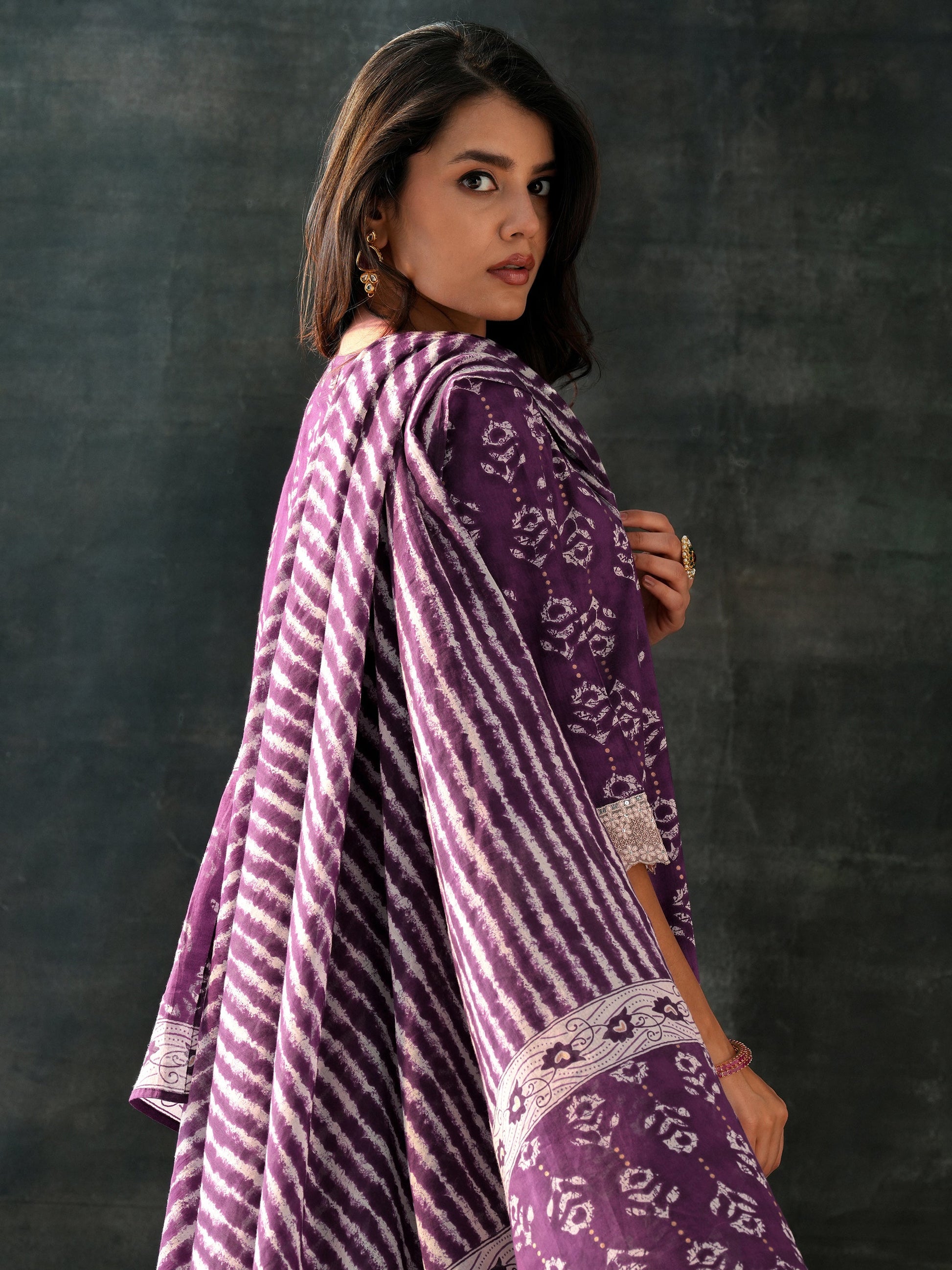 Purple Printed Cotton A-Line Suit Set With Dupatta