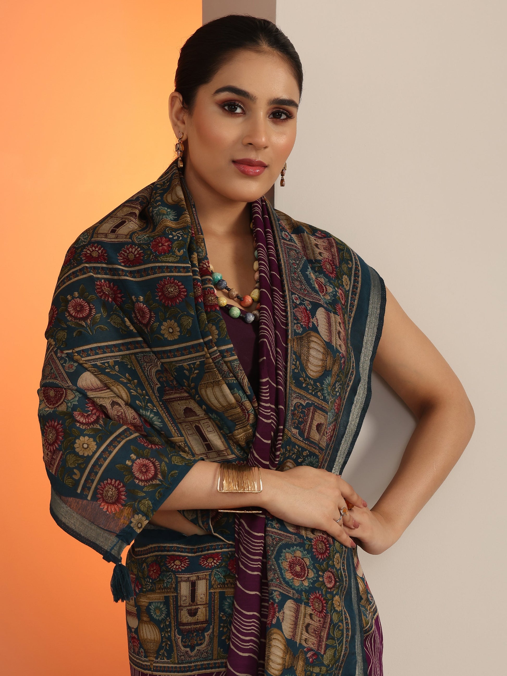 Purple Printed Cotton Blend Saree With Unstitched Blouse Piece