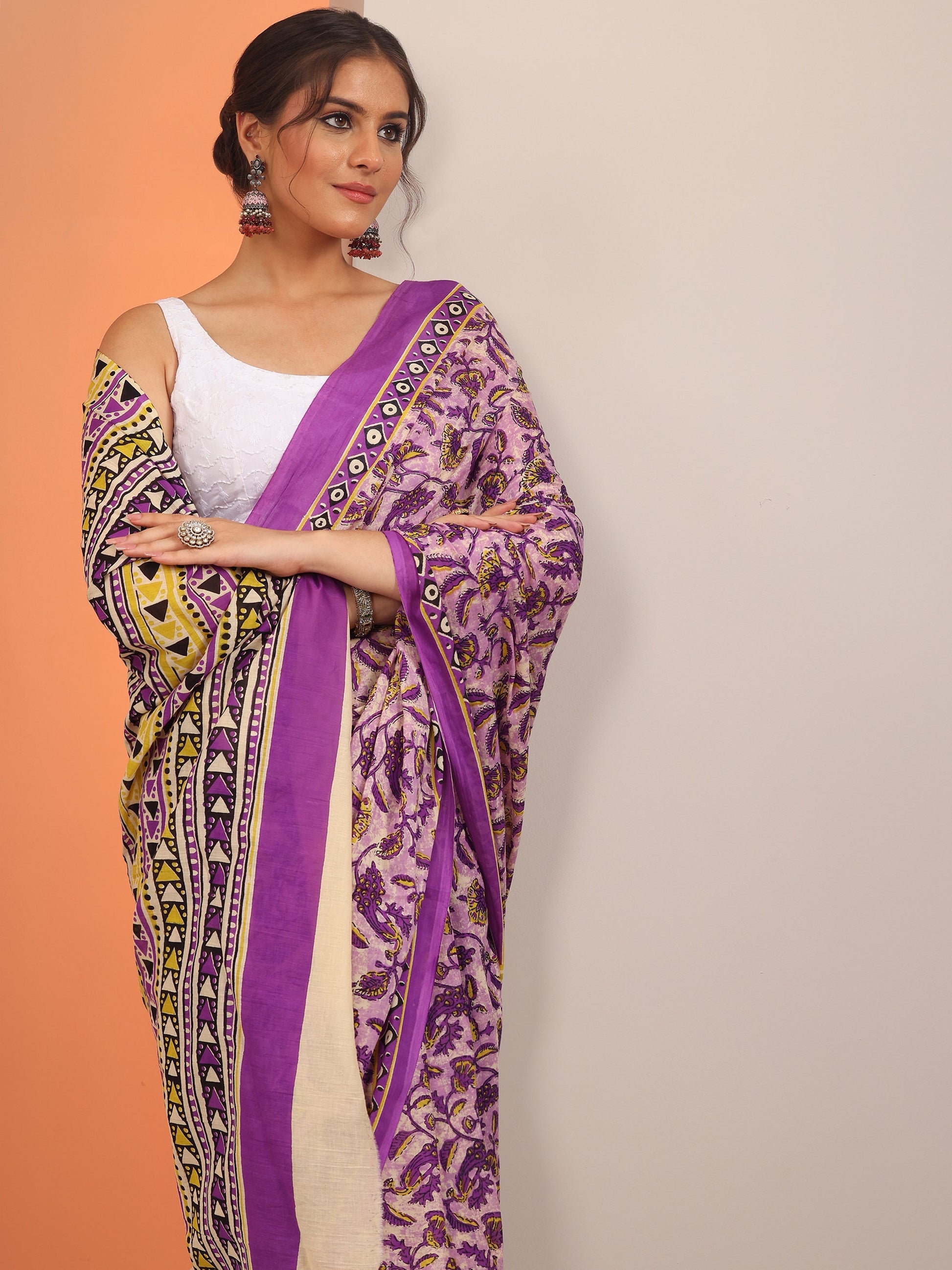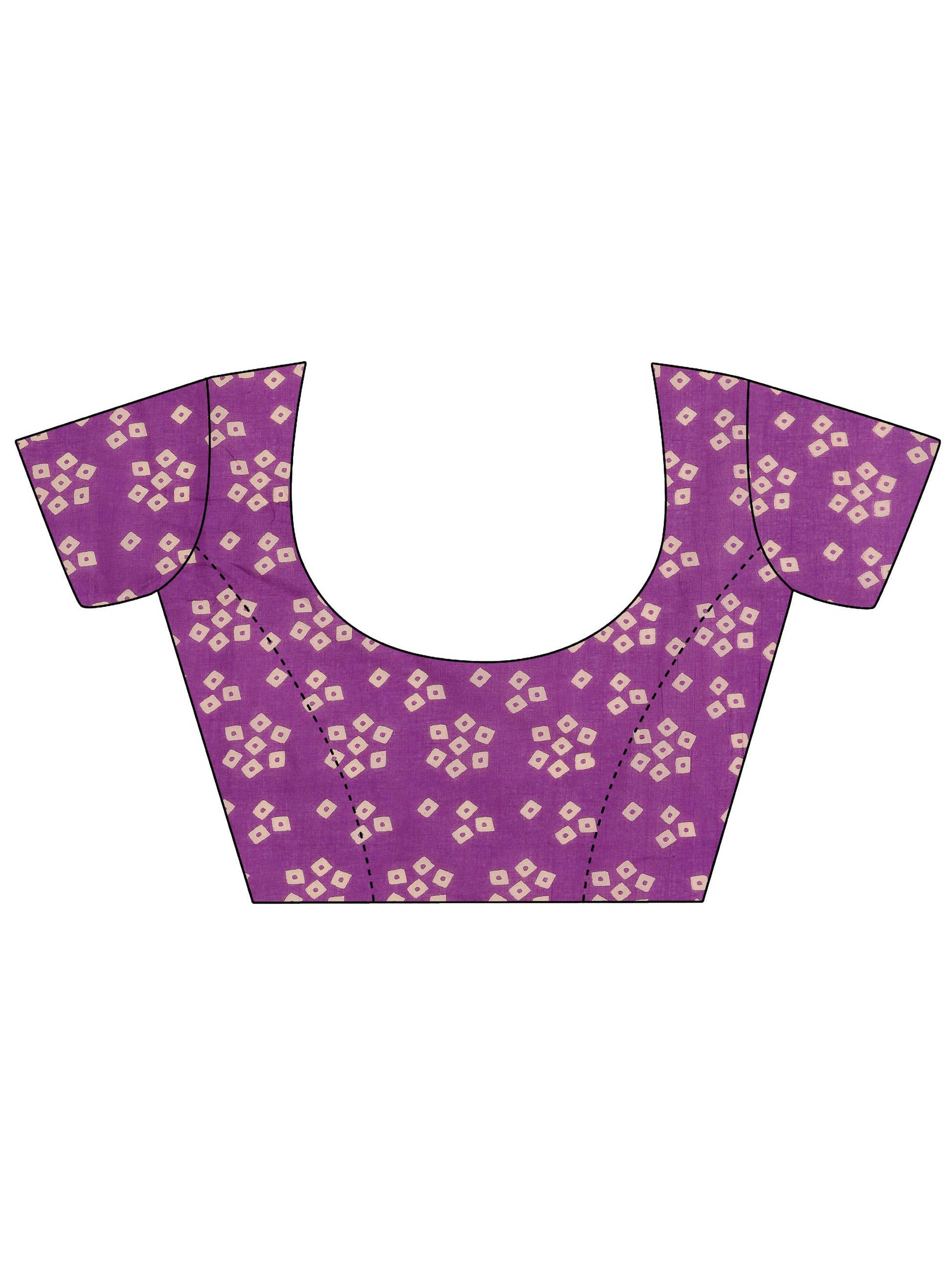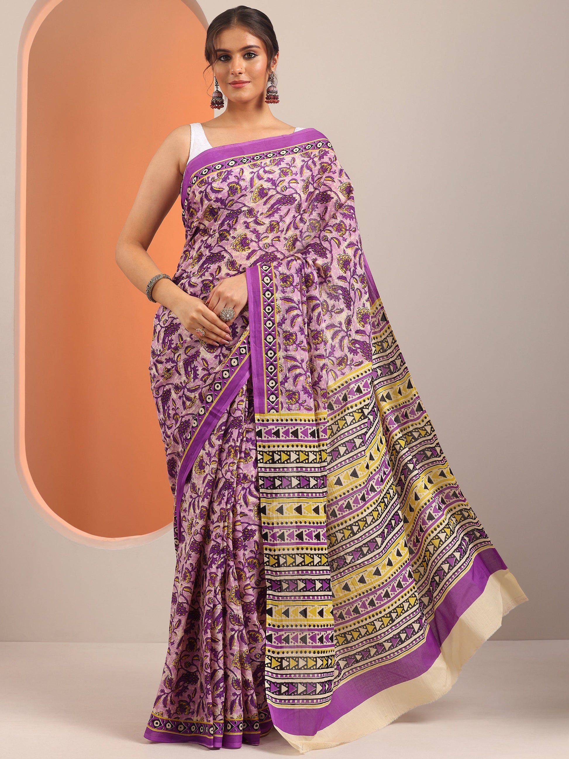 Purple Printed Cotton Saree With Unstitched Blouse Piece