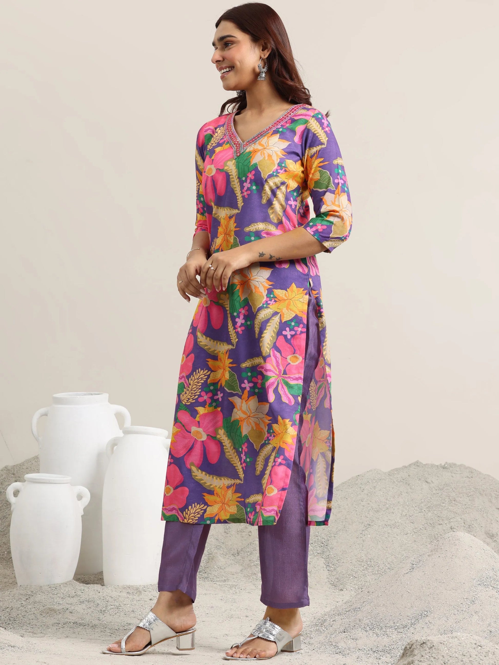 Our 3-piece purple printed rayon straight suit with dupatta, features a kurta with a V-neckline and three-quarter sleeves. Complemented with solid trousers with partially elasticated waistband and roomy pockets and a dupatta. Highlighted with floral printed, this style is perfect for casual outings.