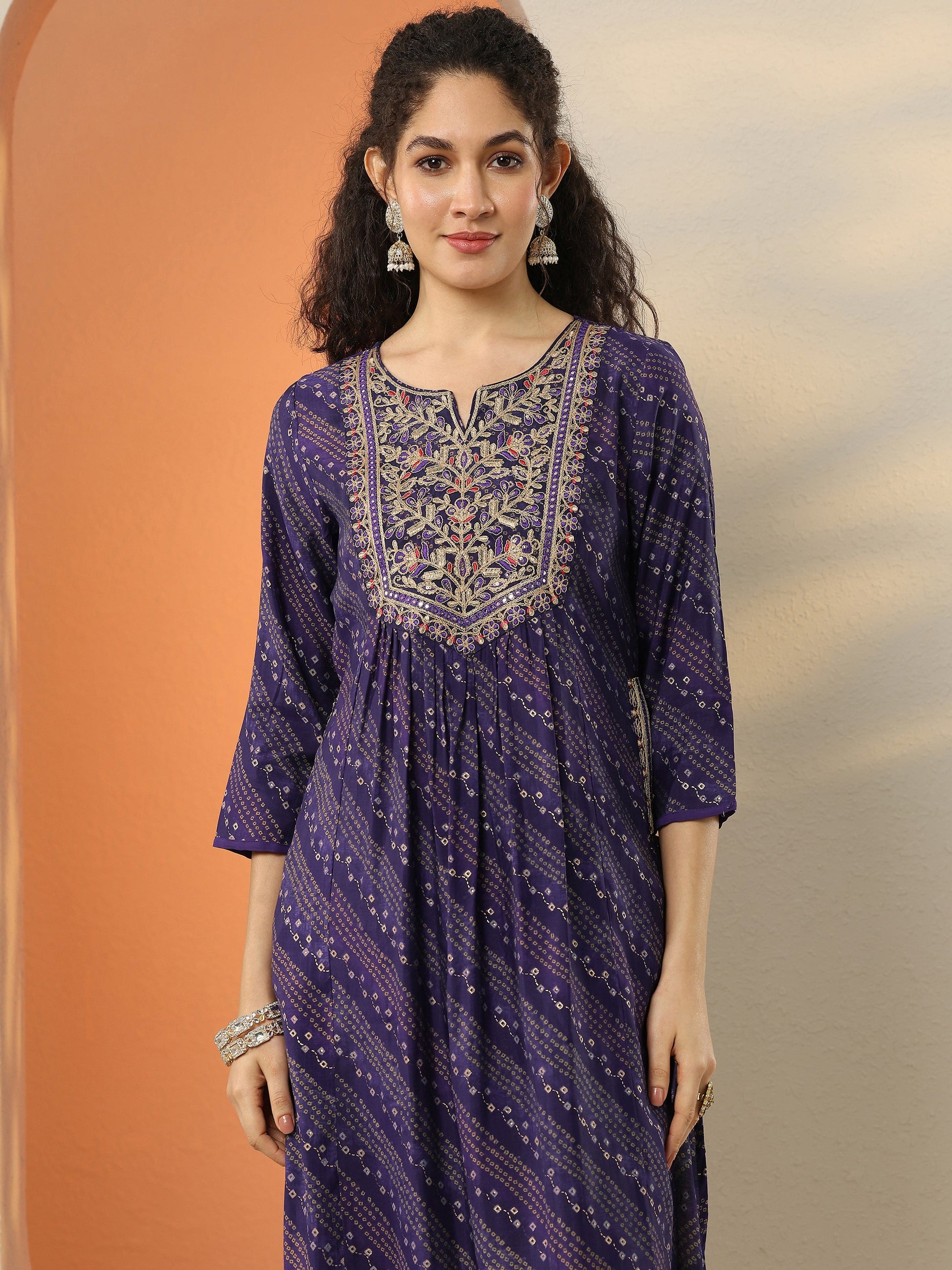 Purple Printed Silk Blend A-Line Suit Set With Dupatta