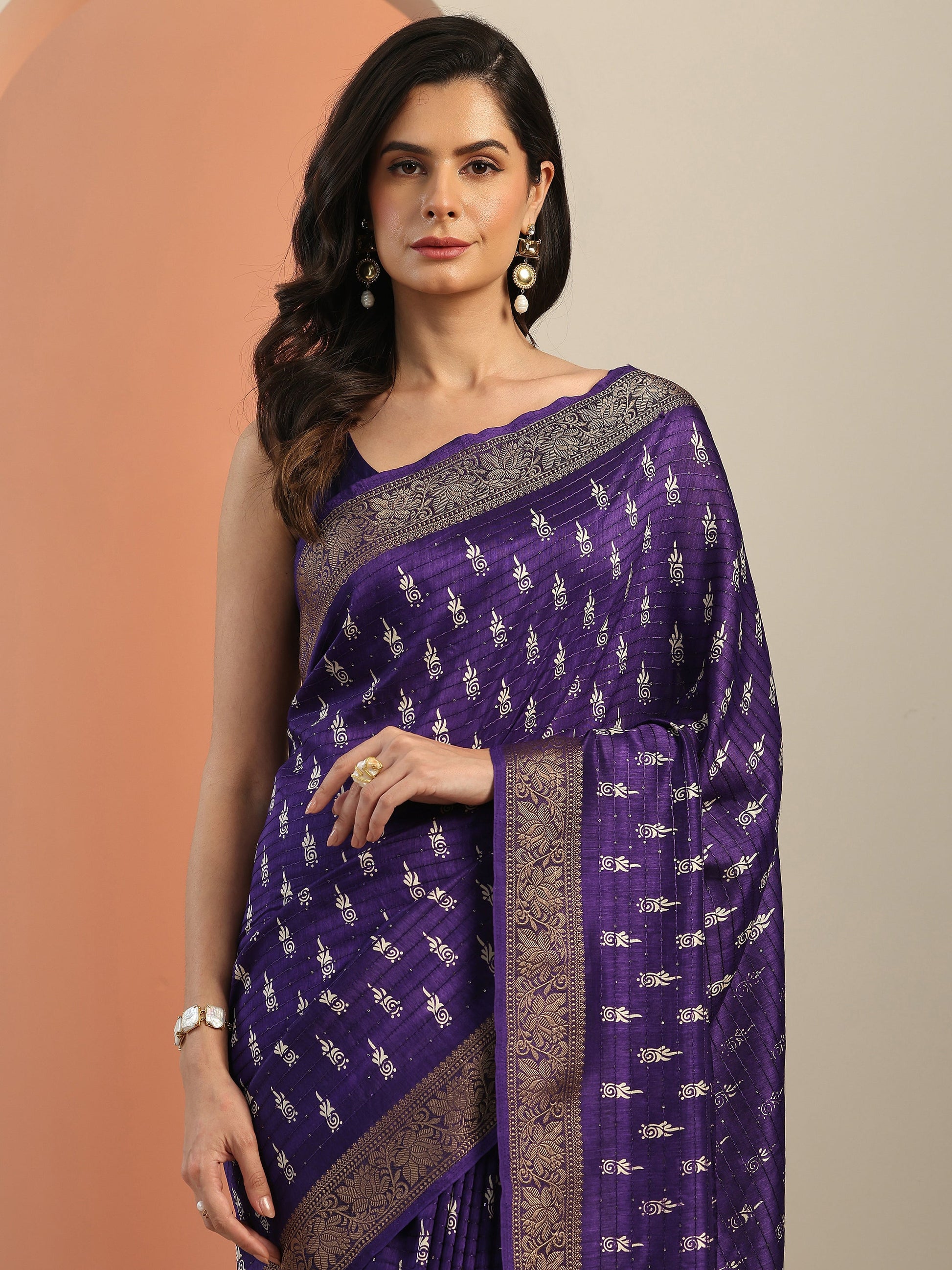 Our Purple Printed Silk Blend Saree Features Captivating Woven Design. Complemented With A Unstitched Blouse Piece. This Charming Saree Is Perfect For Festive Wear.