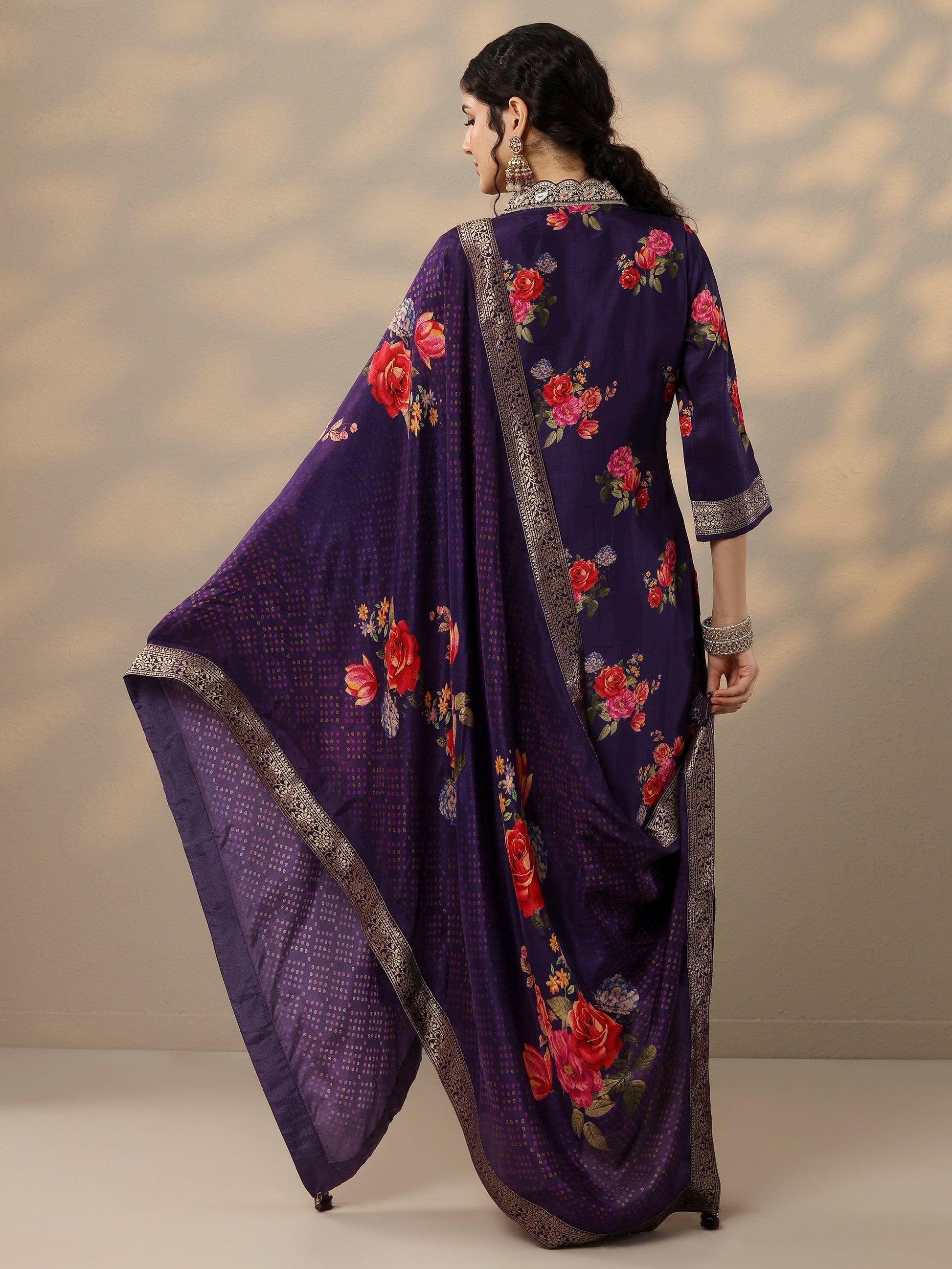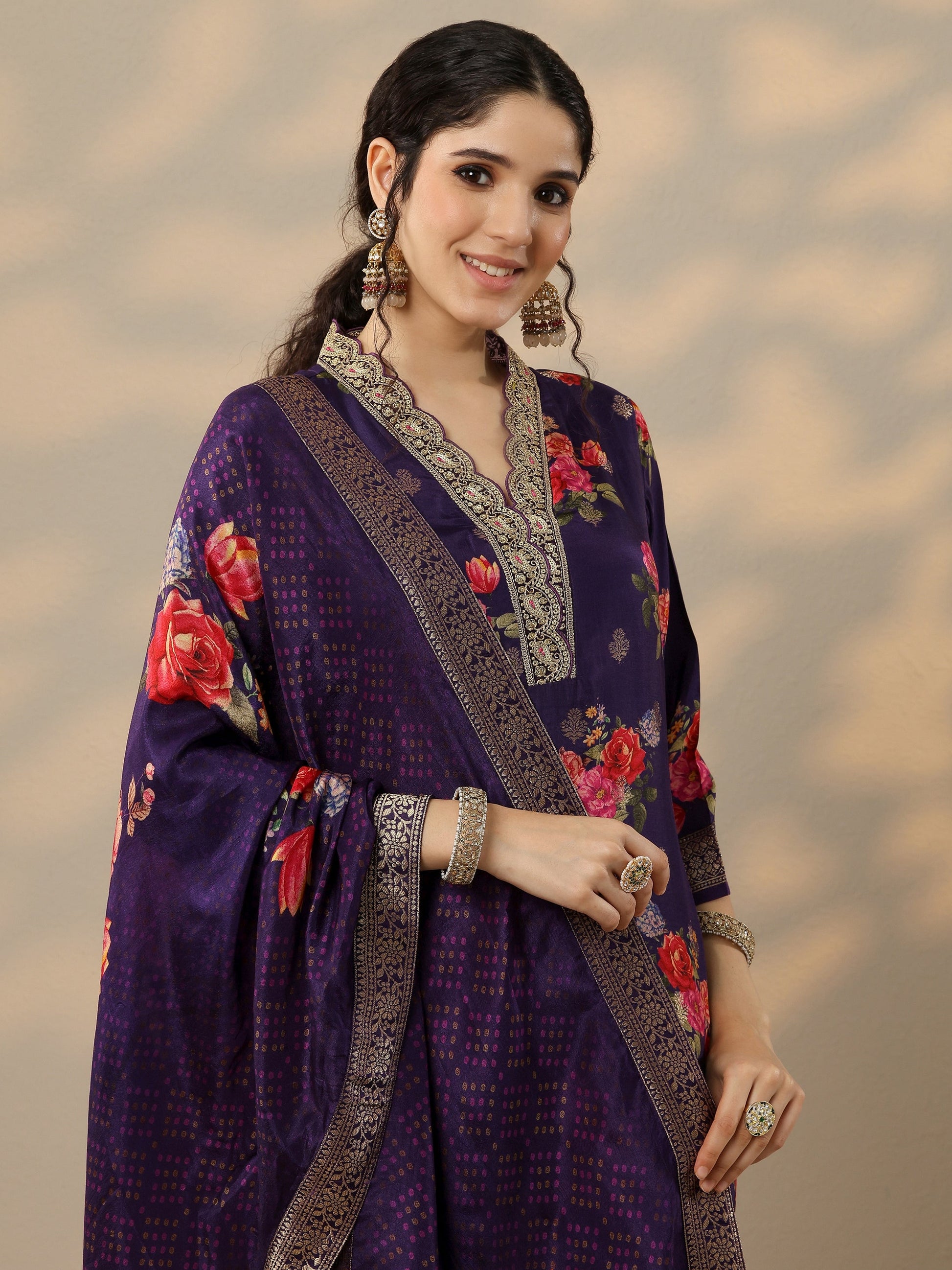 Purple Printed Silk Blend Straight Suit Set With Dupatta