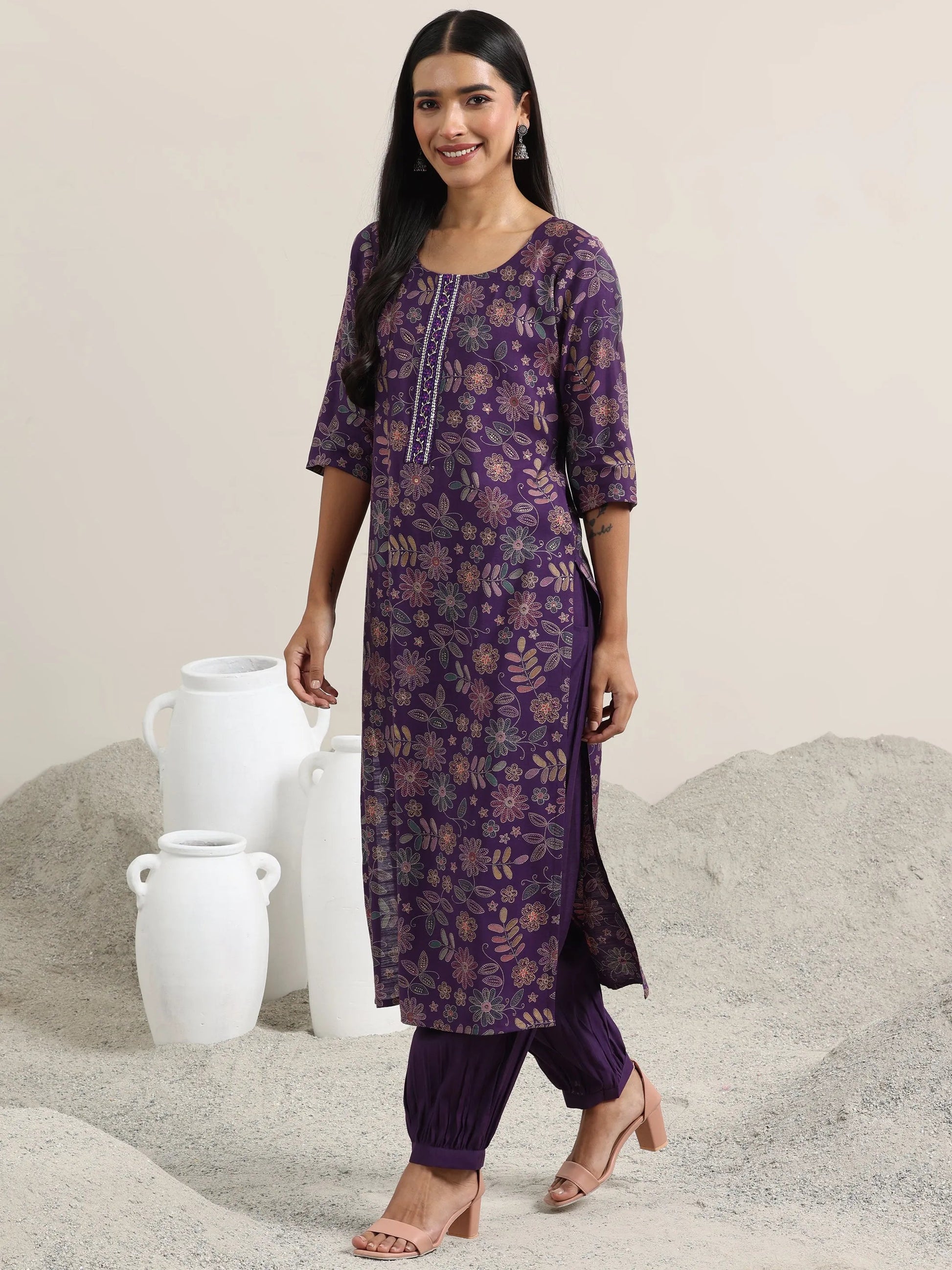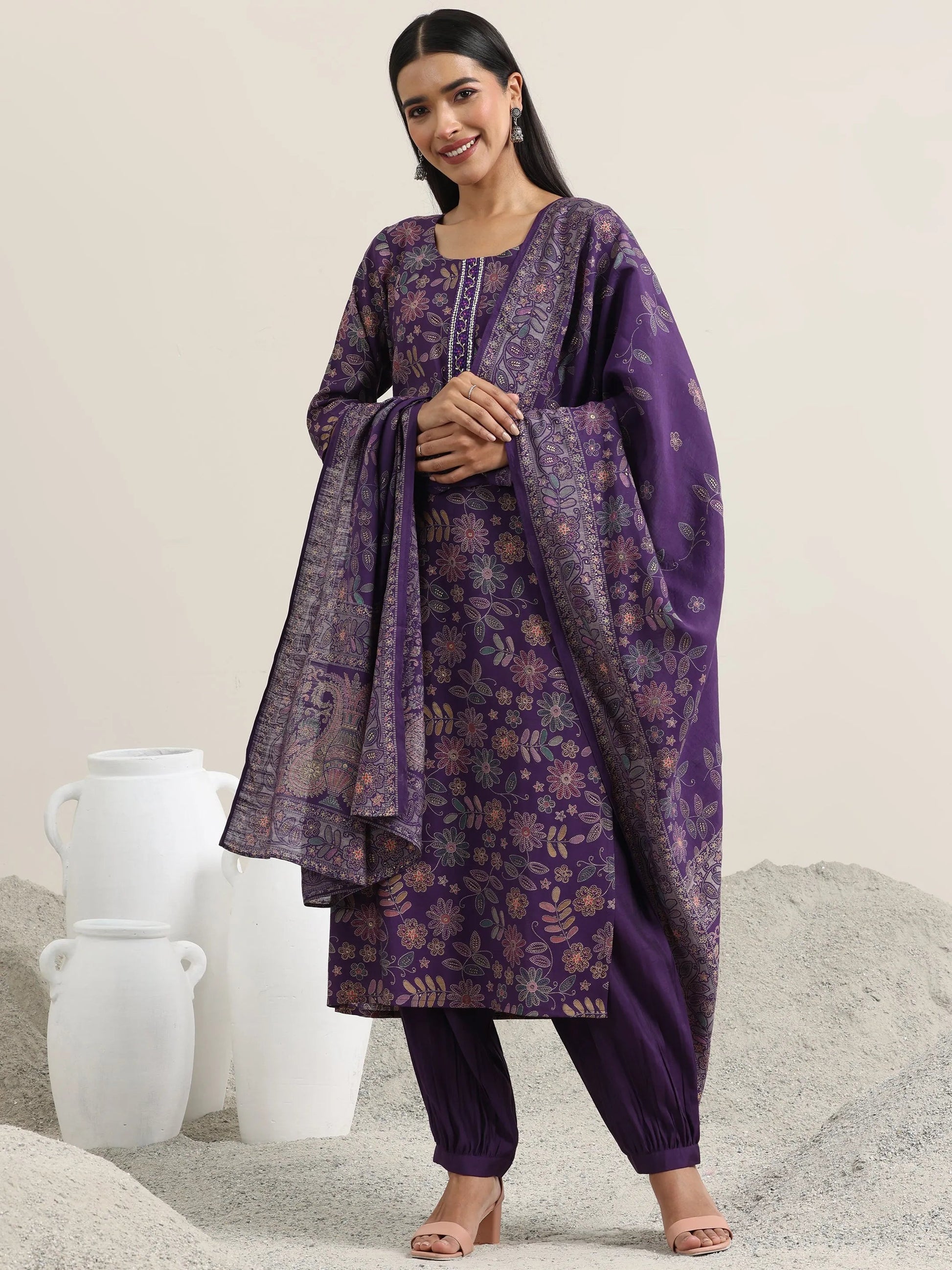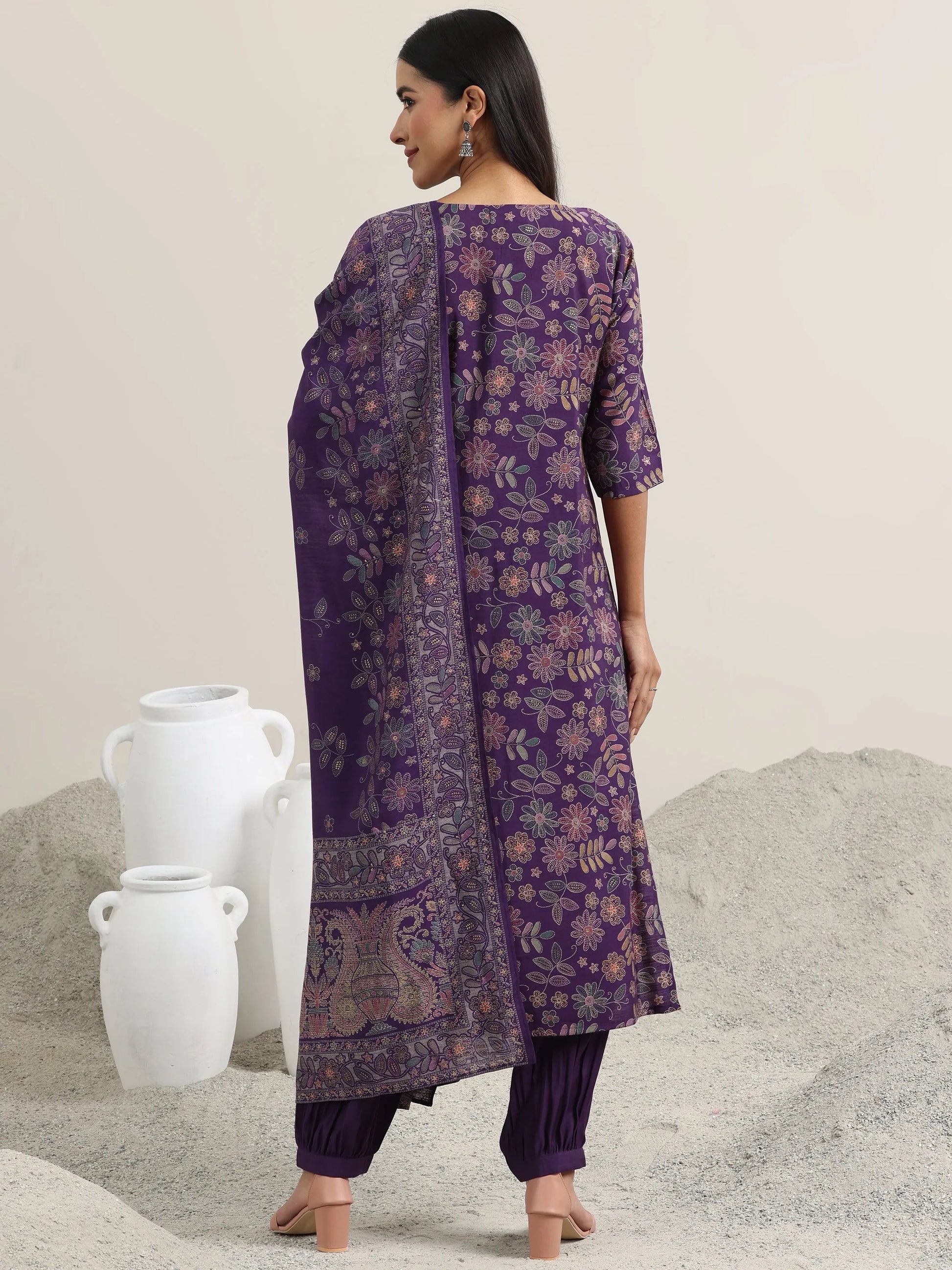 Purple Printed Silk Blend Straight Suit With Dupatta