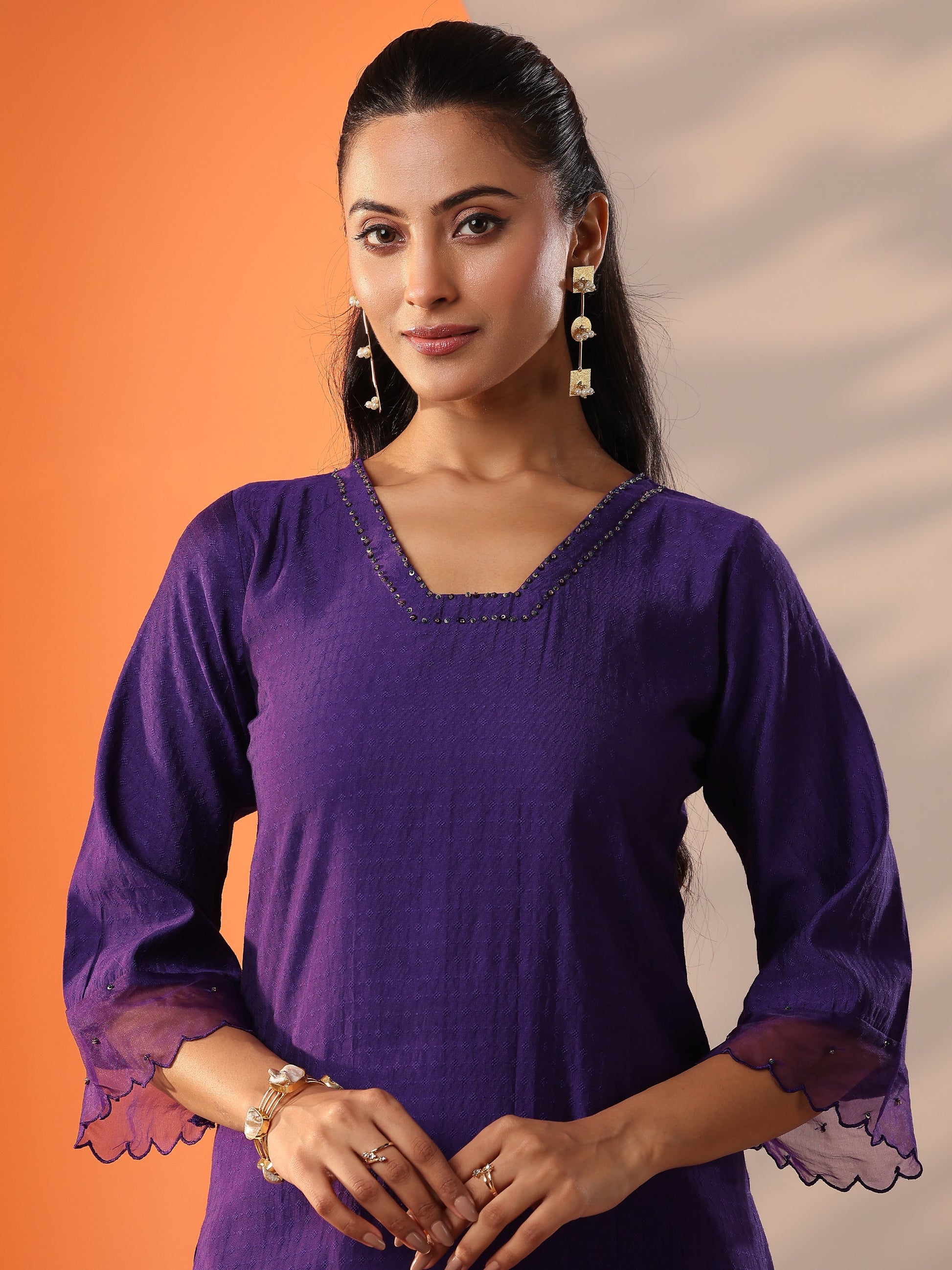 Purple Woven Design Silk Blend Straight Suit Set With Dupatta