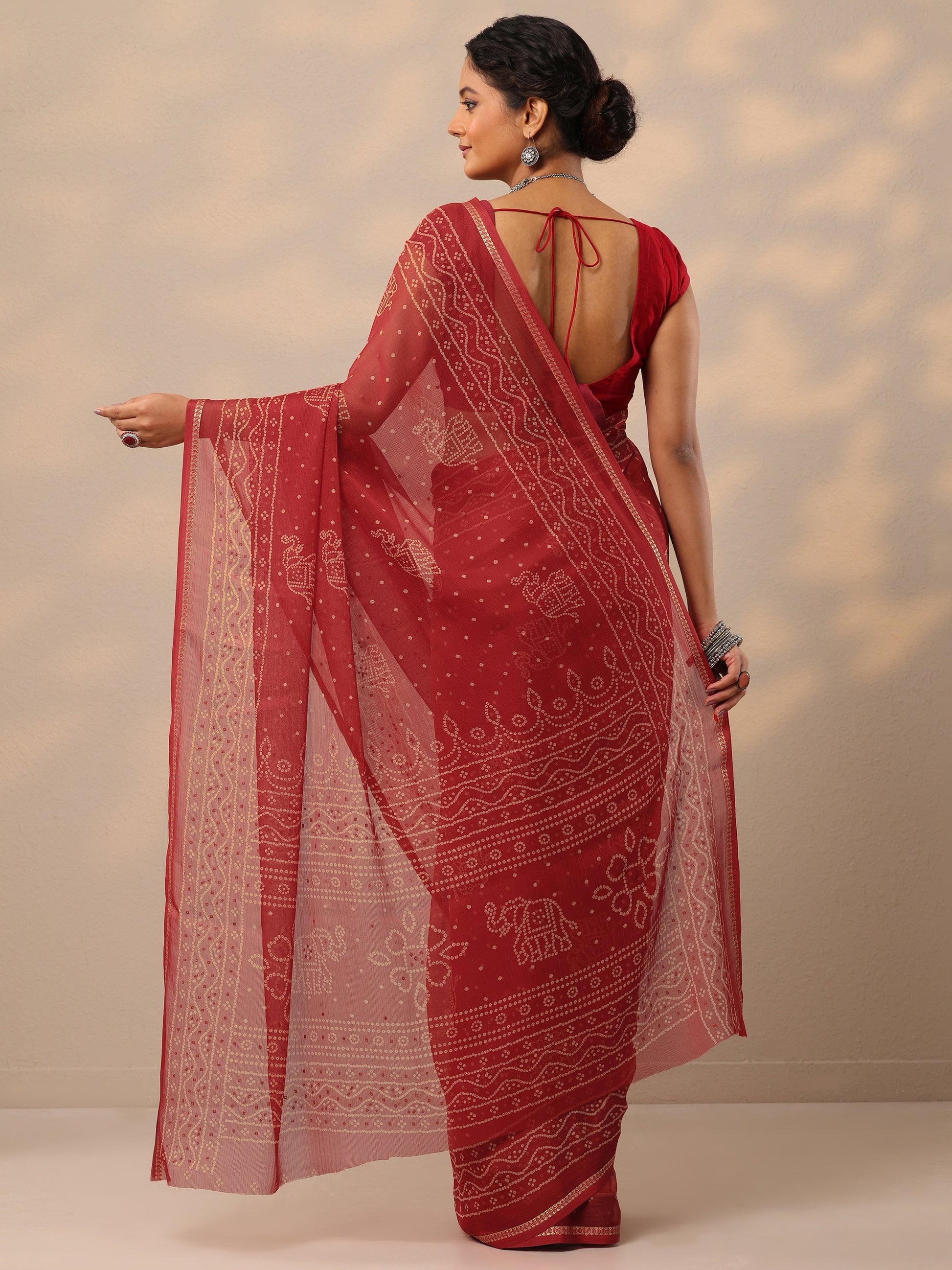 Red Bandhani Printed Chiffon Saree With Unstitched Blouse Piece
