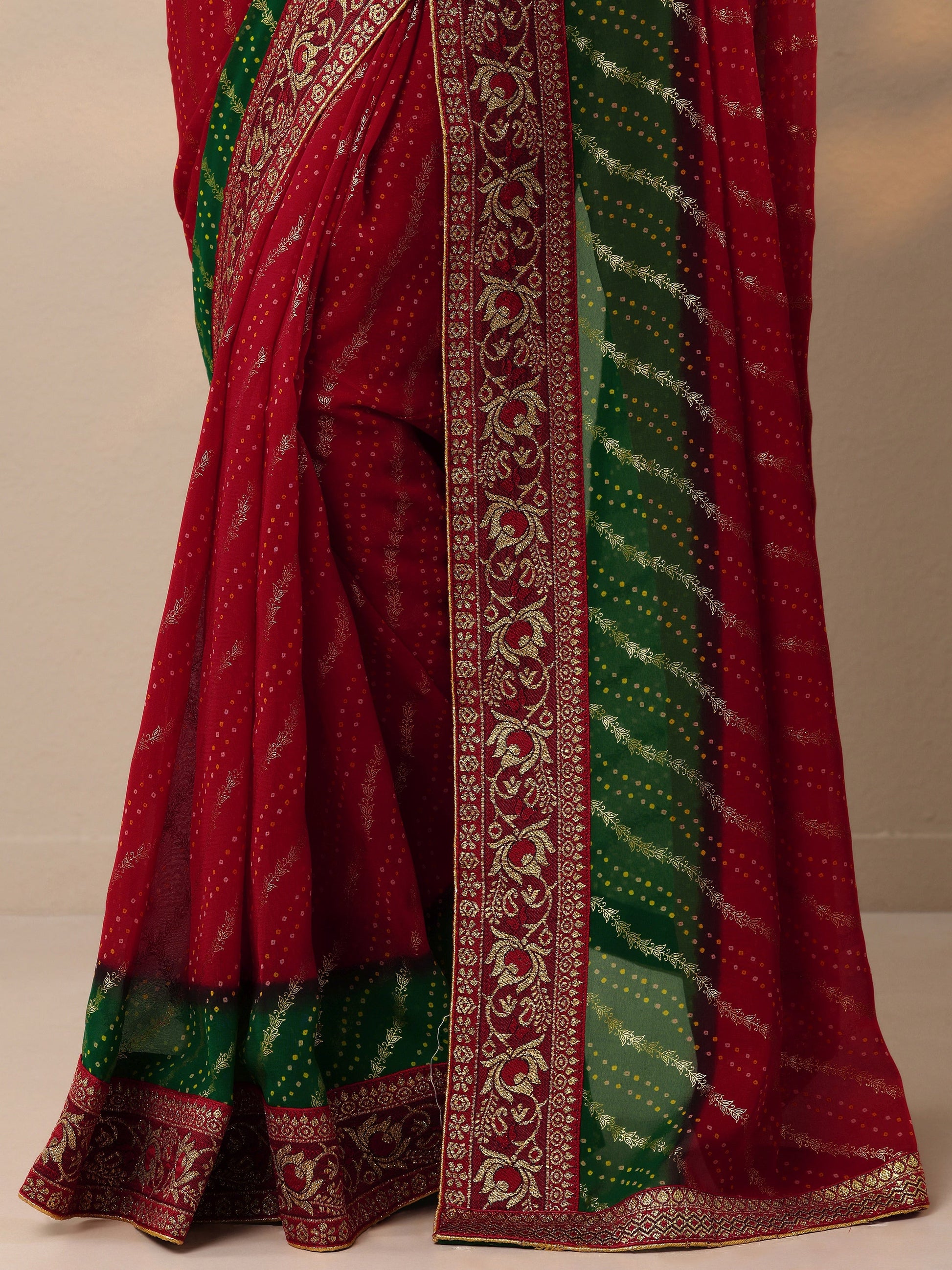 Our red printed georgette saree features captivating Bandhani print. Complemented with a blouse piece. This charming saree is perfect for festive occasions.