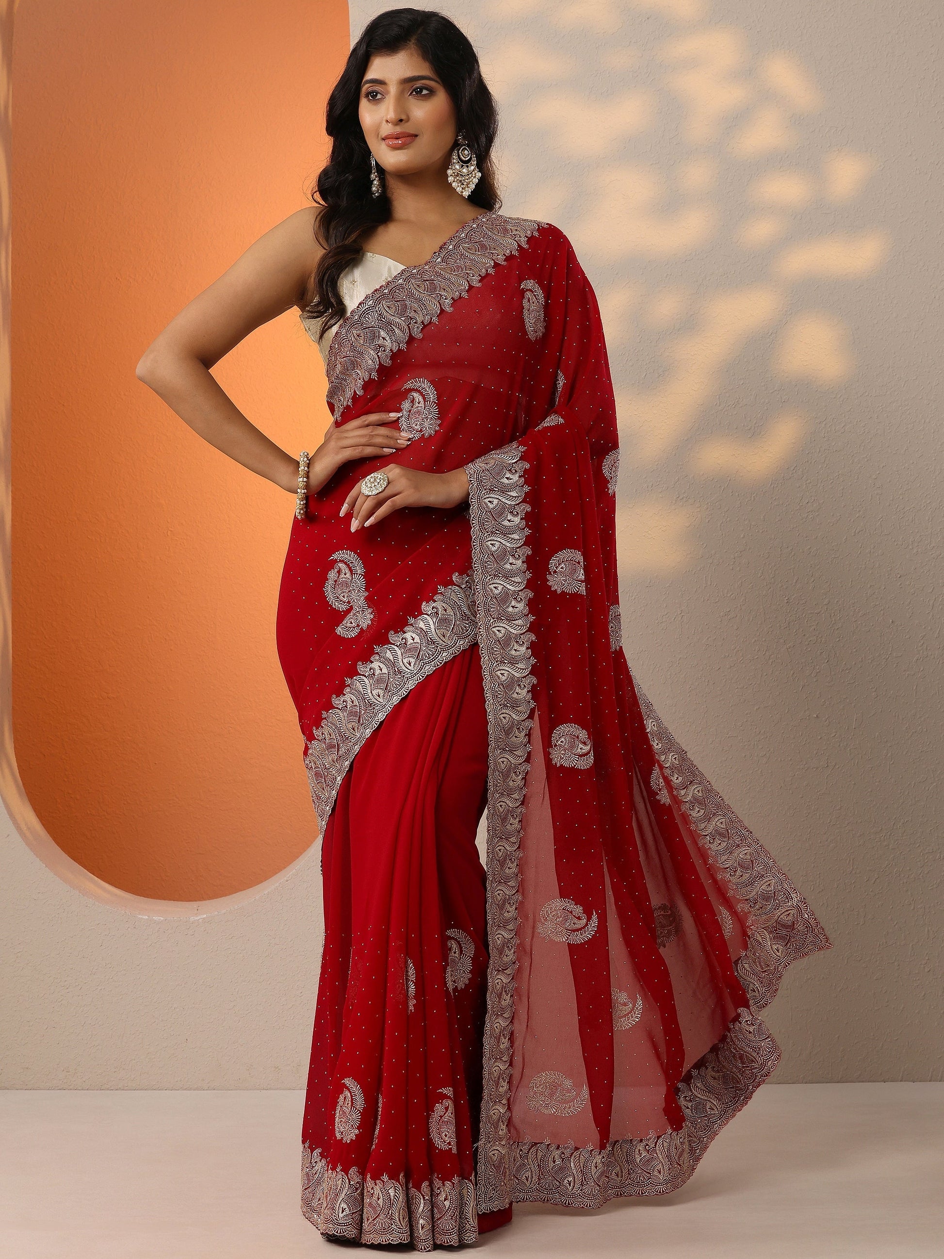 Our red Georgette saree features captivating embellishments. Complemented with a blouse piece. This charming saree is perfect for festive occasions.