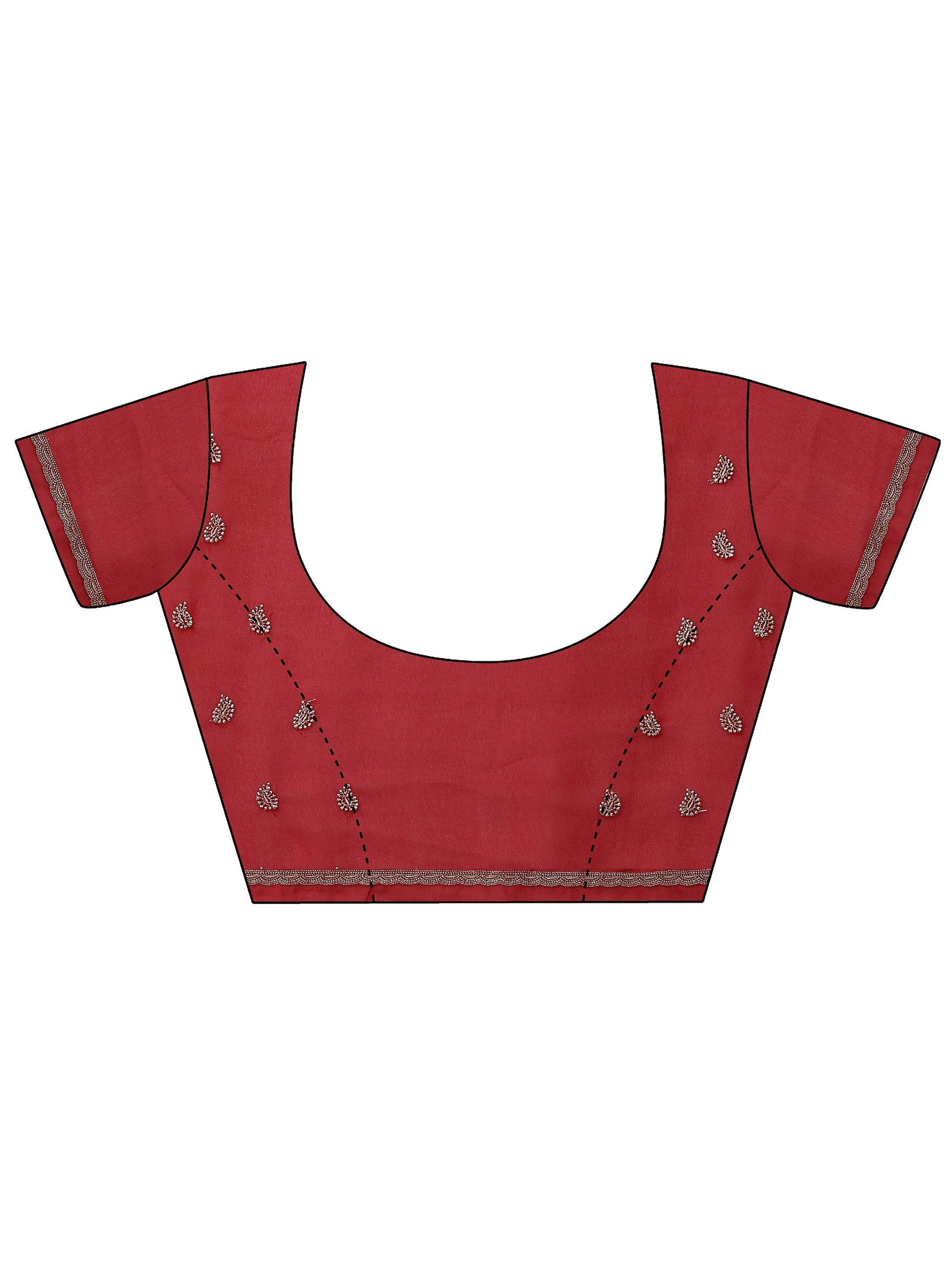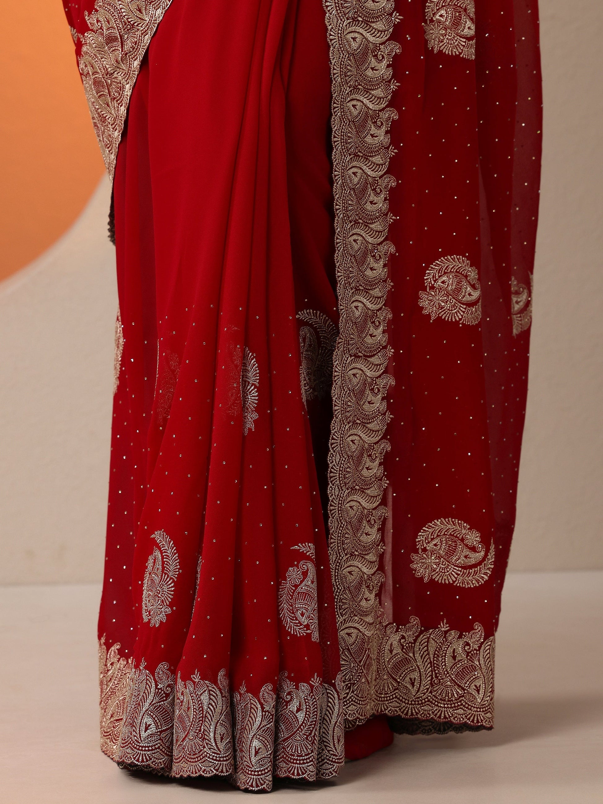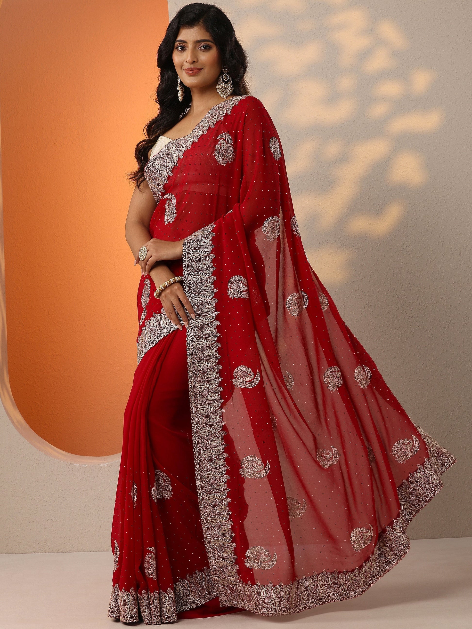 Red Embroidered Georgette Saree With Unstitched Blouse Piece