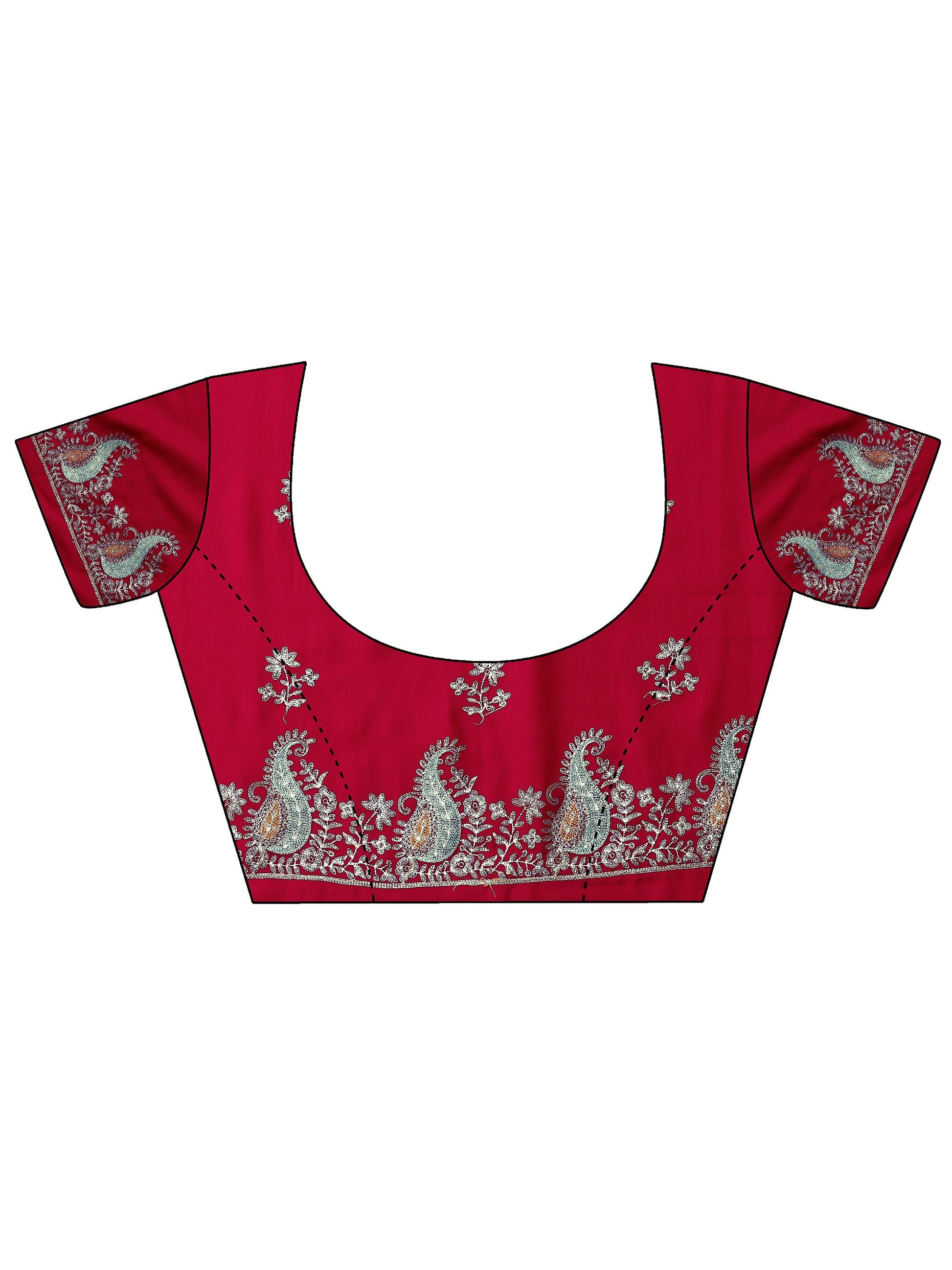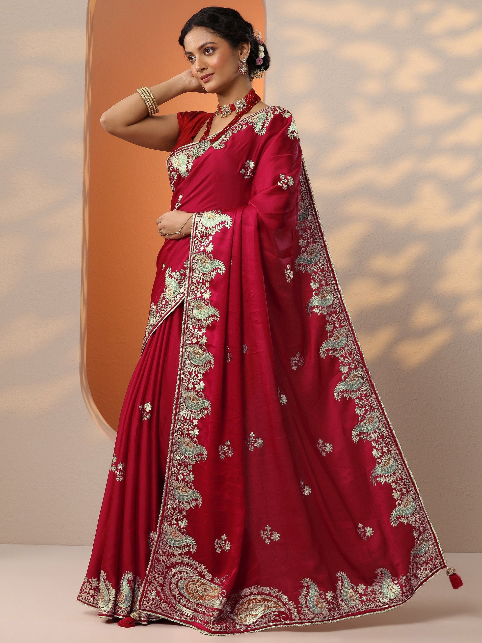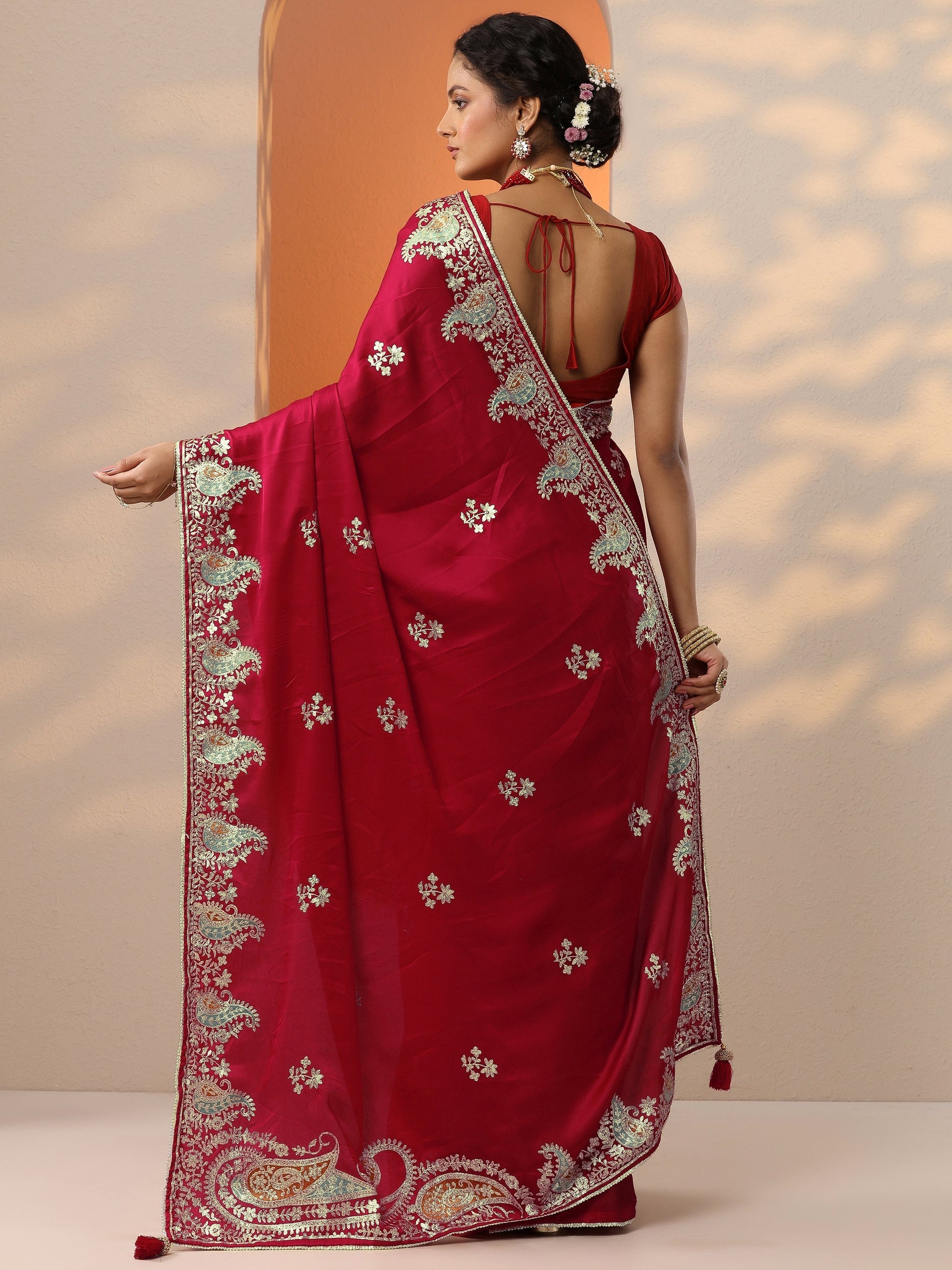 Red Embroidered Satin Saree With Unstitched Blouse Piece