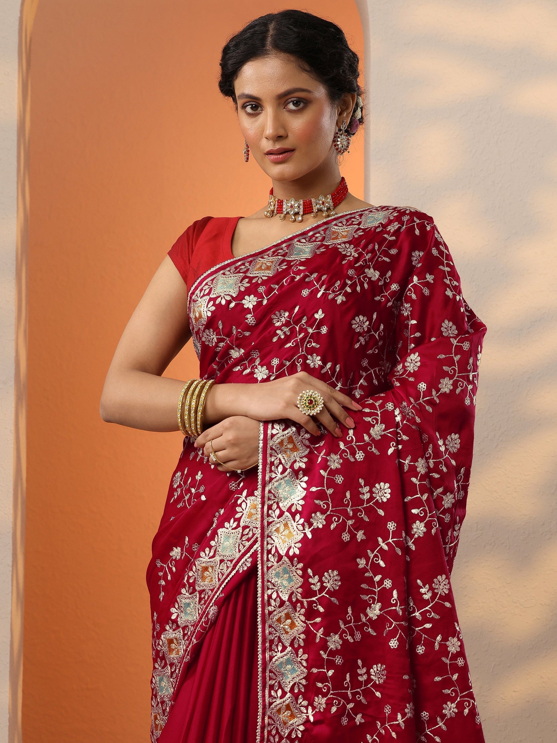 Our red printed satin saree features captivating floral embroidery. Complemented with a stitched blouse. This charming saree is perfect for festive occasions.