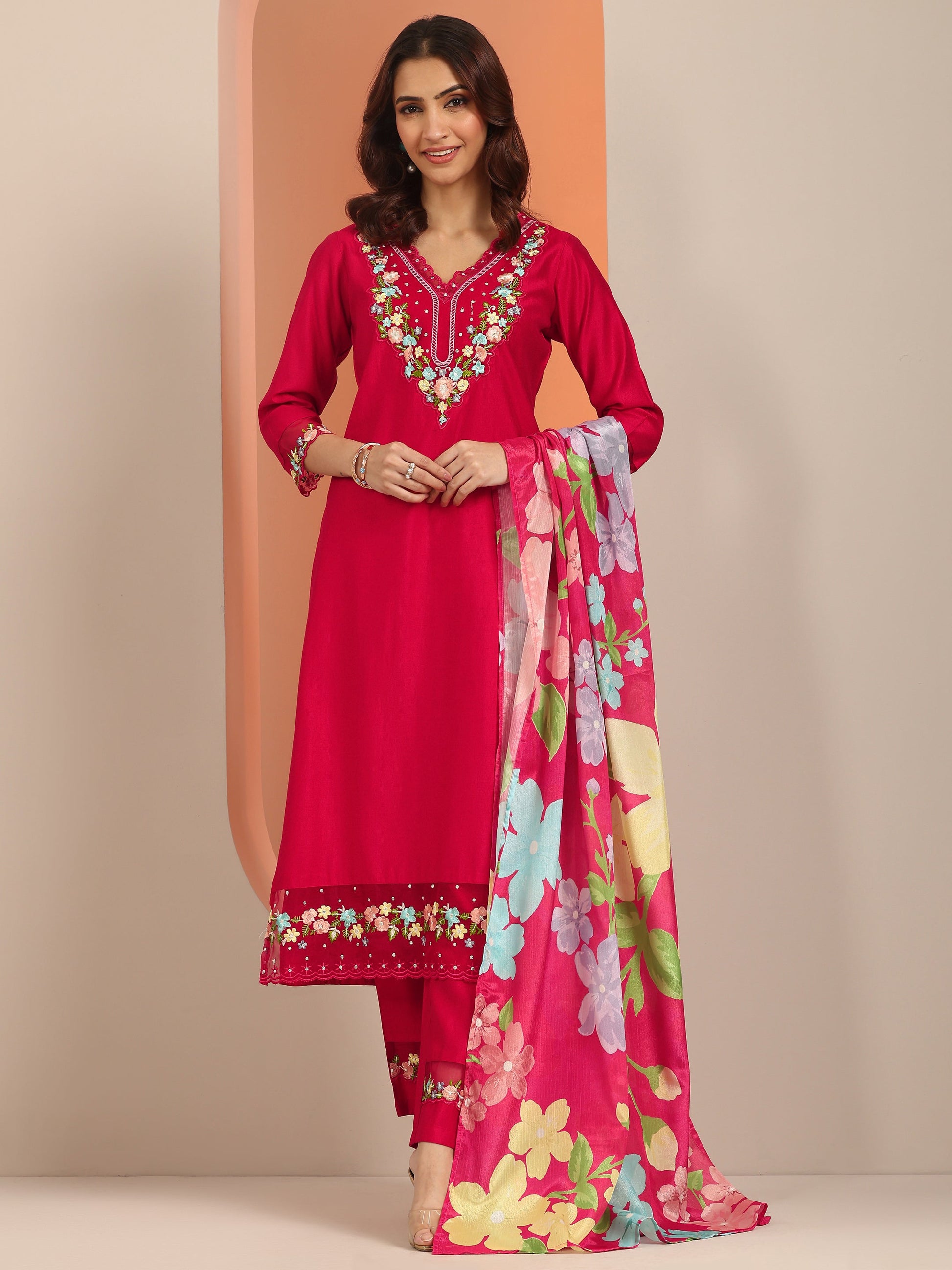 Red Embroidered Silk Blend Straight Suit Set With Dupatta