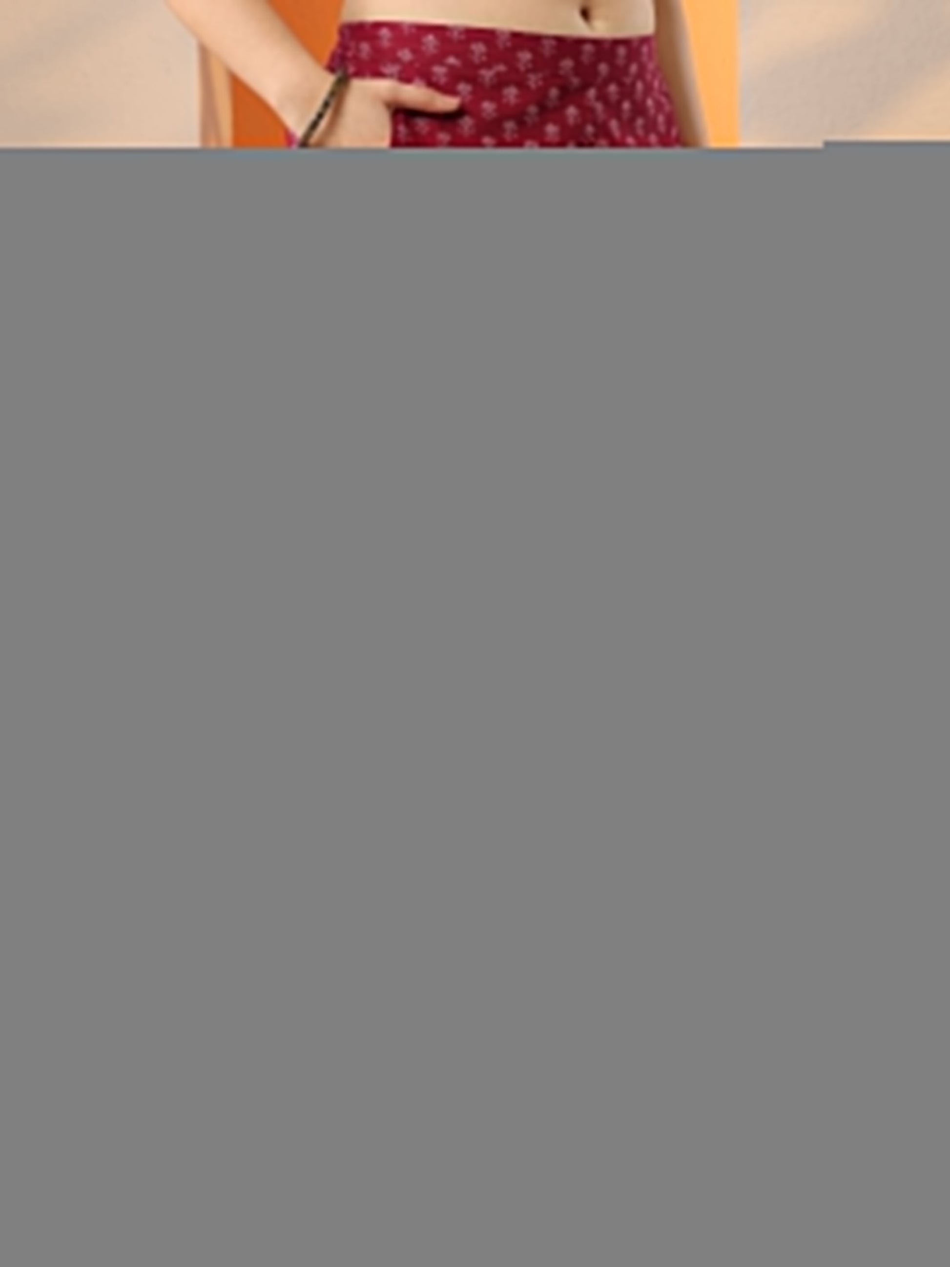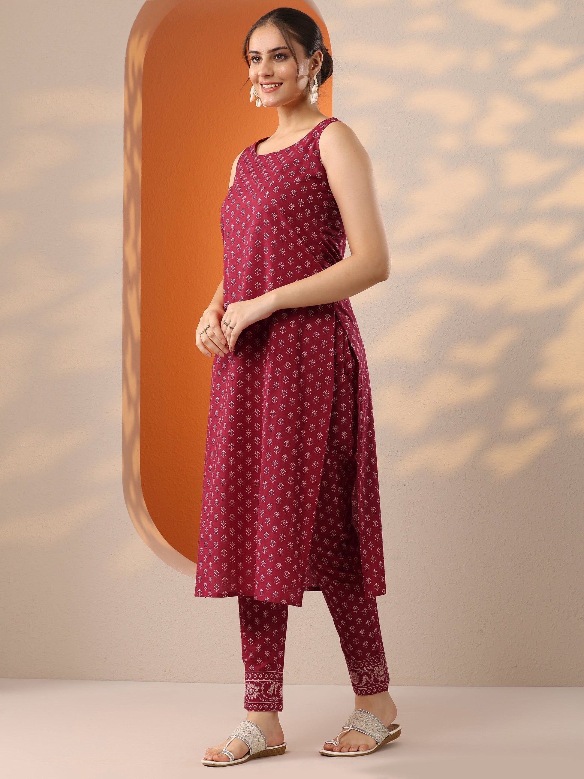 Our 2-piece maroon cotton Anarkali features a round neckline, regular sleeves, and a statement yoke. Complemented with straight pants with a partially elasticated waistband and 2 pockets. Adorned with floral prints, this style is perfect for dark festive occasions.