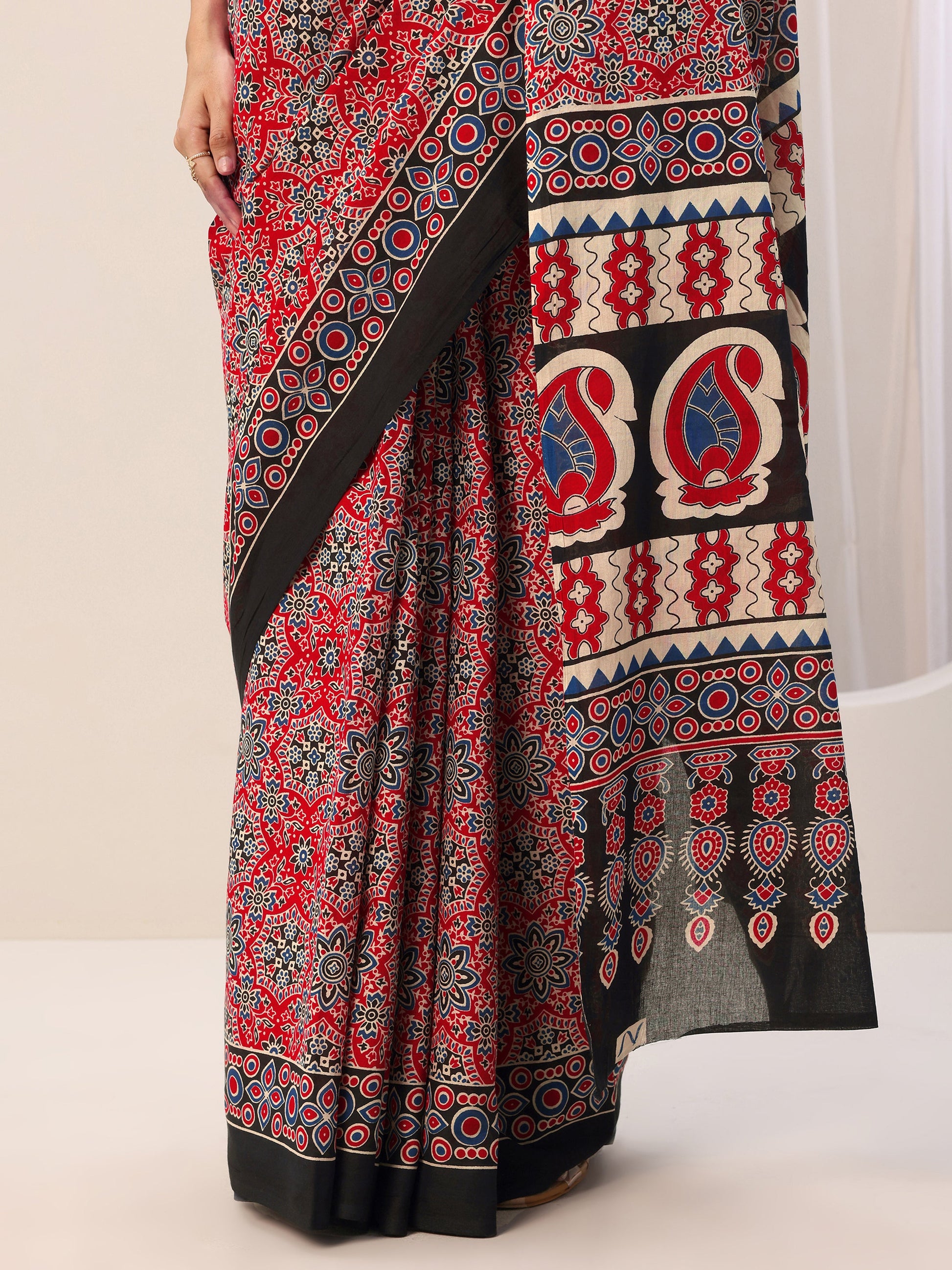 Our red printed cotton saree features captivating Ajrakh print. Complemented with a unstitched blouse. This charming saree is perfect for casual occasions.