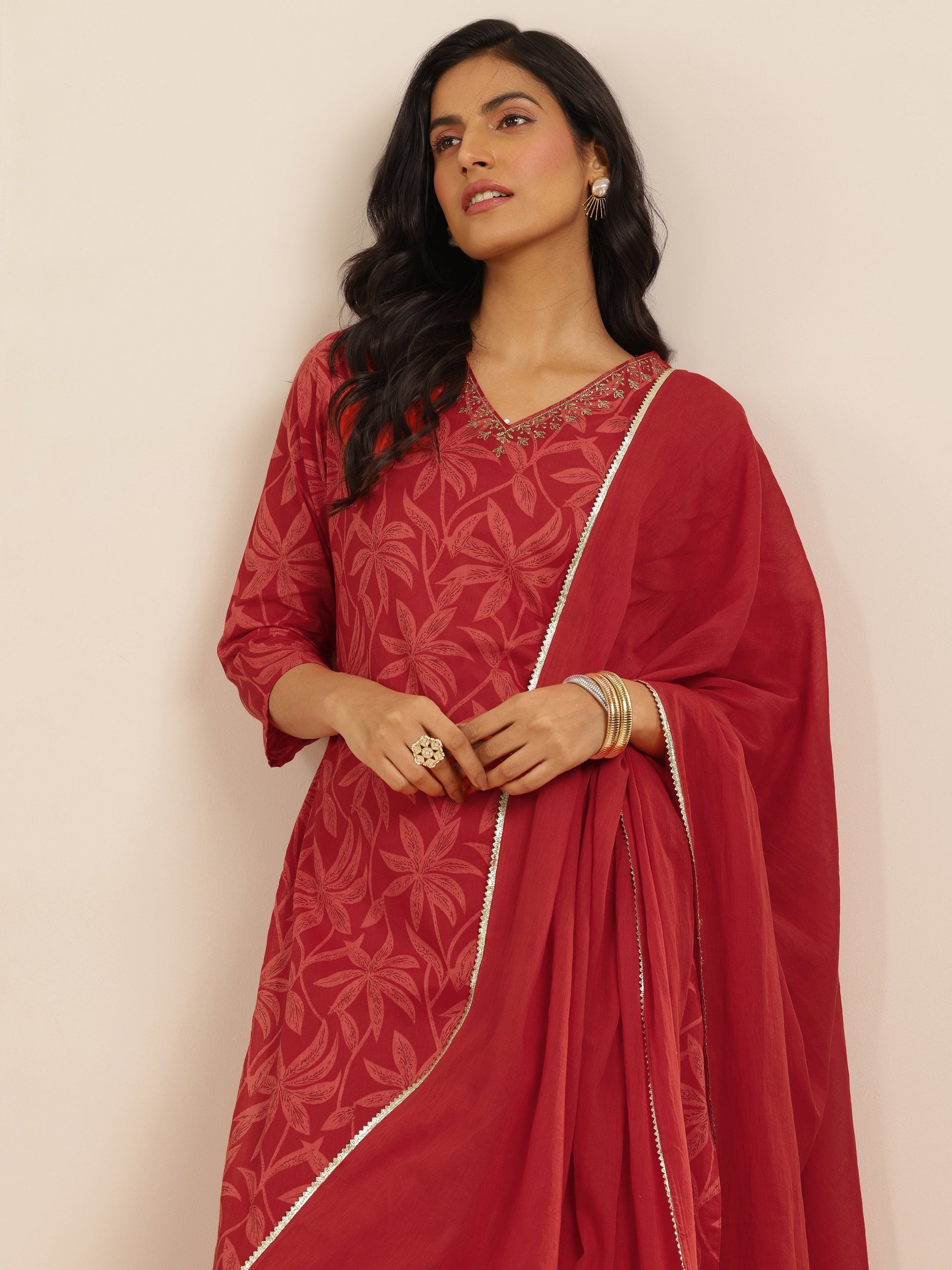 Our 3-piece Red Cotton Straight-fit Kurta Set features a Round Neckline, Regular Sleeves, and a statement yoke. Complemented with Straight Pants with a Partially Elasticated waistband and 2 pockets, and a Solid dupatta. Adorned with Floral Printed accents, this style is perfect for Casual Wear.