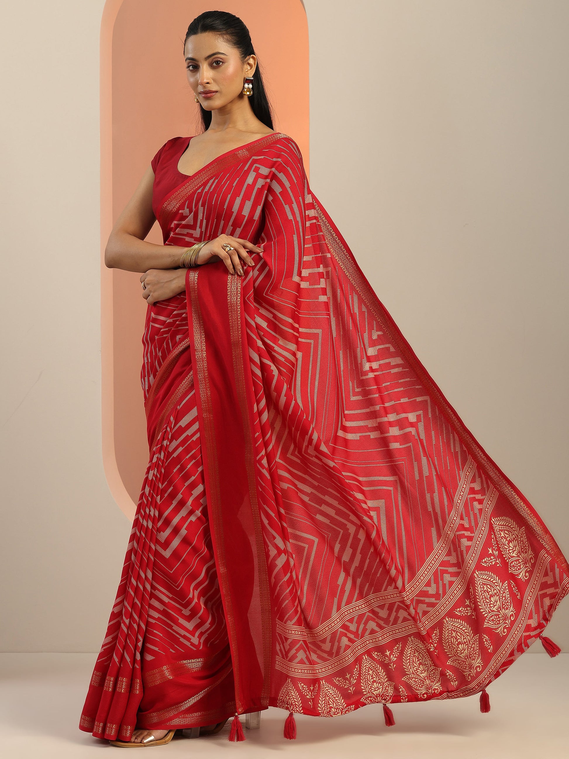 Our Red Printed Georgette Saree Features Captivating Woven Design. Complemented With A Unstitched Blouse Piece. This Charming Saree Is Perfect For Festive Wear.