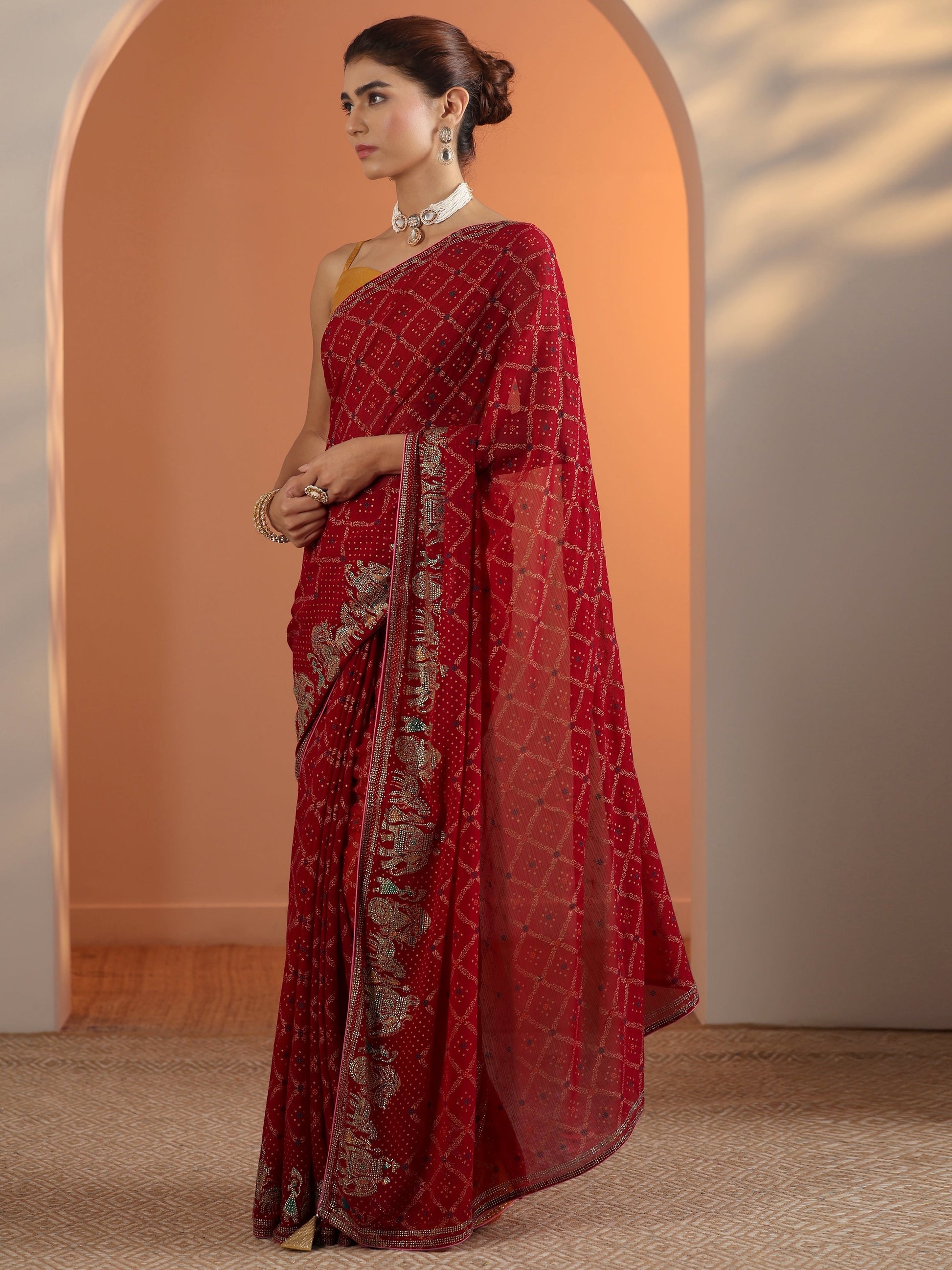 Our Red Printed Georgette Saree. Complemented With A Unstitched Blouse Piece. This Charming Saree Is Perfect For Festive Wear